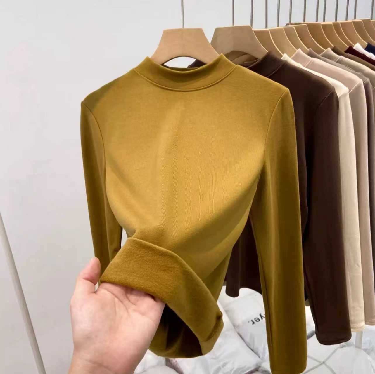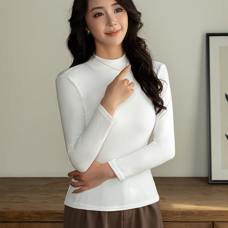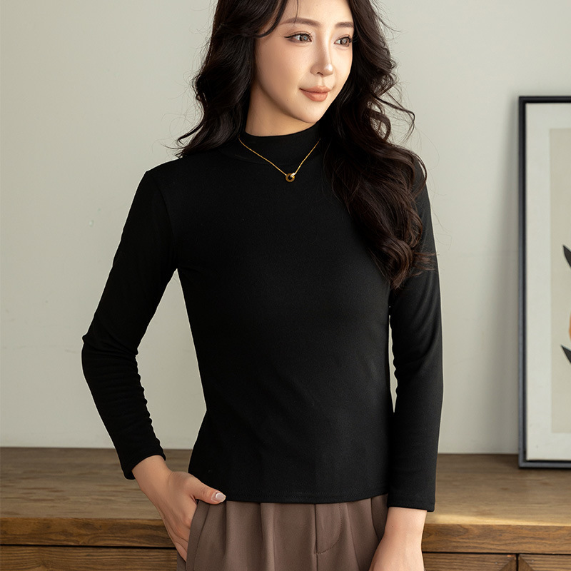 가을과 겨울 긴 소매 중간 목 솔리드 컬러 슬림베이스 셔츠를위한 기모 착용 여성용 반 높은 목 양털베이스 셔츠