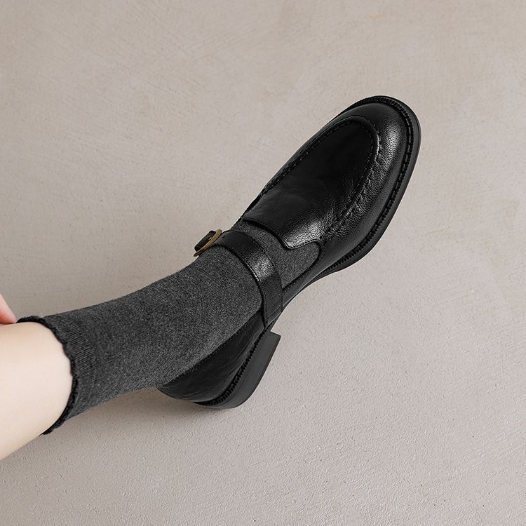 2025 봄 새로운 레트로 양가죽 미들 힐 아카데미 스타일 작은 가죽 신발 한 단어 버클 벨트 두꺼운 힐 싱글 레이어 신발 패션 여성 신발