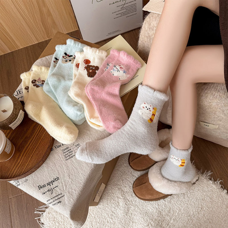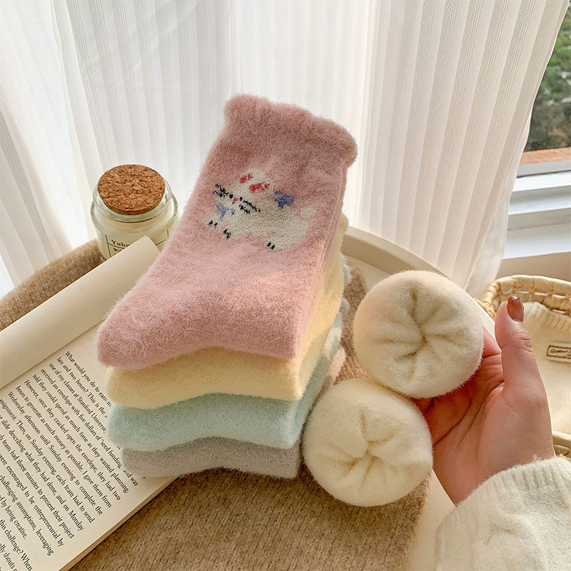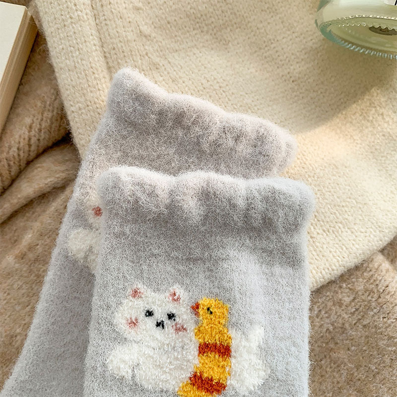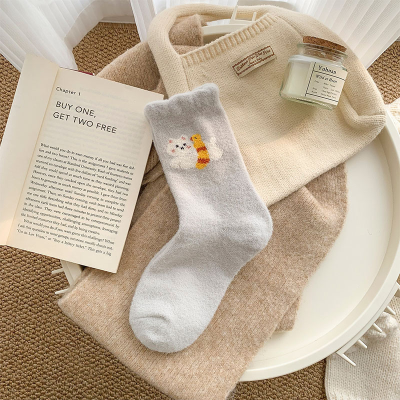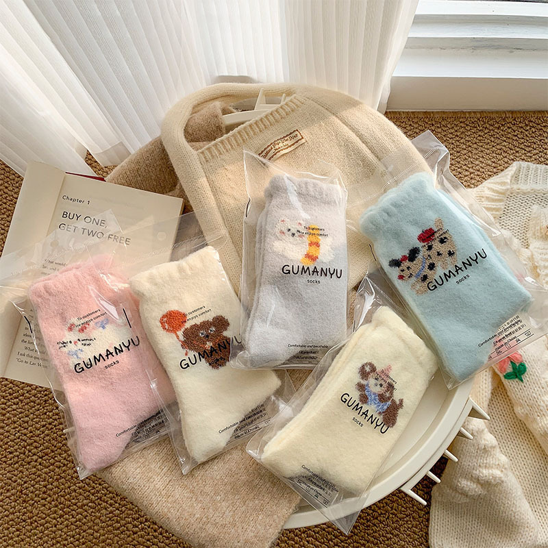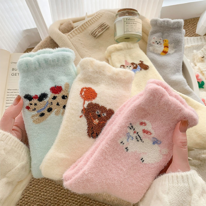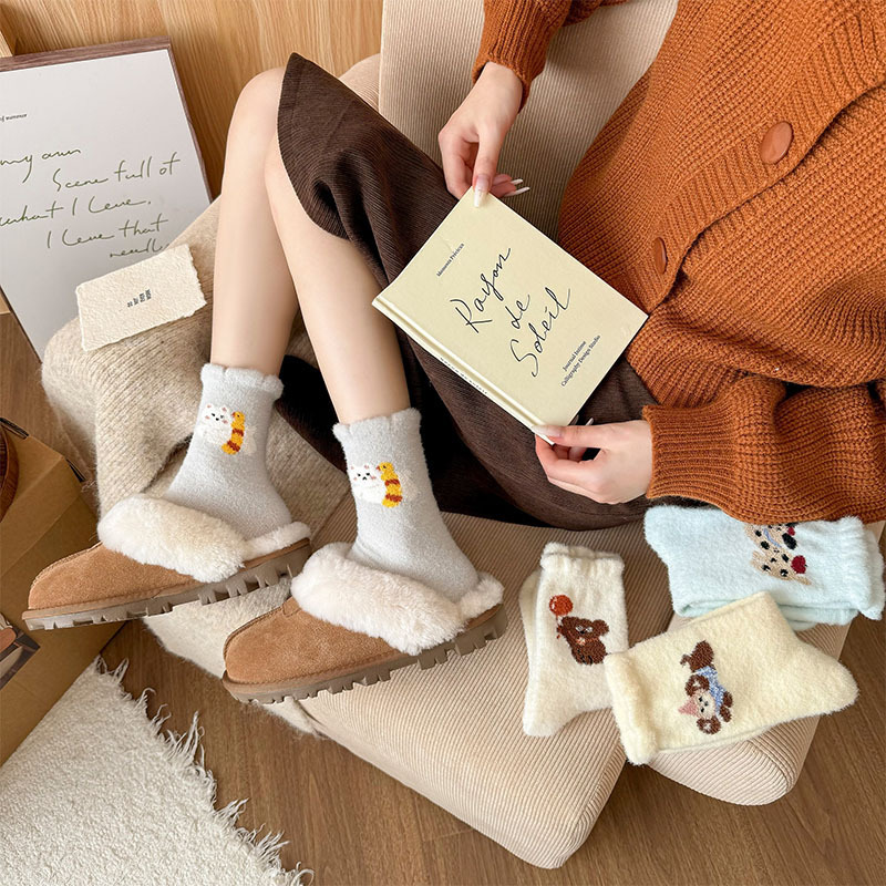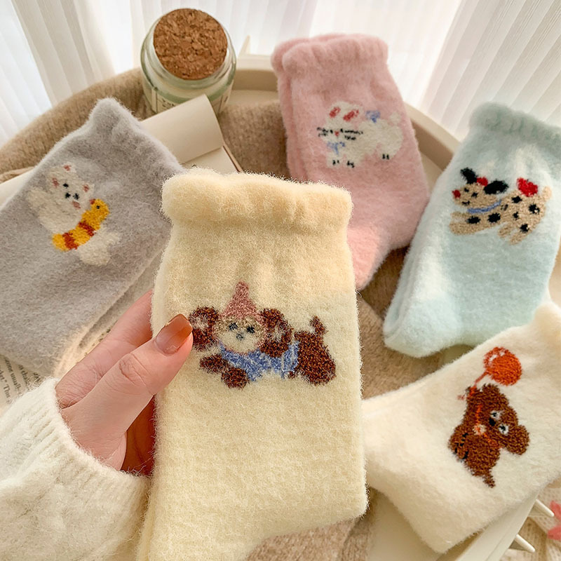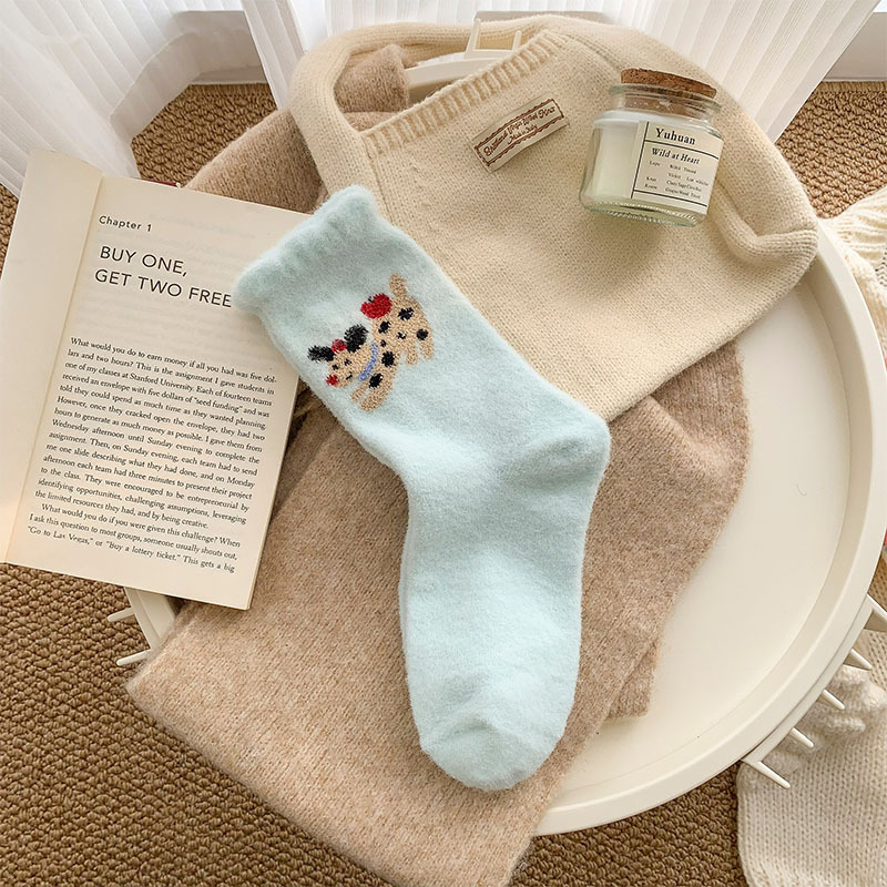 귀여운 만화 강아지 양말 여성의 가을과 겨울 기모 두꺼운 따뜻한 중간 양말 홈 수면 호주 벨벳 달 양말스토어 가기