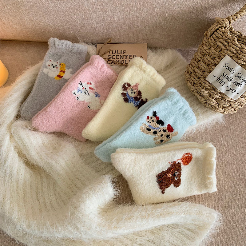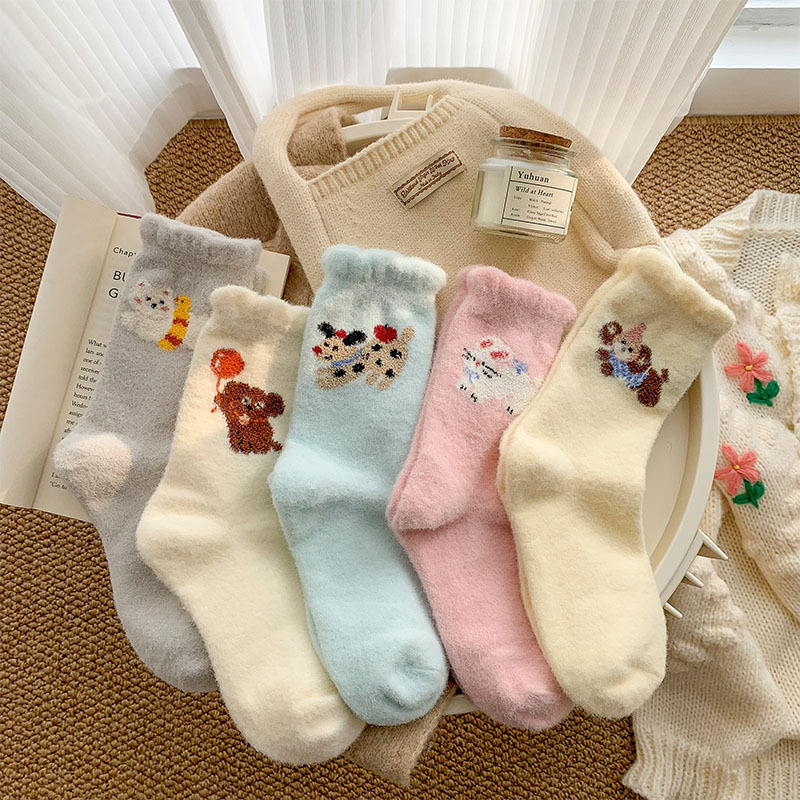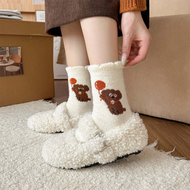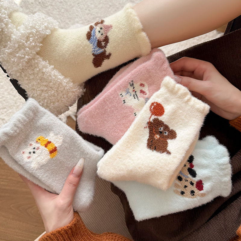 귀여운 만화 강아지 양말 여성의 가을과 겨울 기모 두꺼운 따뜻한 중간 양말 홈 수면 호주 벨벳 달 양말