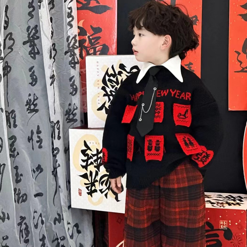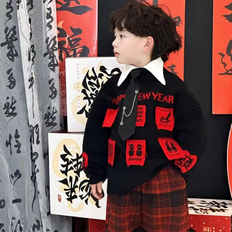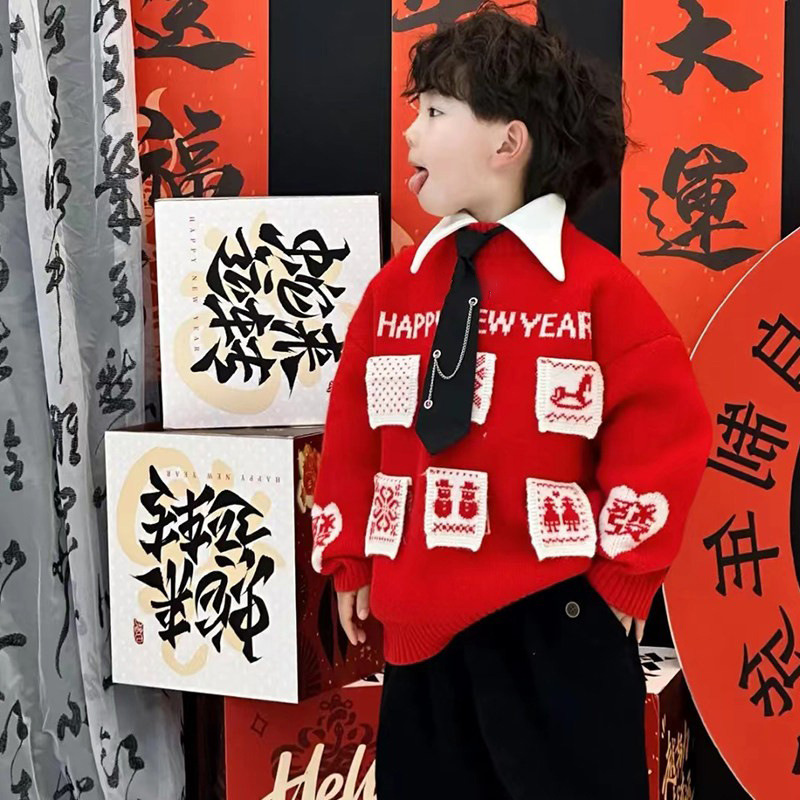 겨울 어린이 한국식 설날 붉은 스웨터 소년 '2025 년 새해 전야 옷 중소 어린이 아기 니트 셔츠 탑스토어 가기