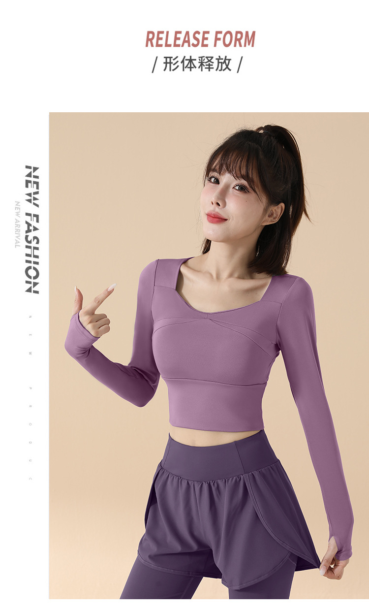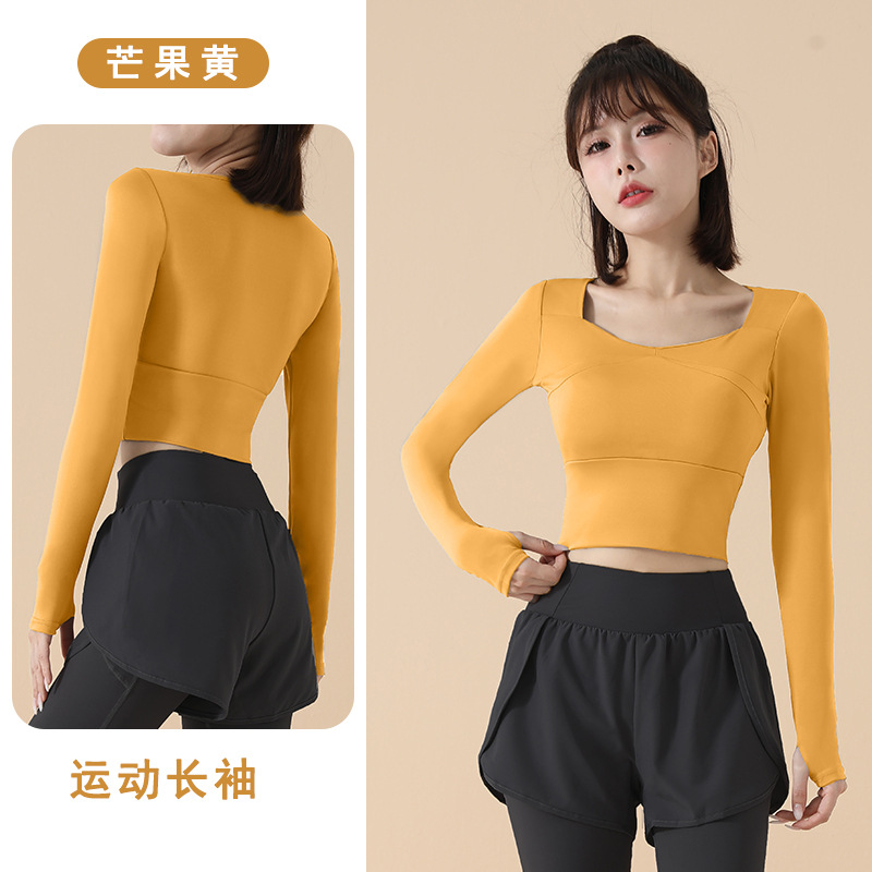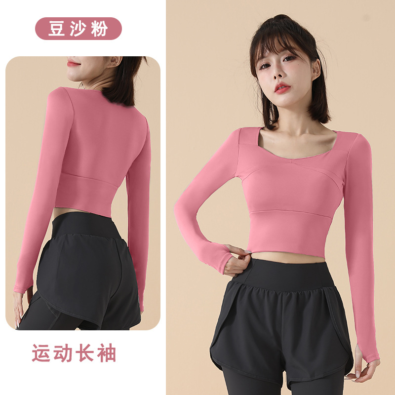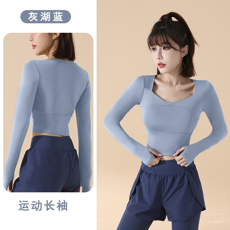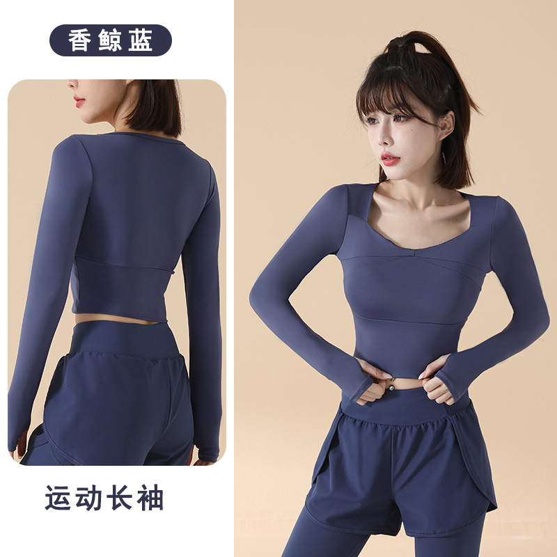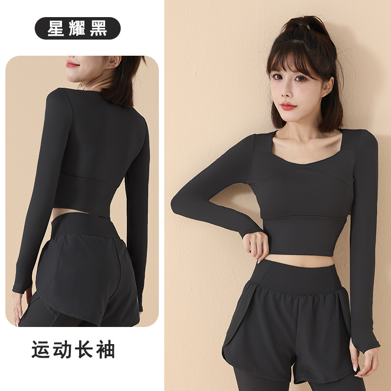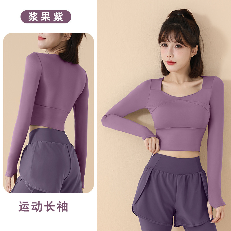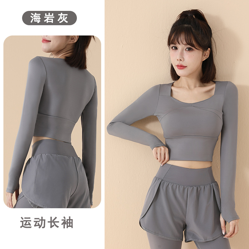 요가 의류 최고의 여성 봄 및 가을 새로운 스타일의 피트니스 의류 가슴 매트 긴 소매 필라테 훈련 짧은 달리기 운동복
