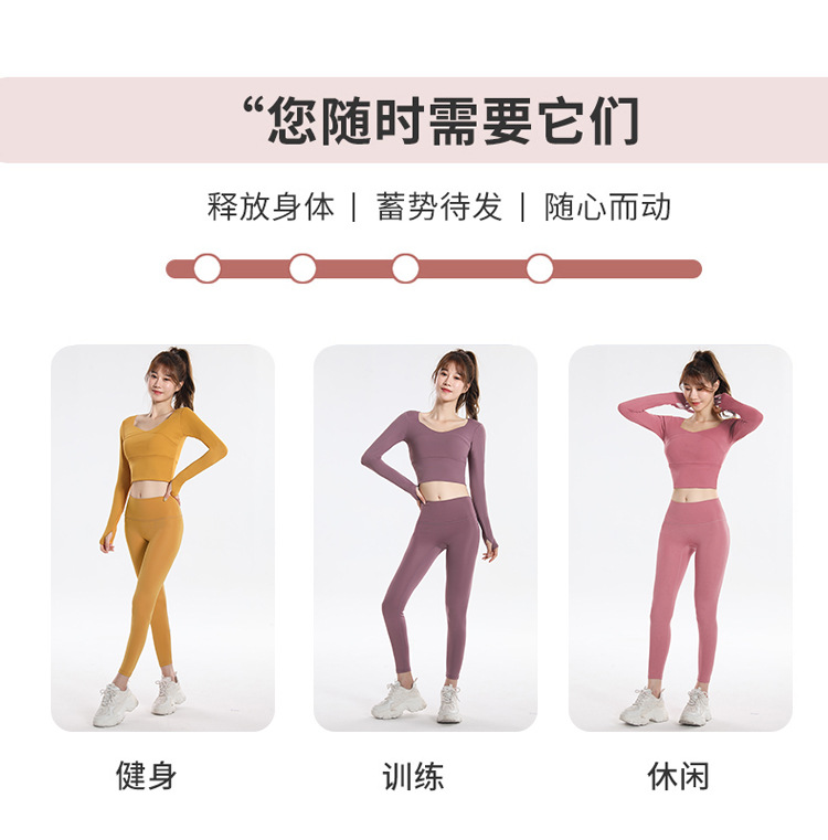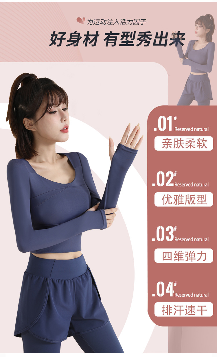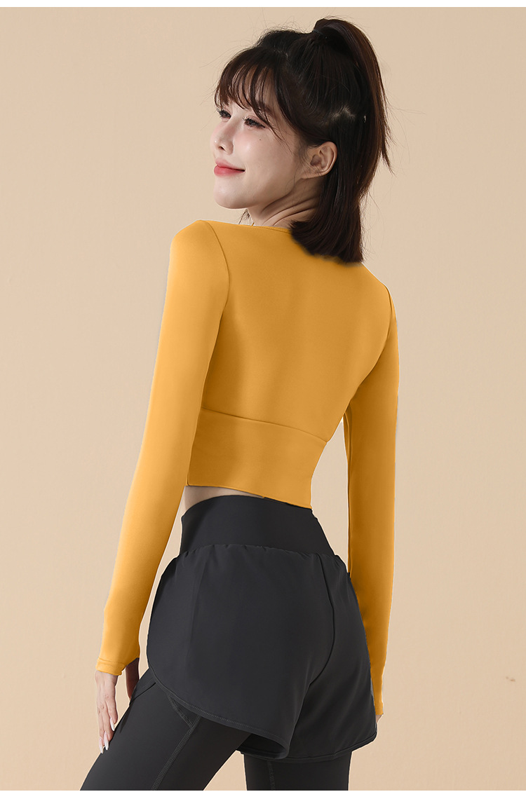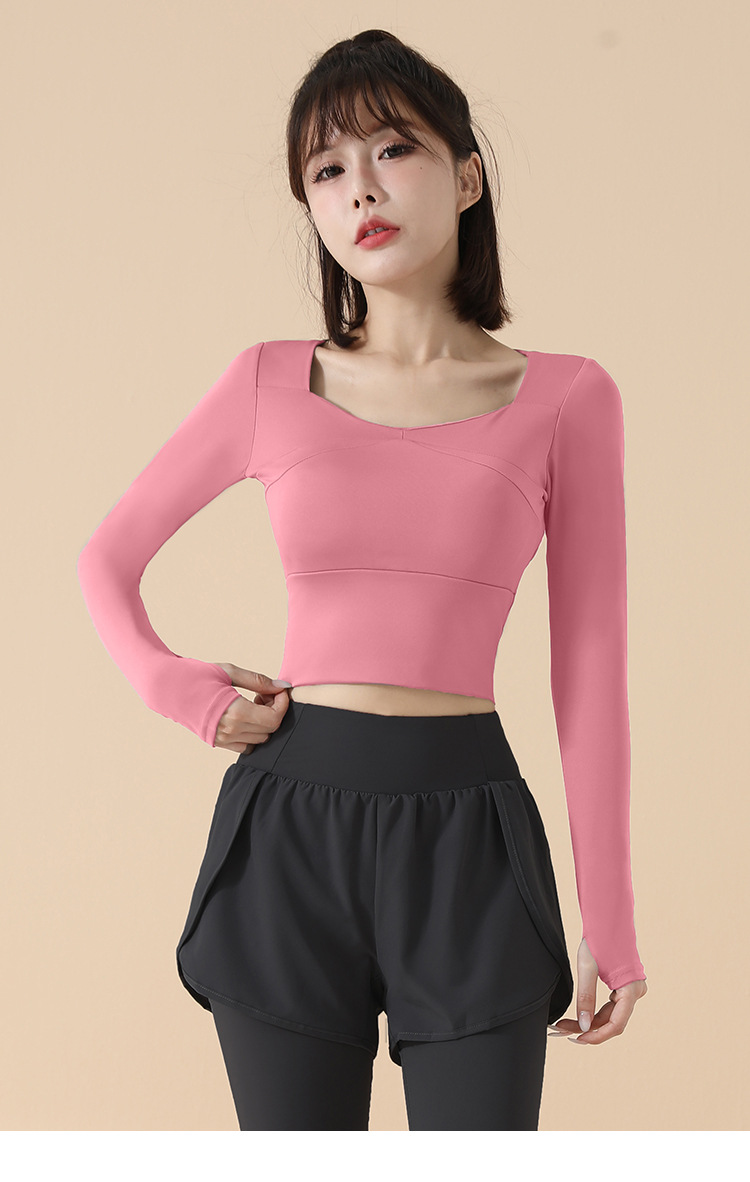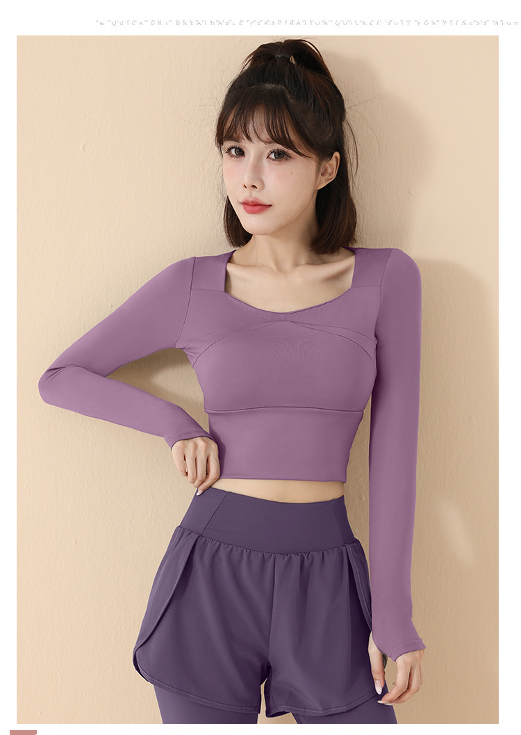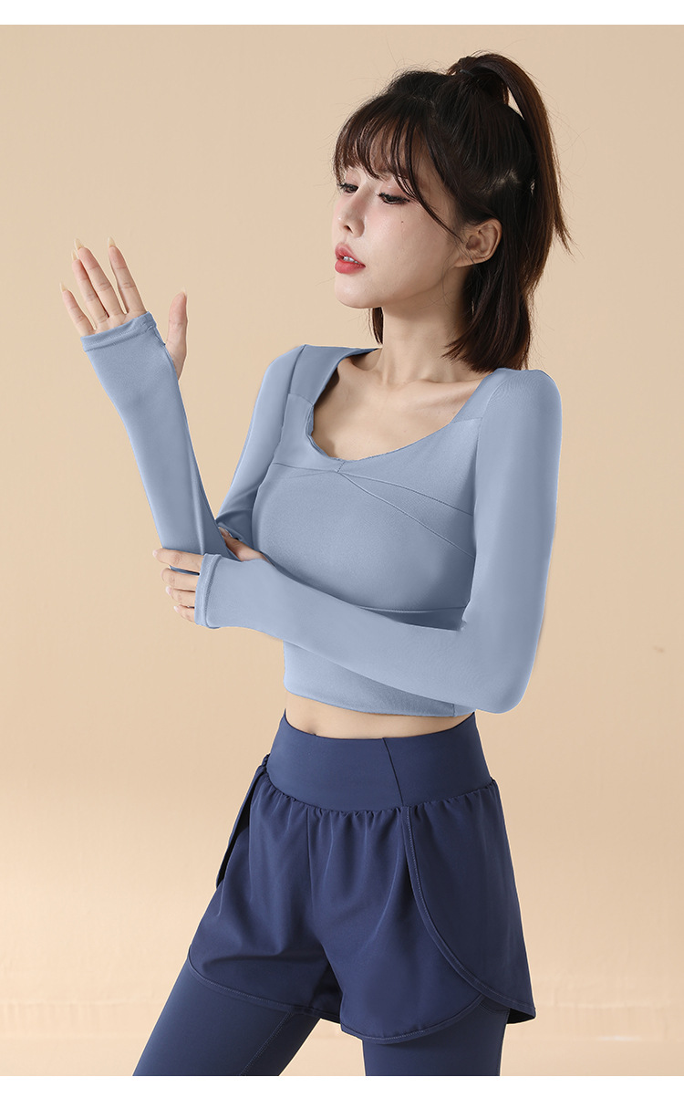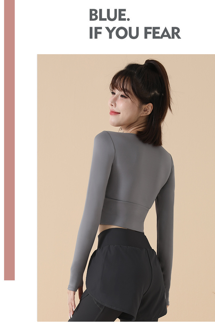 요가 의류 최고의 여성 봄 및 가을 새로운 스타일의 피트니스 의류 가슴 매트 긴 소매 필라테 훈련 짧은 달리기 운동복
