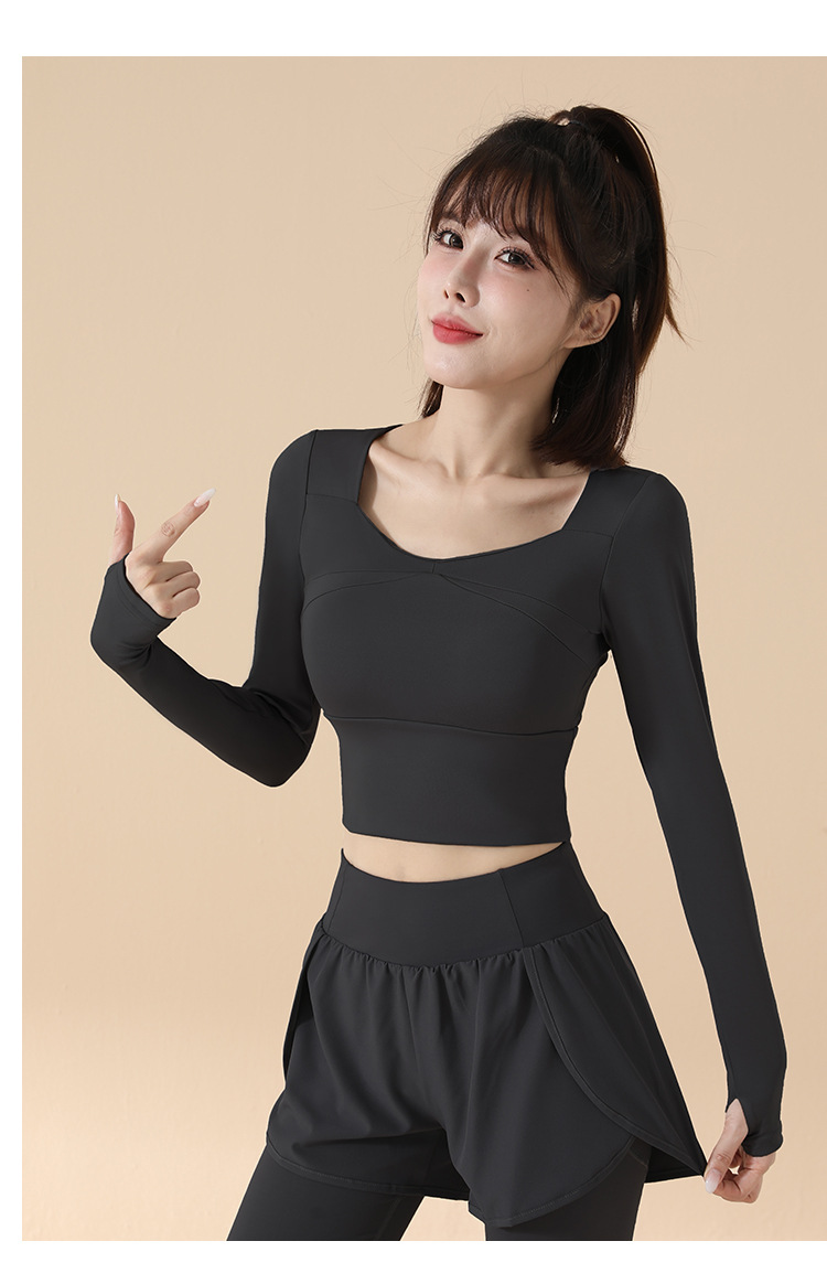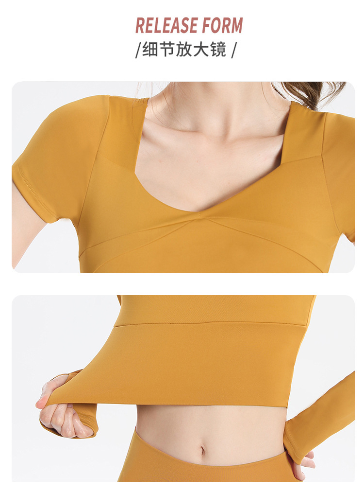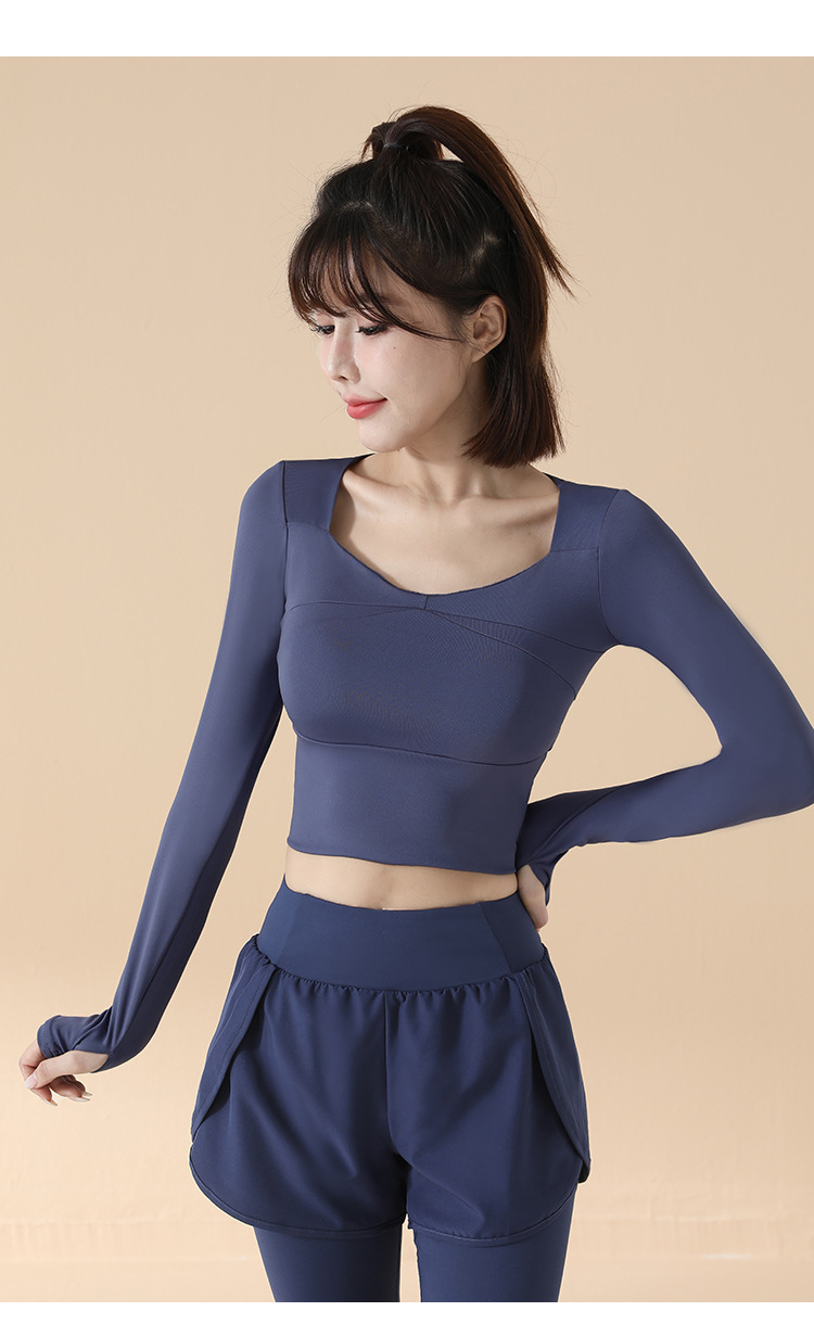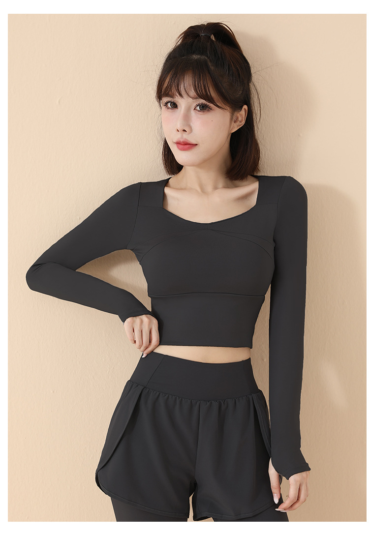 요가 의류 최고의 여성 봄 및 가을 새로운 스타일의 피트니스 의류 가슴 매트 긴 소매 필라테 훈련 짧은 달리기 운동복스토어 가기