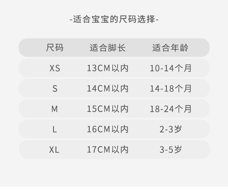 怎么选择合适的鞋码?:宝宝的脚需要留出一定的活动空间,建议按照宝宝净脚长加0.5cm左右选鞋码,如宝宝净脚长12.5cm,脚偏胖建议选大一码的(仅供参考)