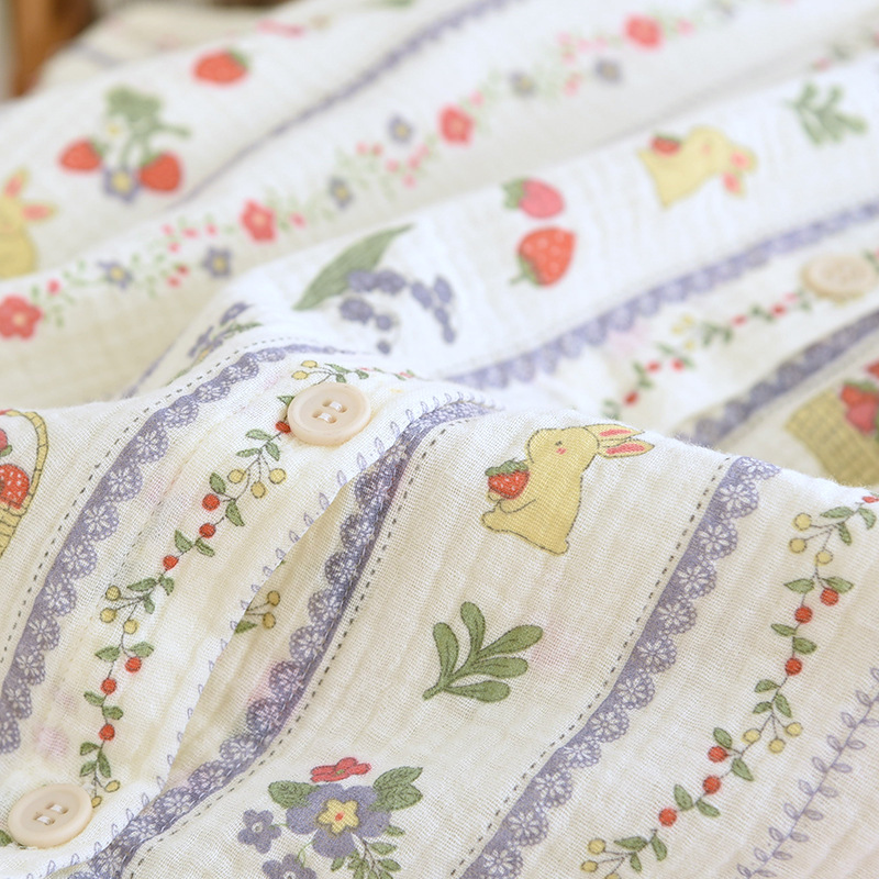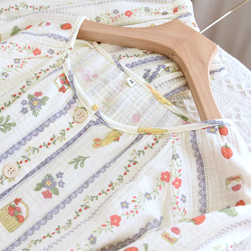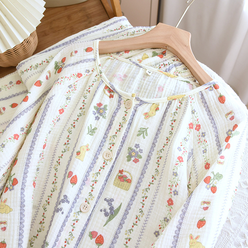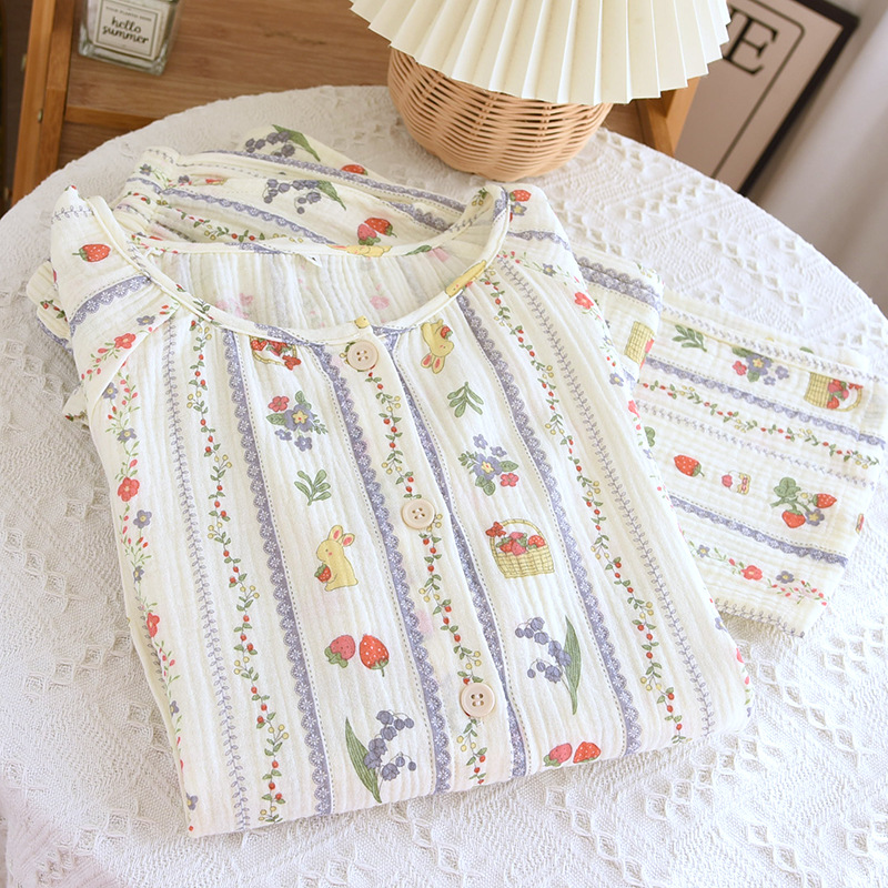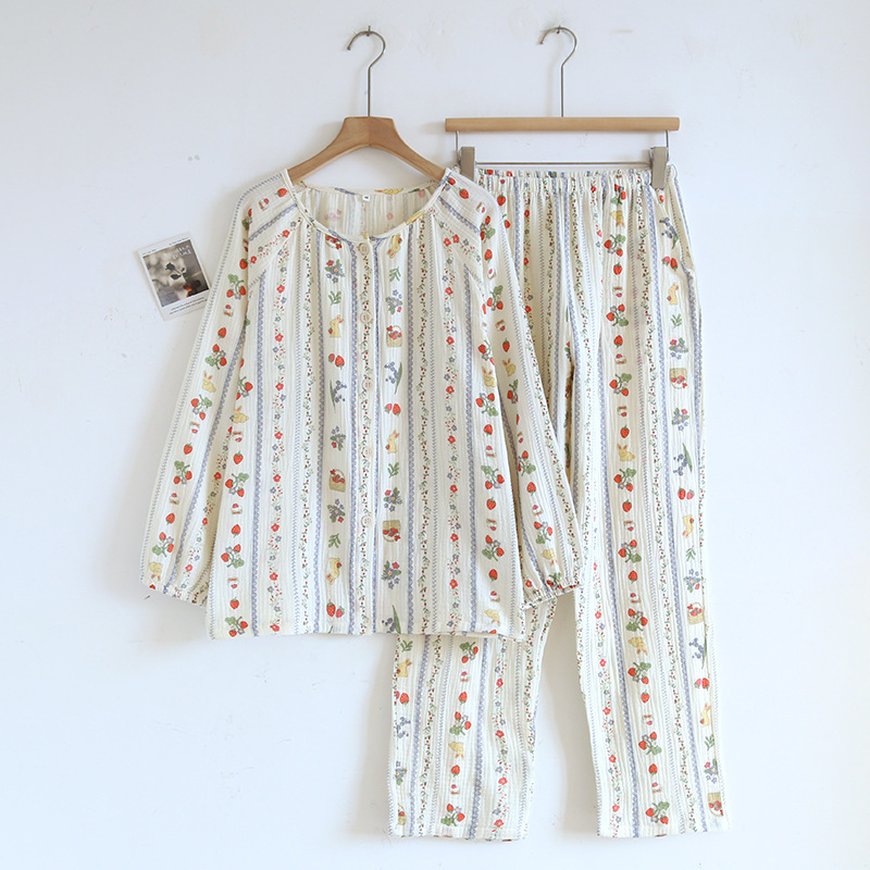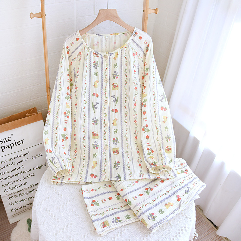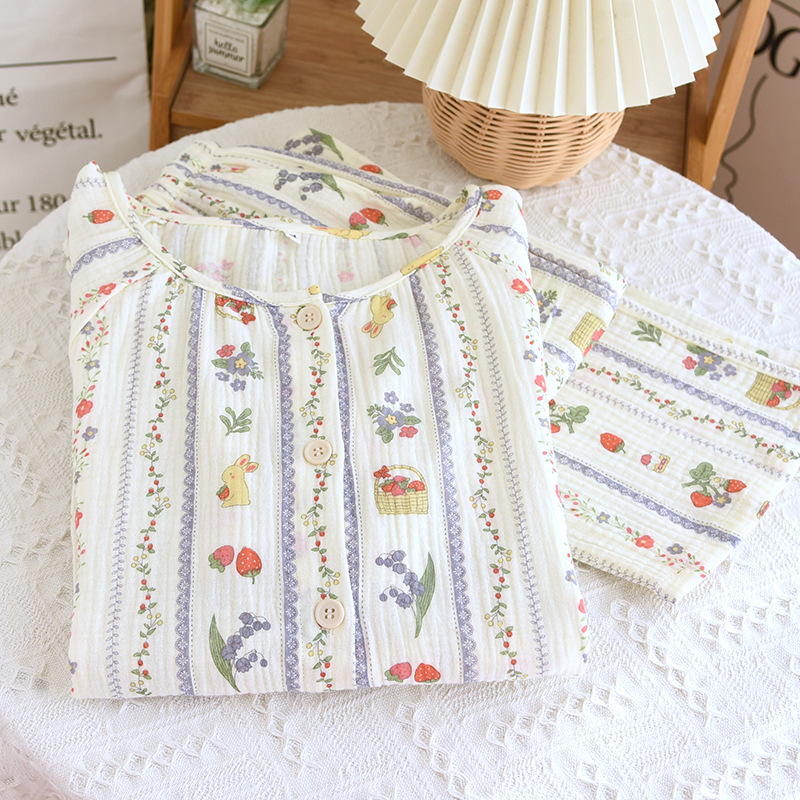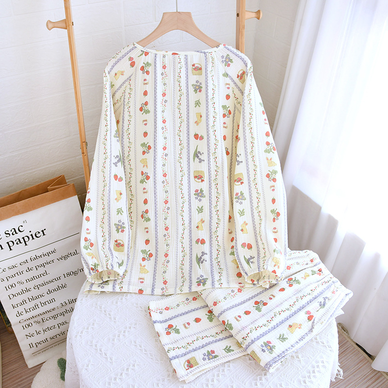 봄 여름 가을 파자마 여성 한국 스타일 신선한 간단한 만화 코튼 거즈 라운드 넥 만화 홈 옷 투피스 세트스토어 가기