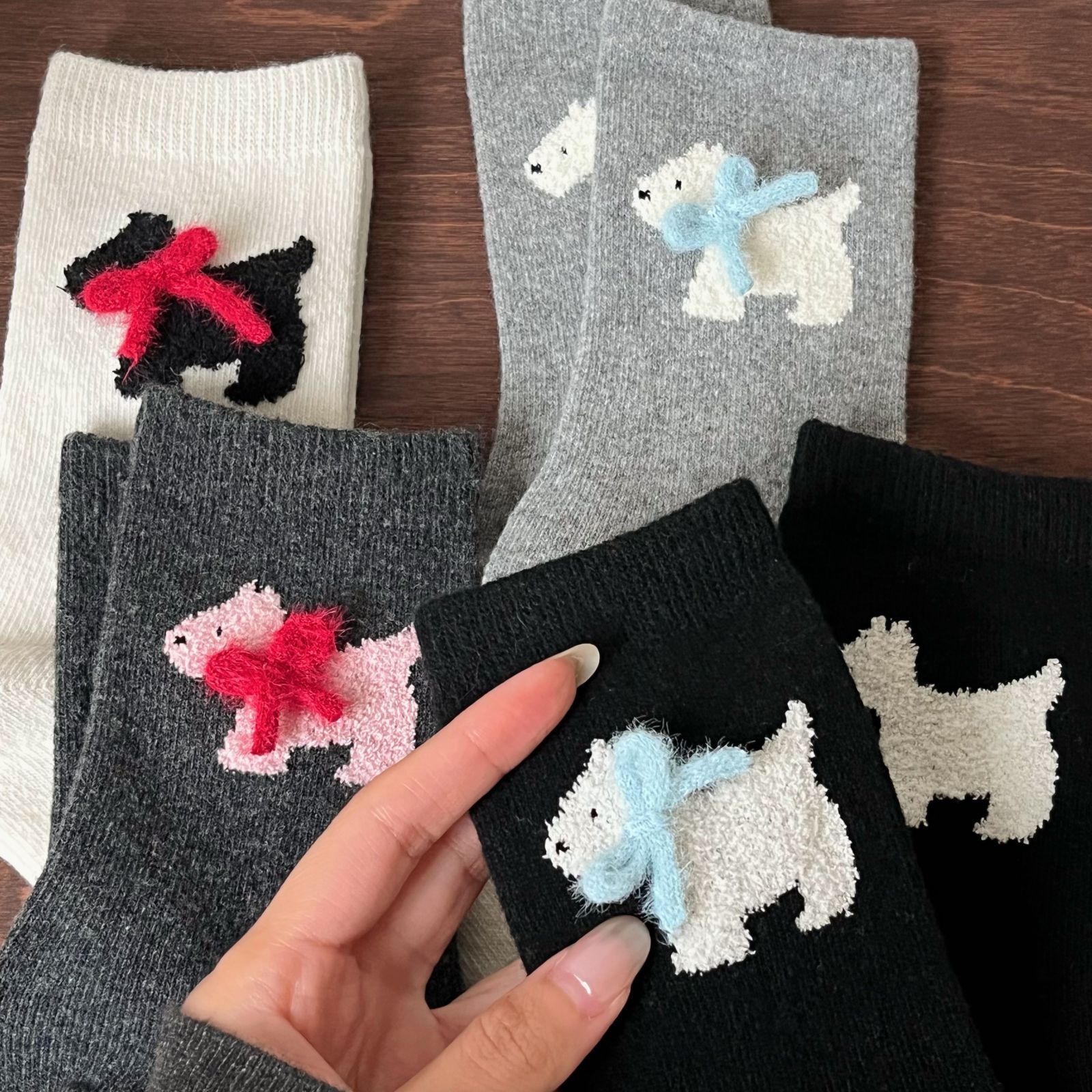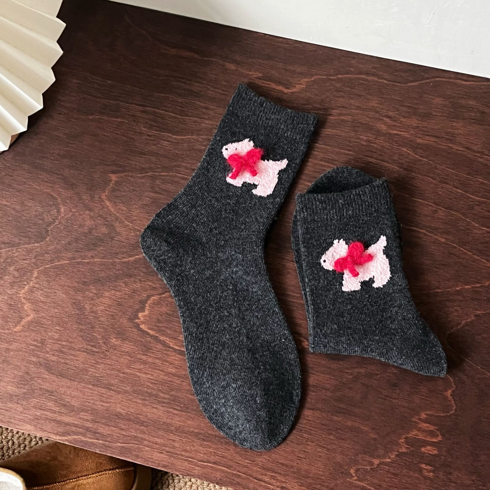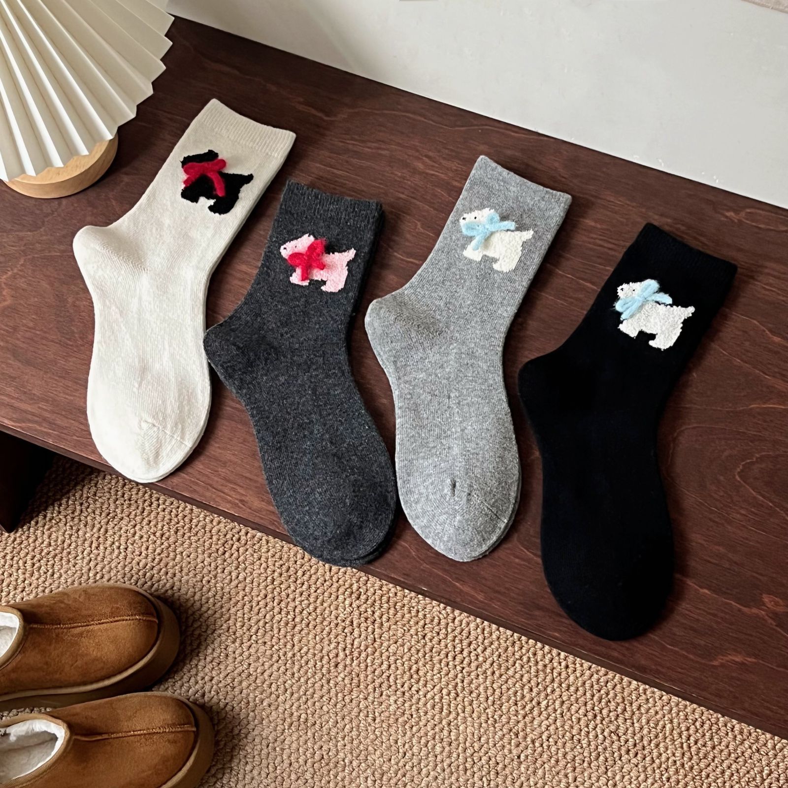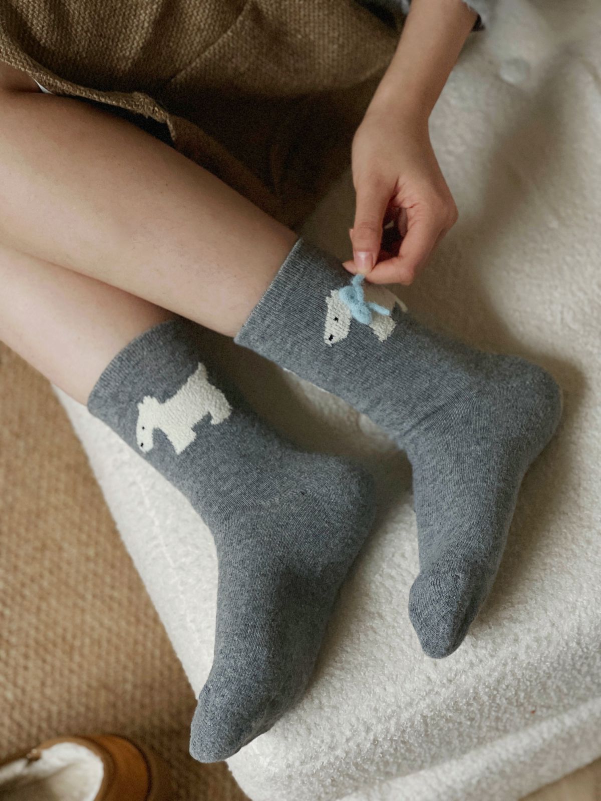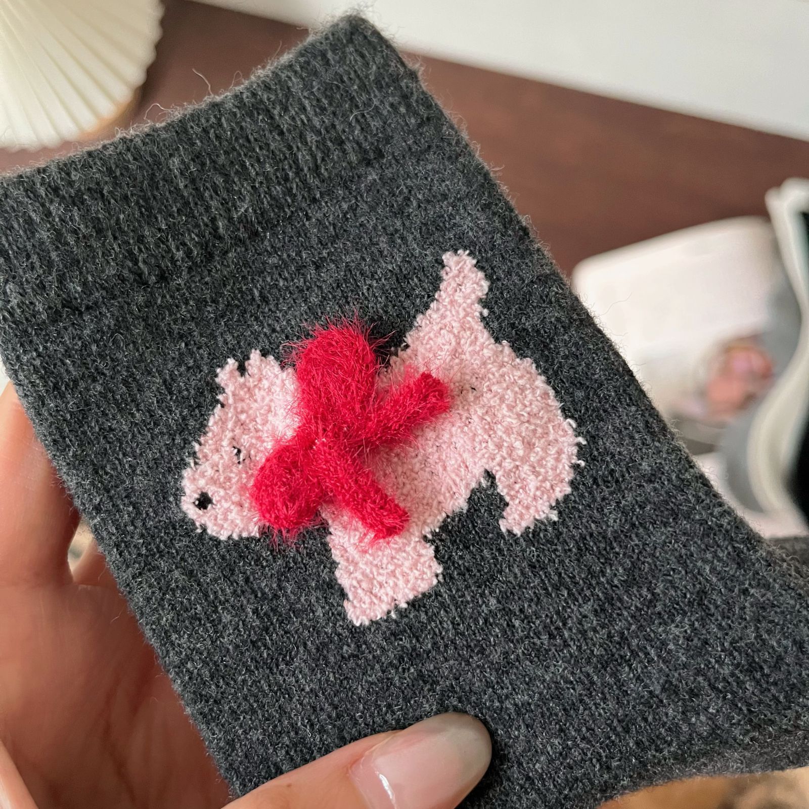 가을과 겨울 회색 양모 따뜻한 양말 한국 스타일 만화 강아지 3 차원 활 두꺼운 미드 튜브 양말