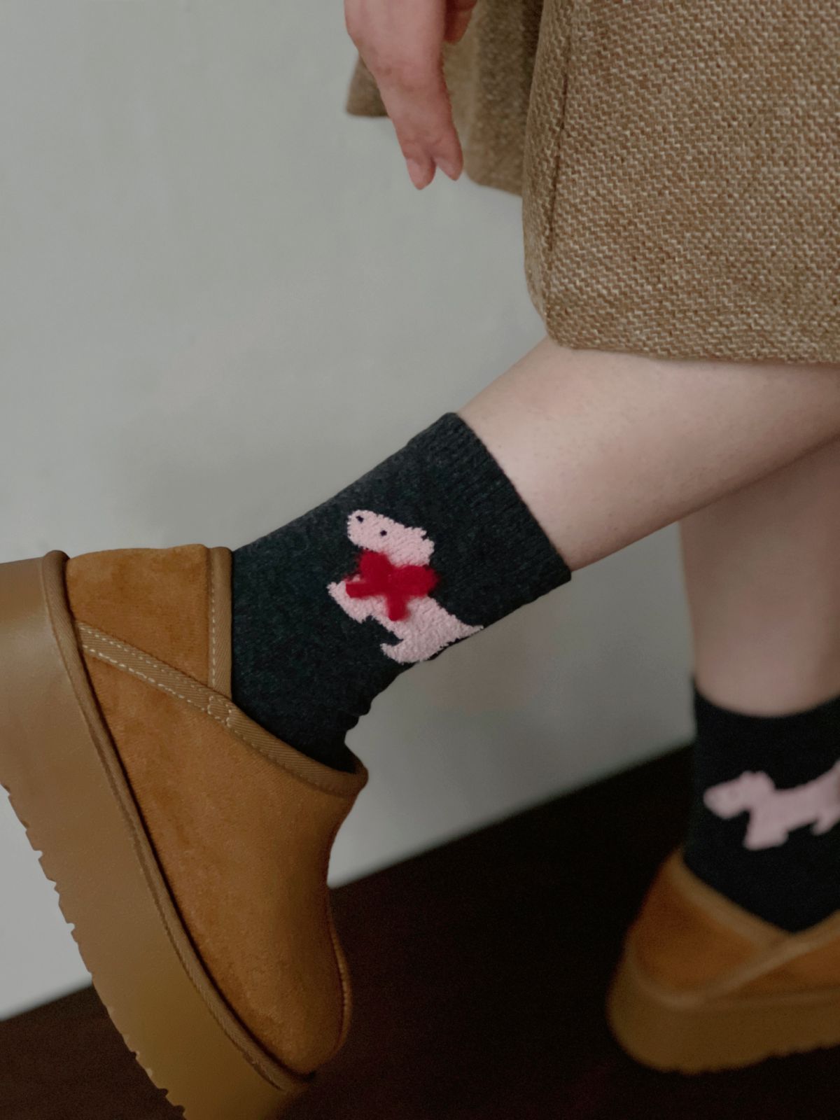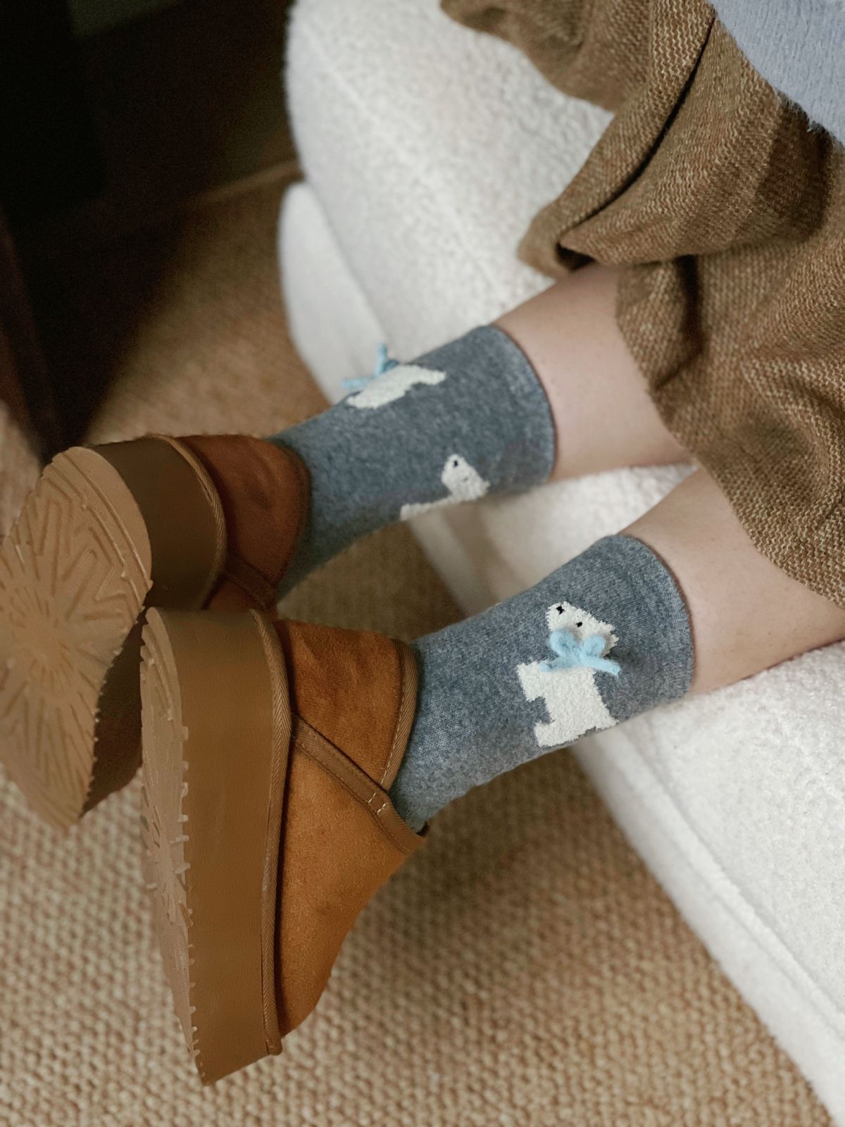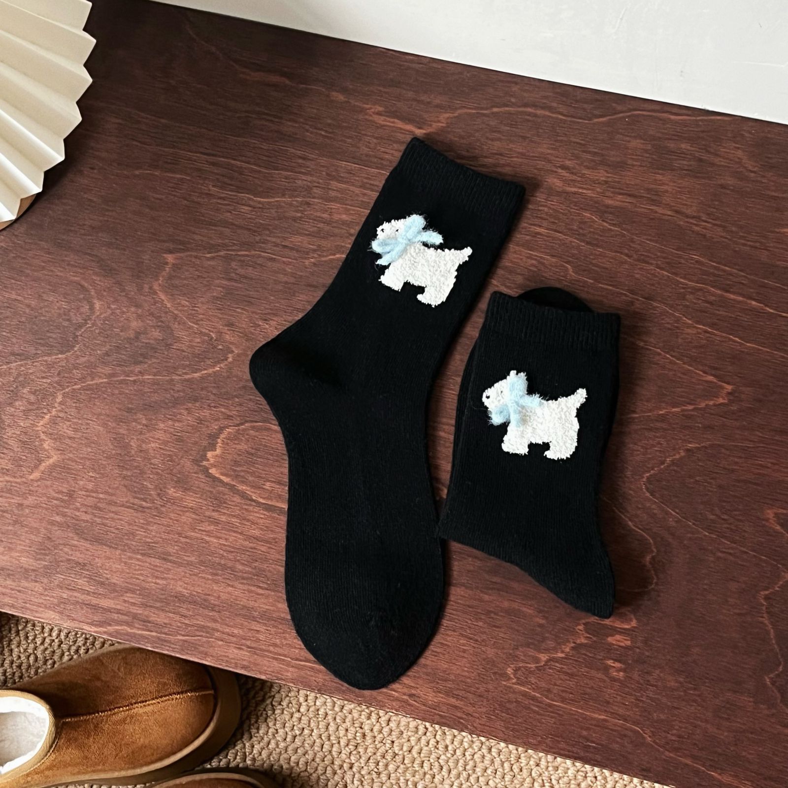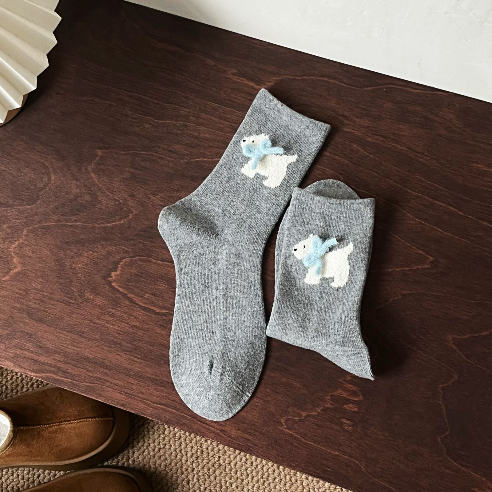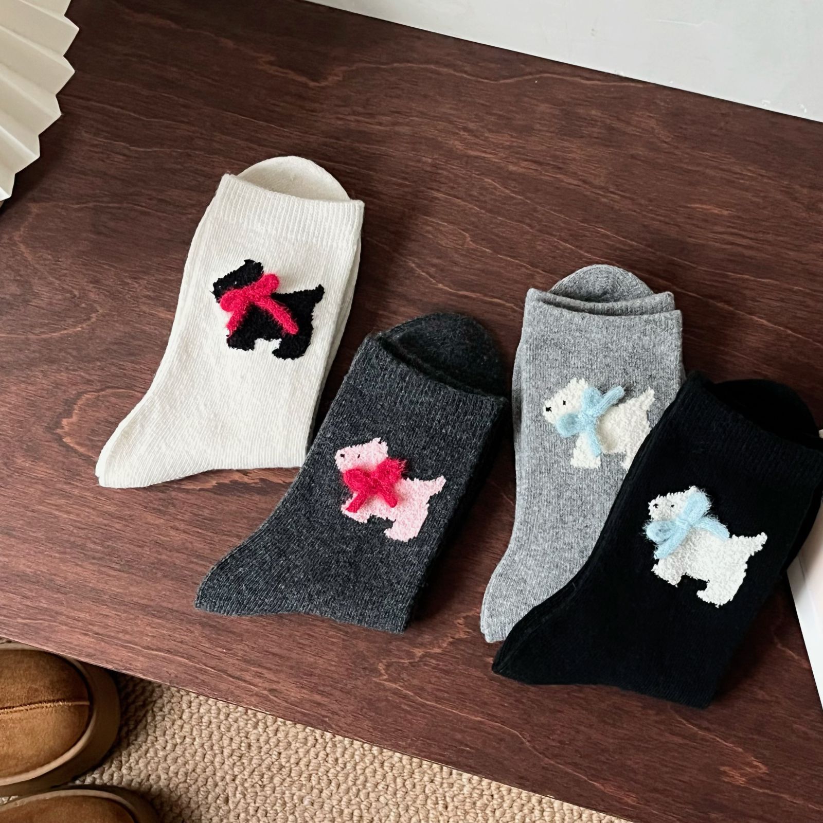 가을과 겨울 회색 양모 따뜻한 양말 한국 스타일 만화 강아지 3 차원 활 두꺼운 미드 튜브 양말