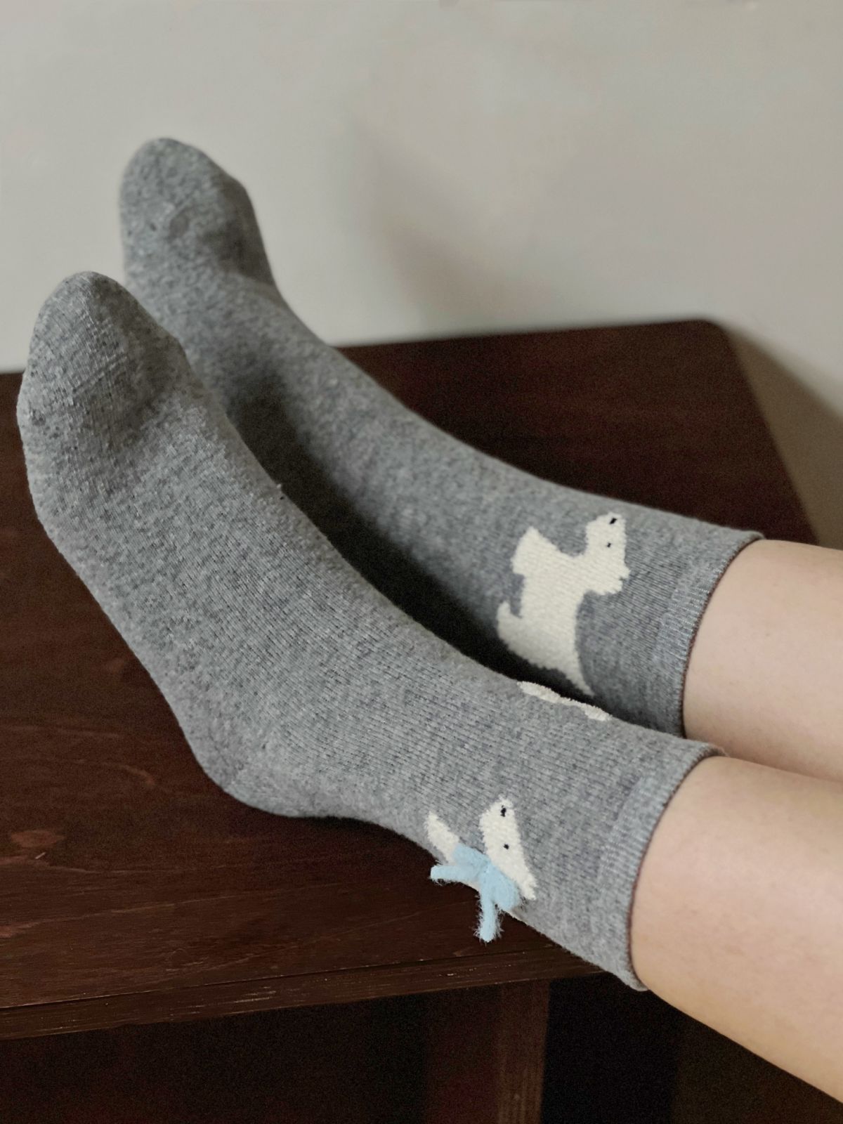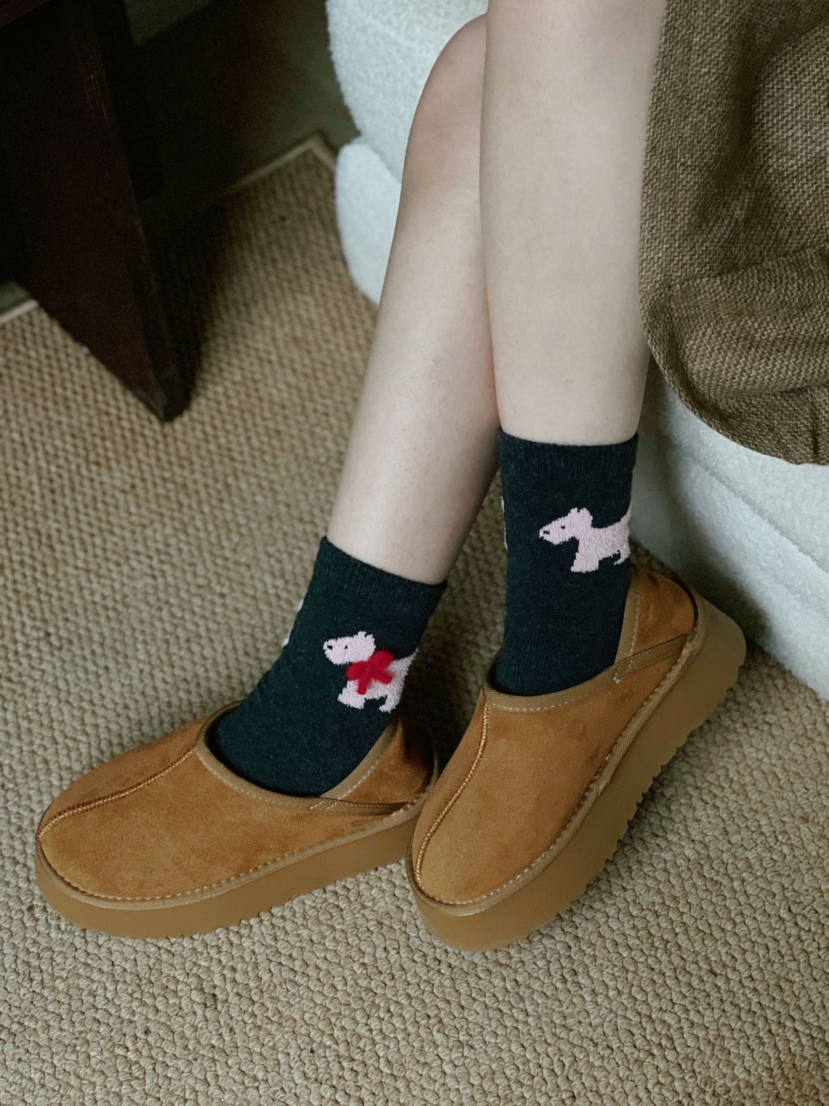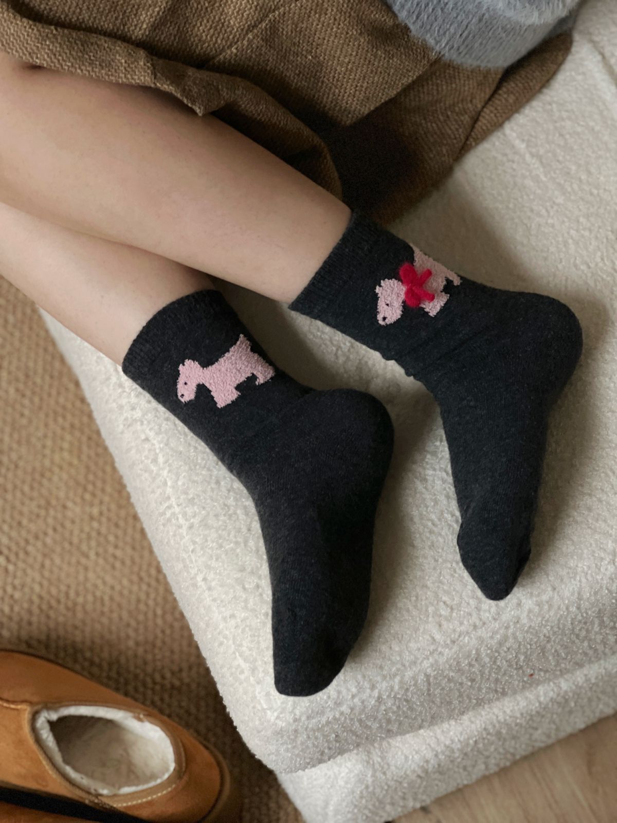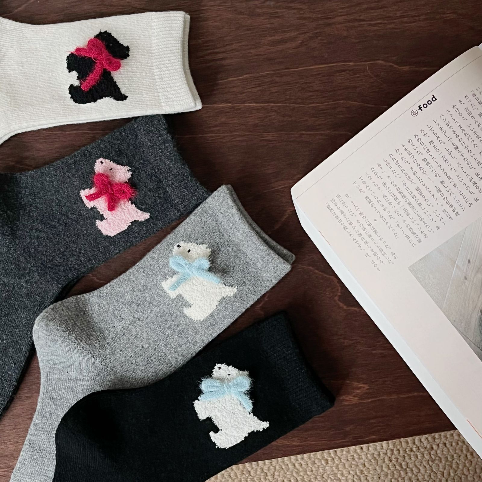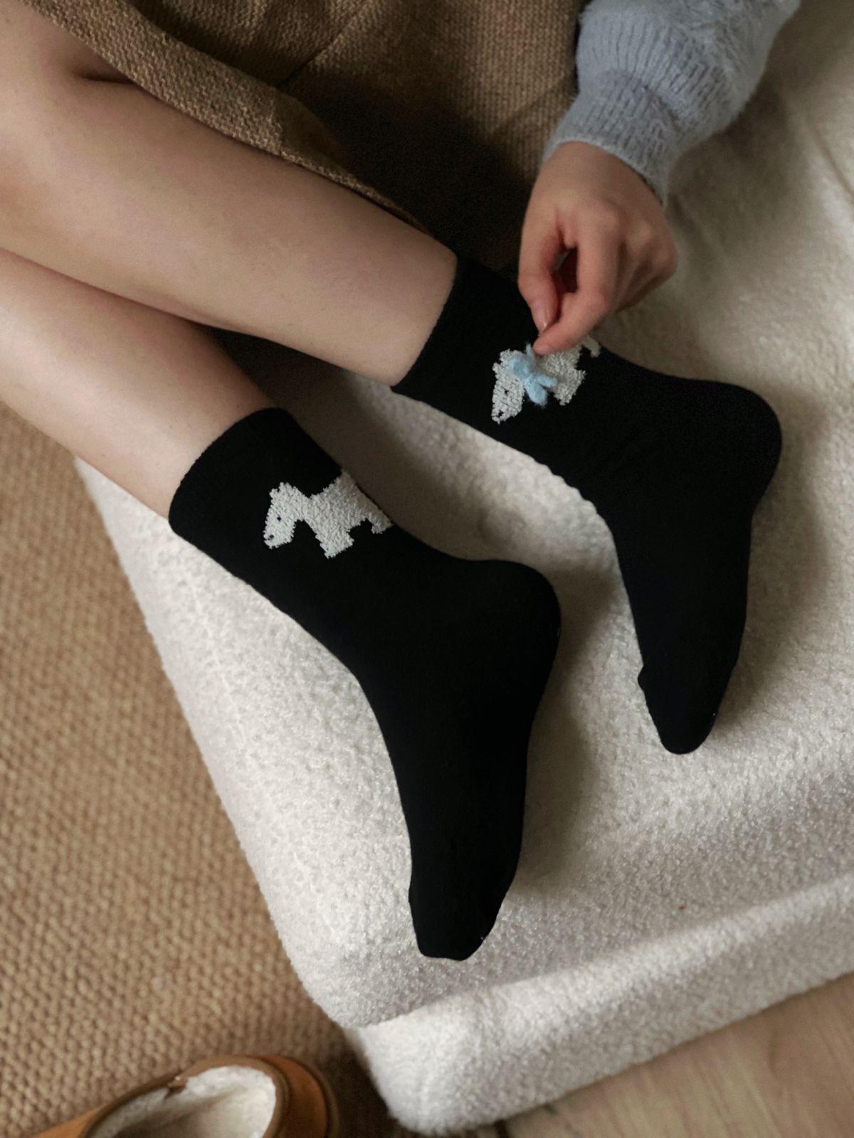 가을과 겨울 회색 양모 따뜻한 양말 한국 스타일 만화 강아지 3 차원 활 두꺼운 미드 튜브 양말