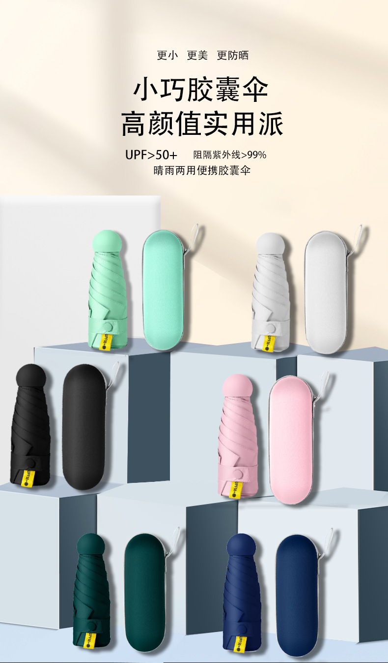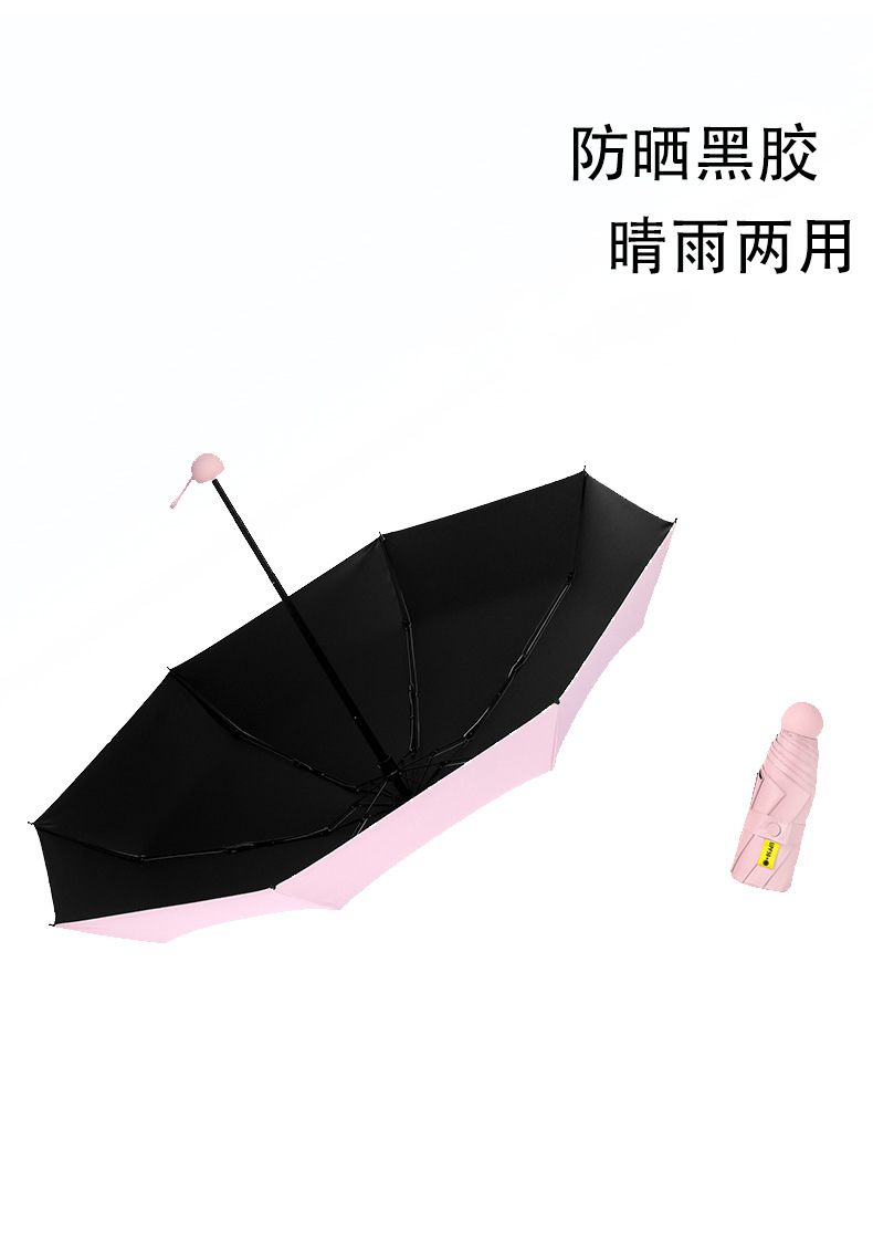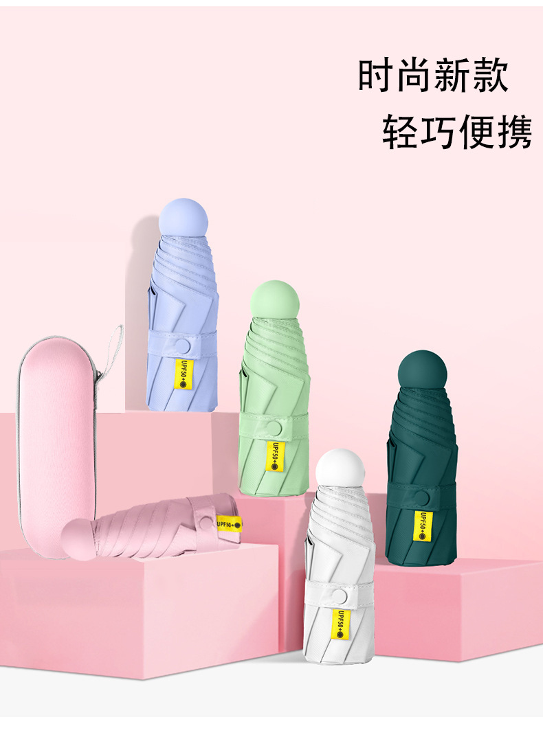 여성을위한 도매 독점 태양 보호 태양 우산 비 또는 빛 컴팩트 휴대용 50% off 미니 블랙 캡슐 광고 우산스토어 가기