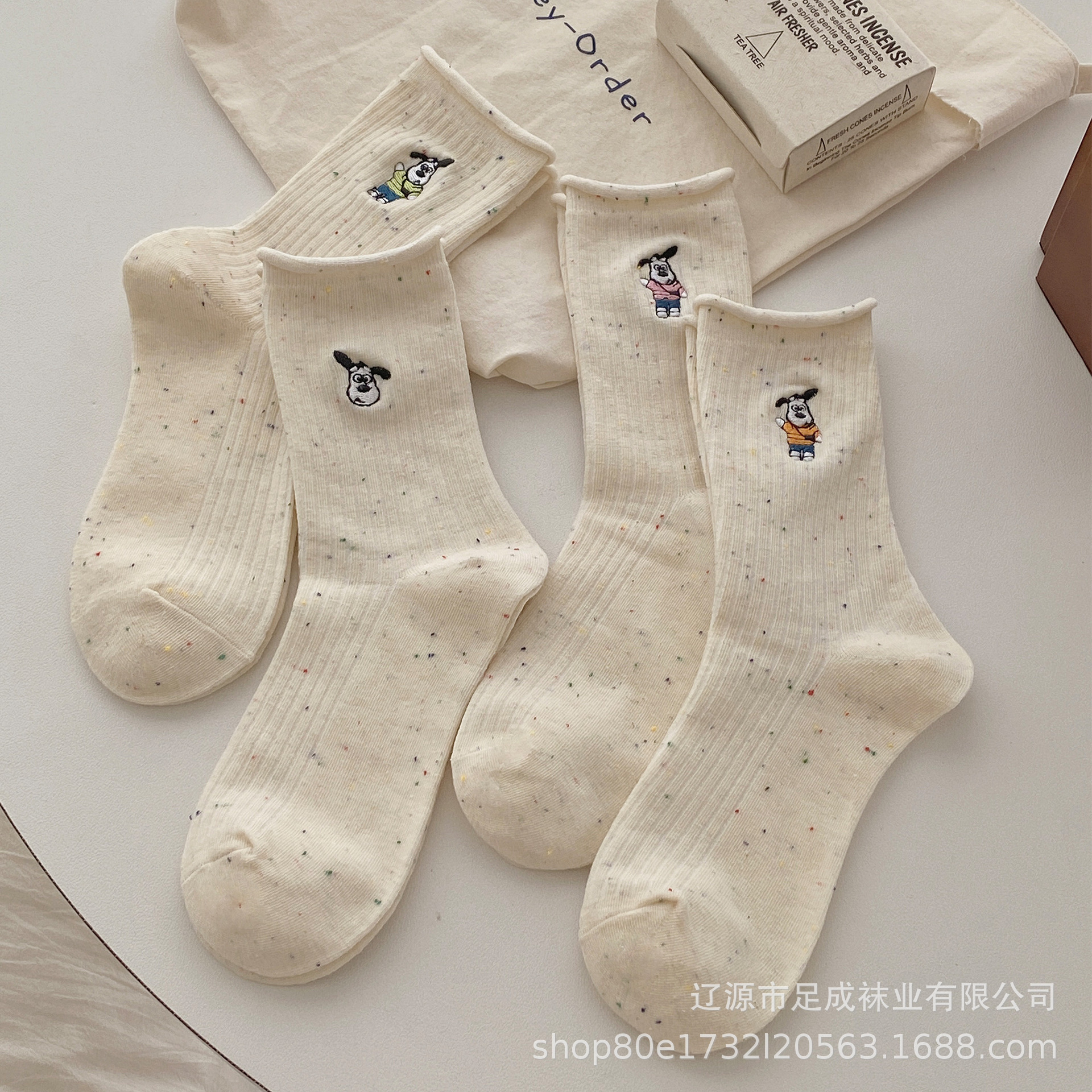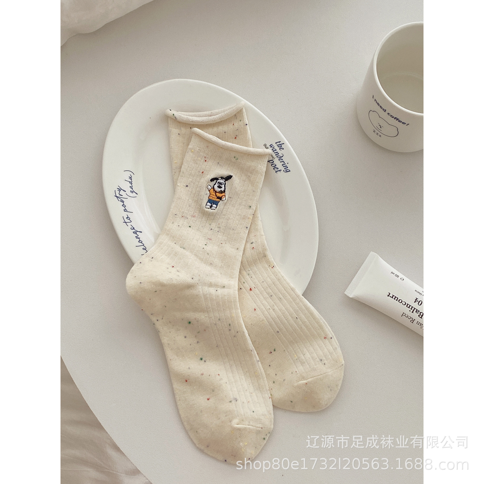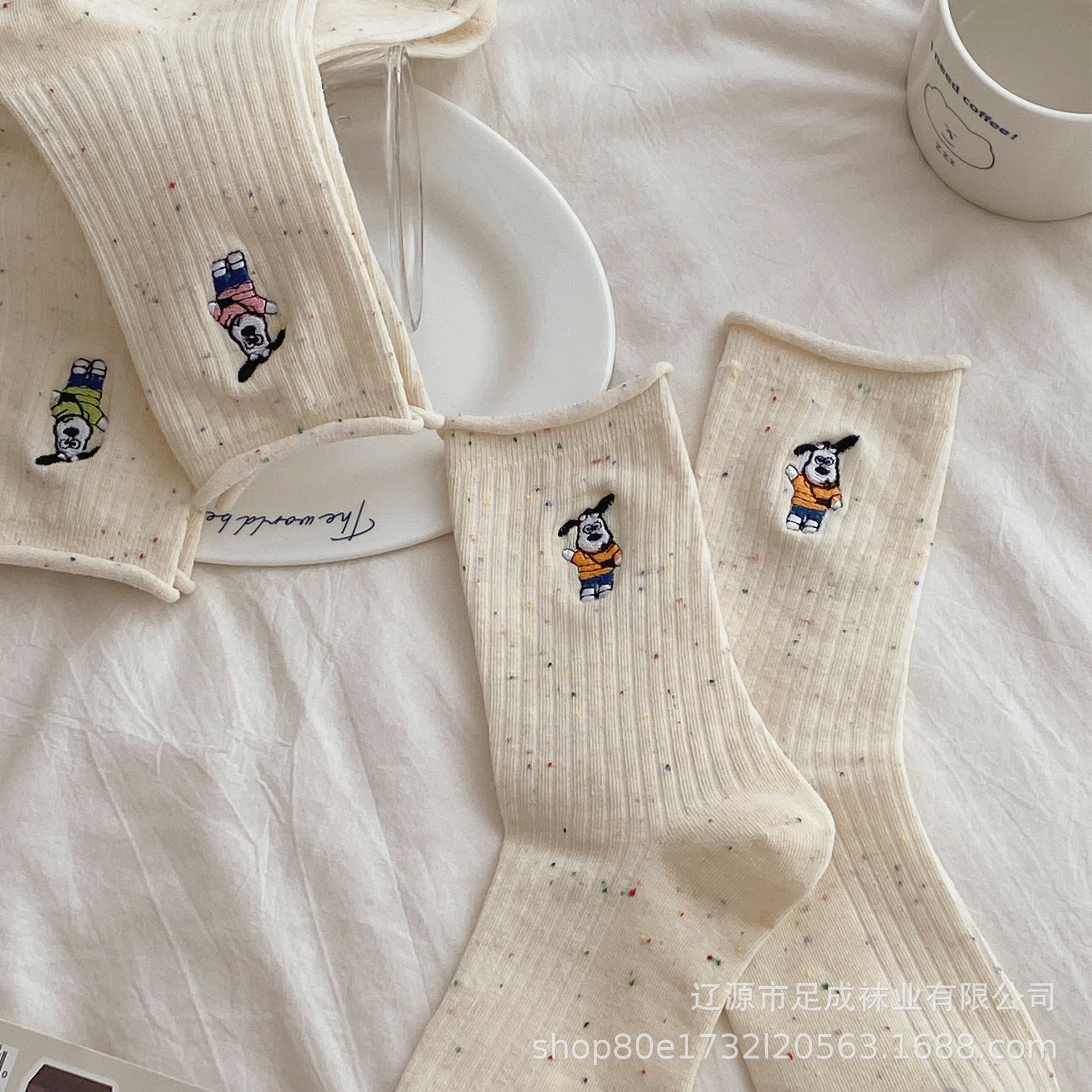 코튼 강아지 수 놓은 미드 튜브 양말 어린이 Ins 유행 가을 및 겨울 포인트 원사 만화 컬 여성용 하이 튜브 스택 양말스토어 가기