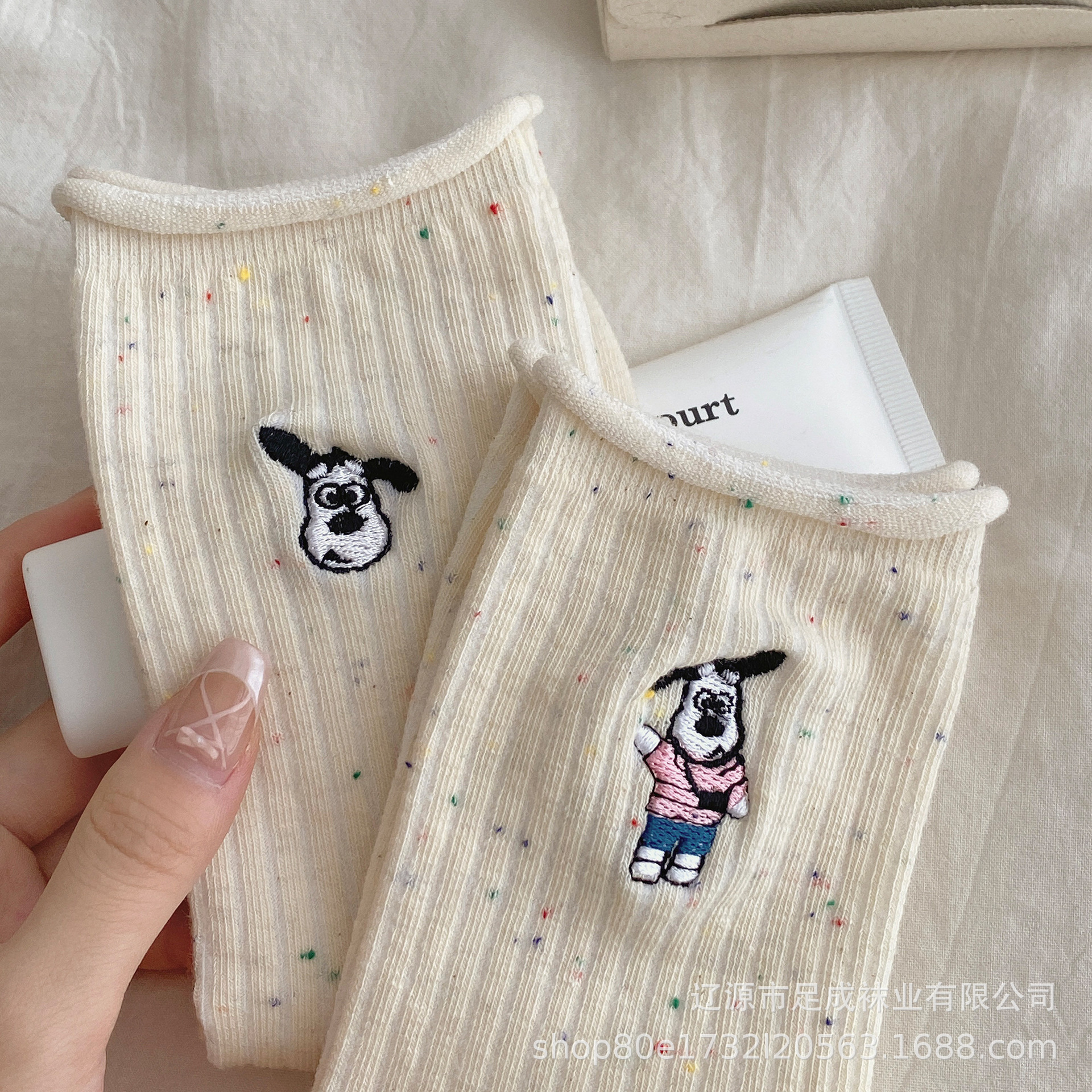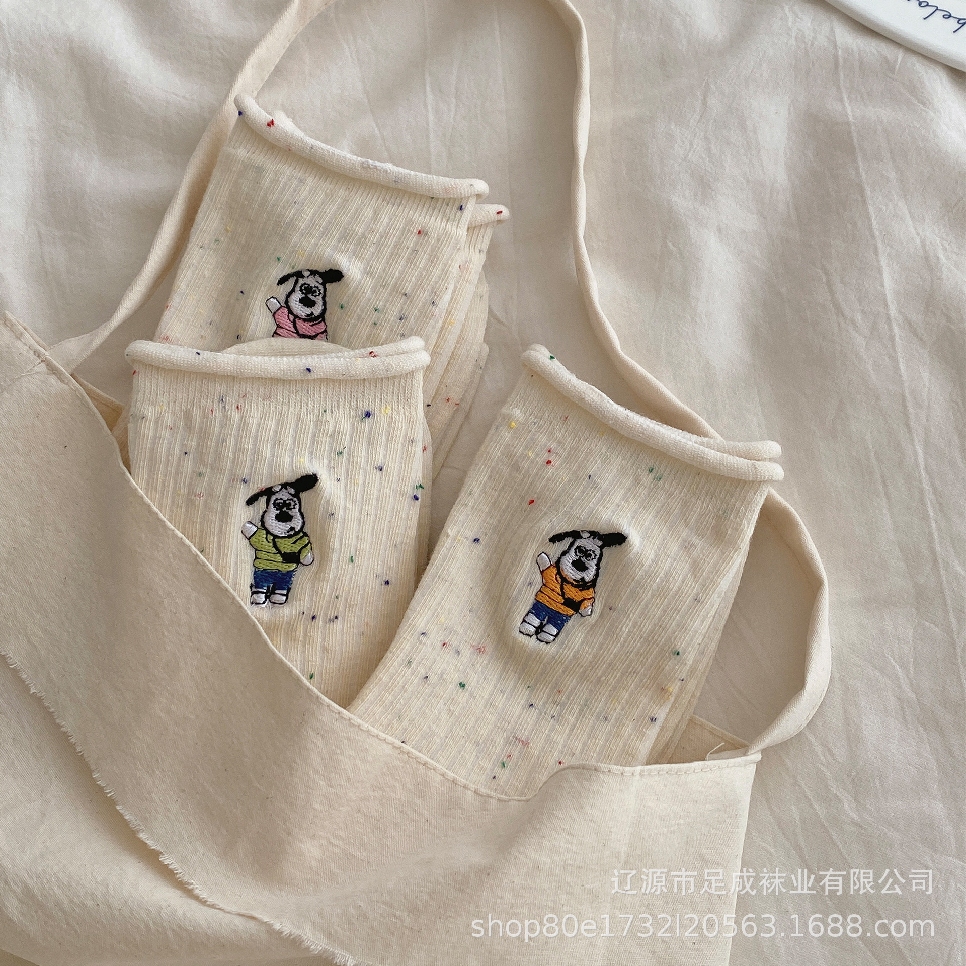 코튼 강아지 수 놓은 미드 튜브 양말 어린이 Ins 유행 가을 및 겨울 포인트 원사 만화 컬 여성용 하이 튜브 스택 양말