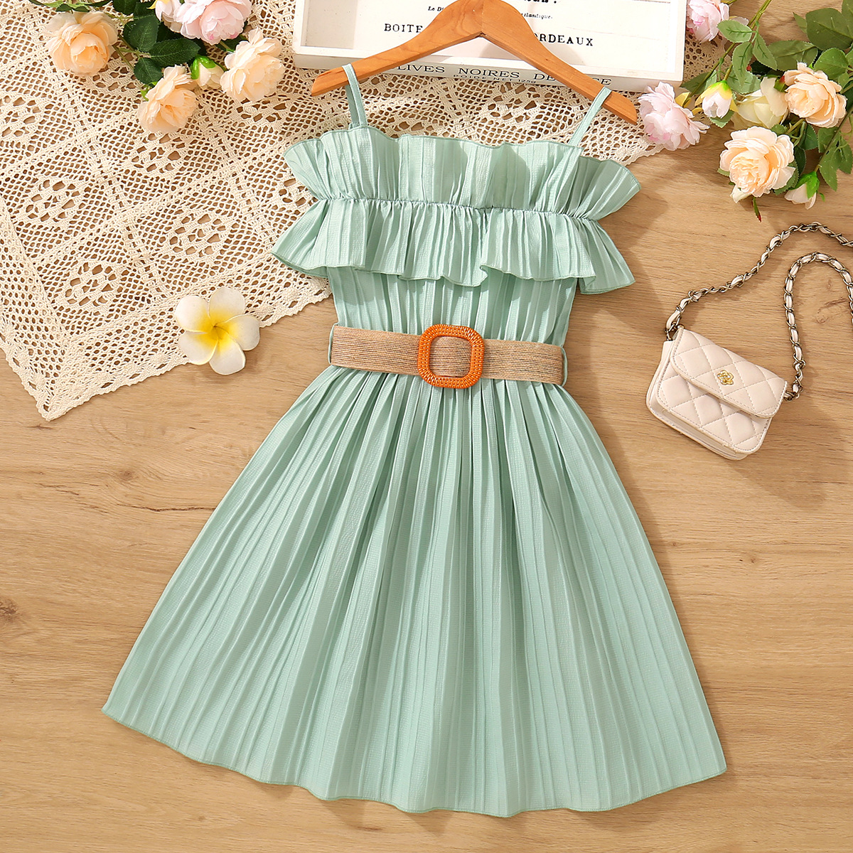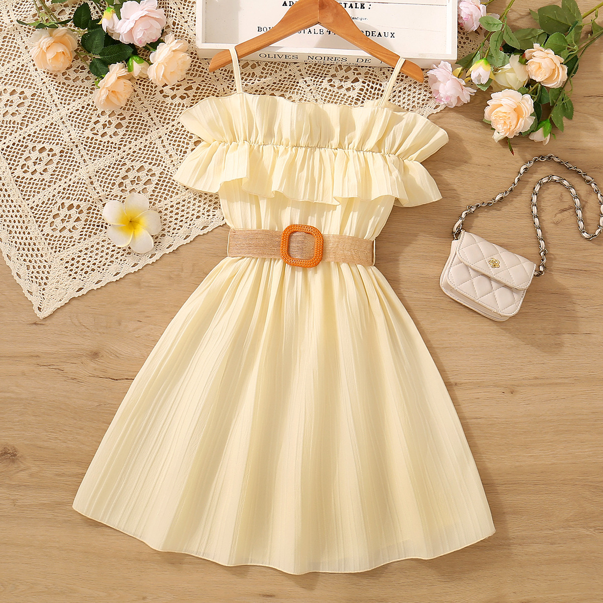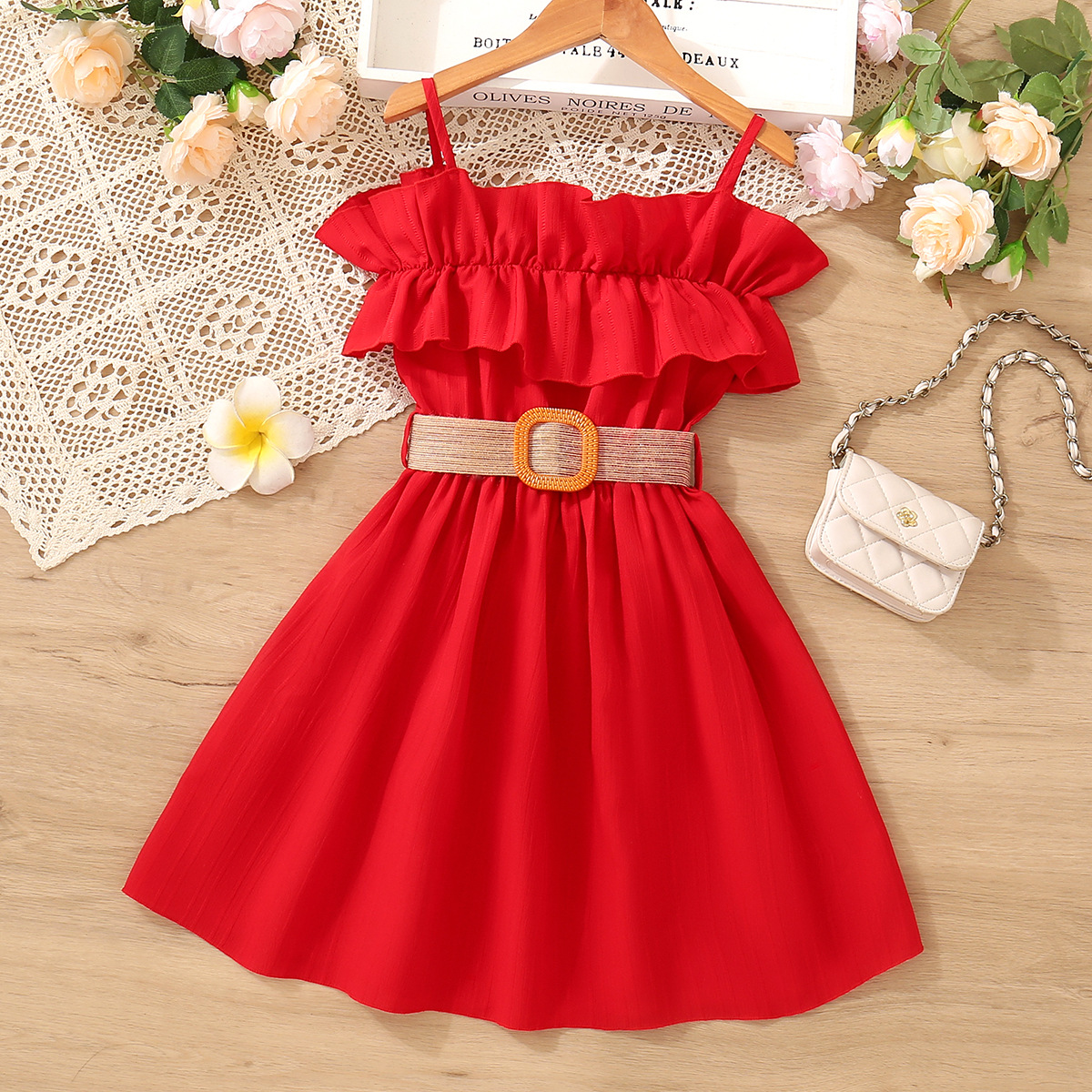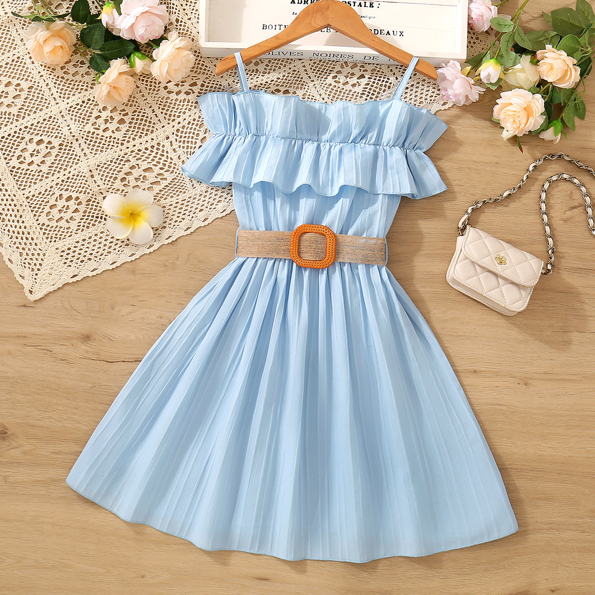 국경 간 아동복 여아 스커트 걸스 여름 착용 오프 숄더 슬링 레이스 서양식 걸스 원피스 벨트