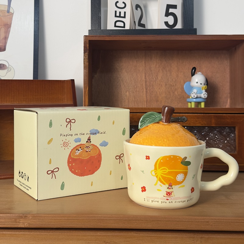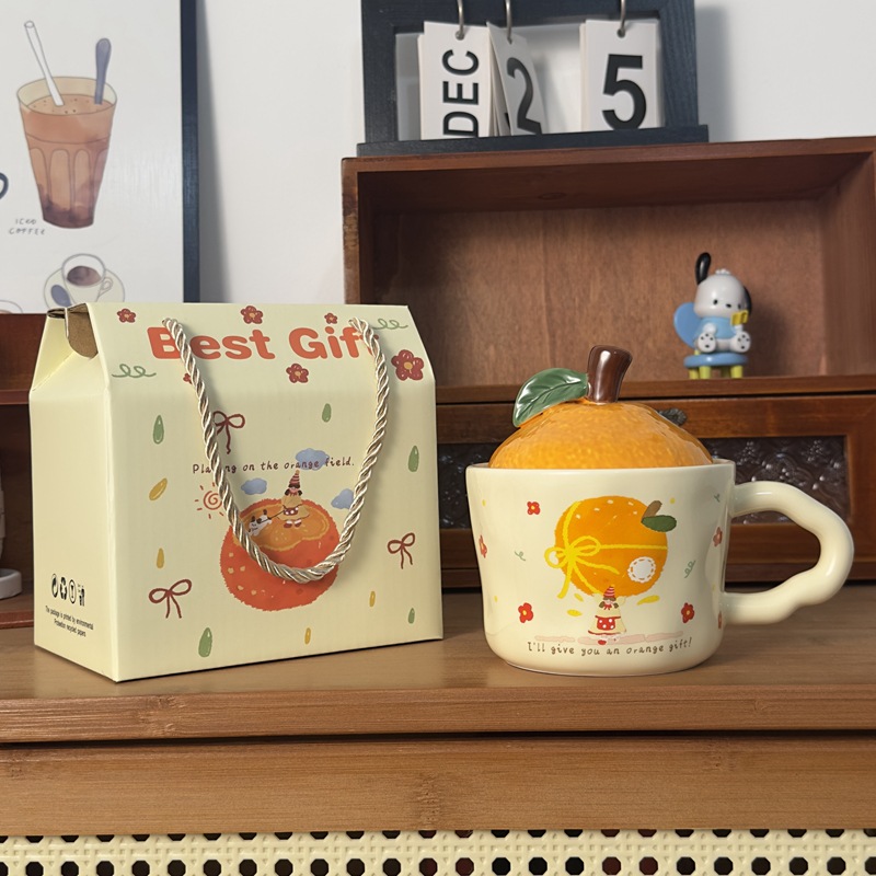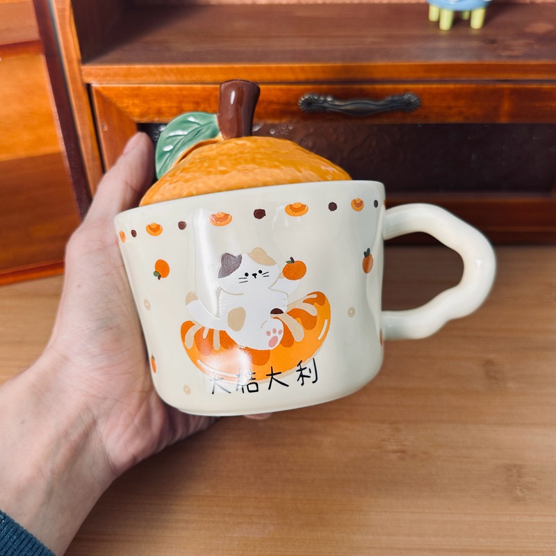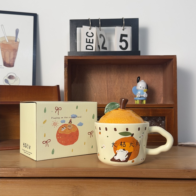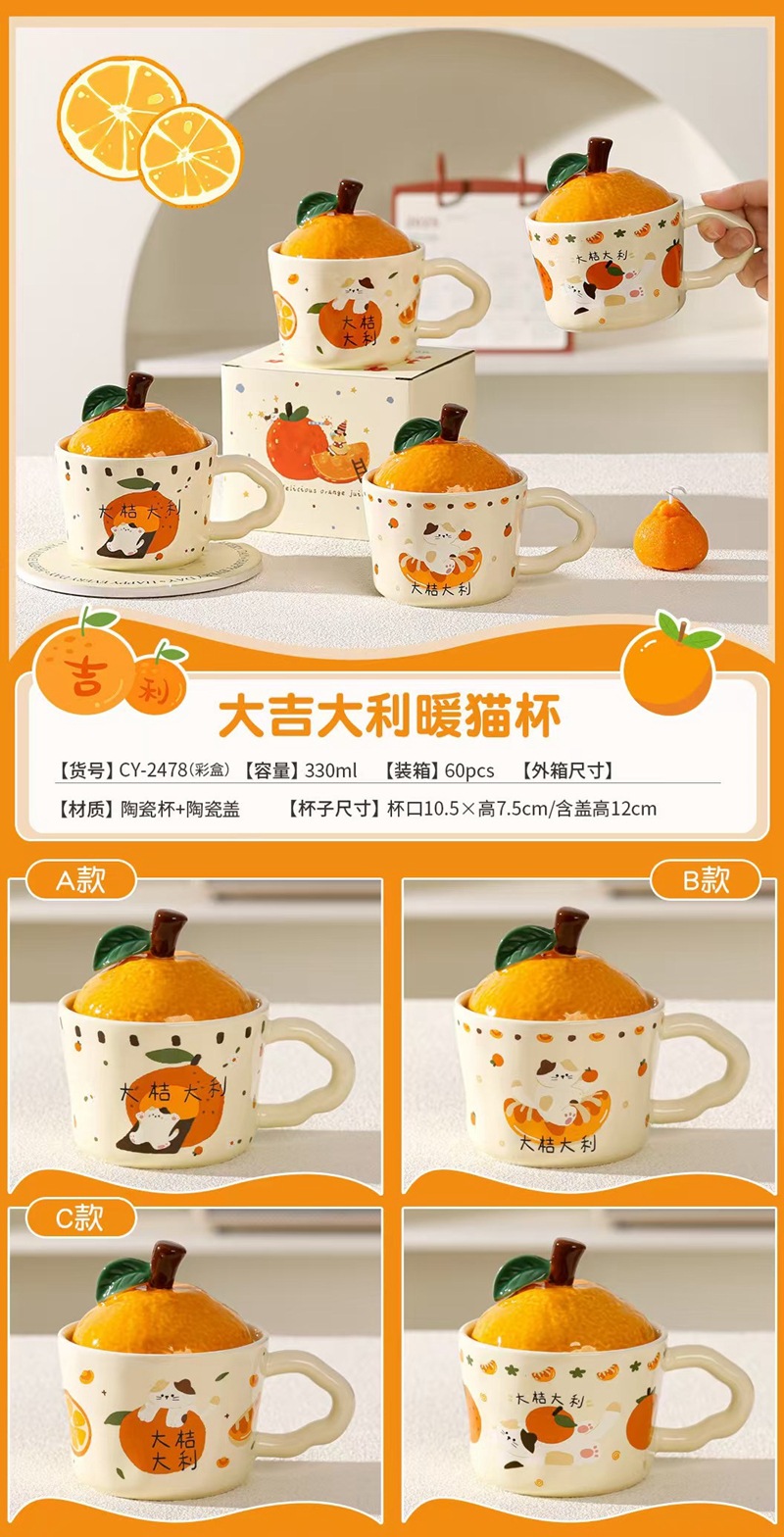 큰 Gittali 오렌지 세라믹 컵 뚜껑 귀여운 고양이 찻잔 새해 선물 커피 컵 사무실 물 컵스토어 가기