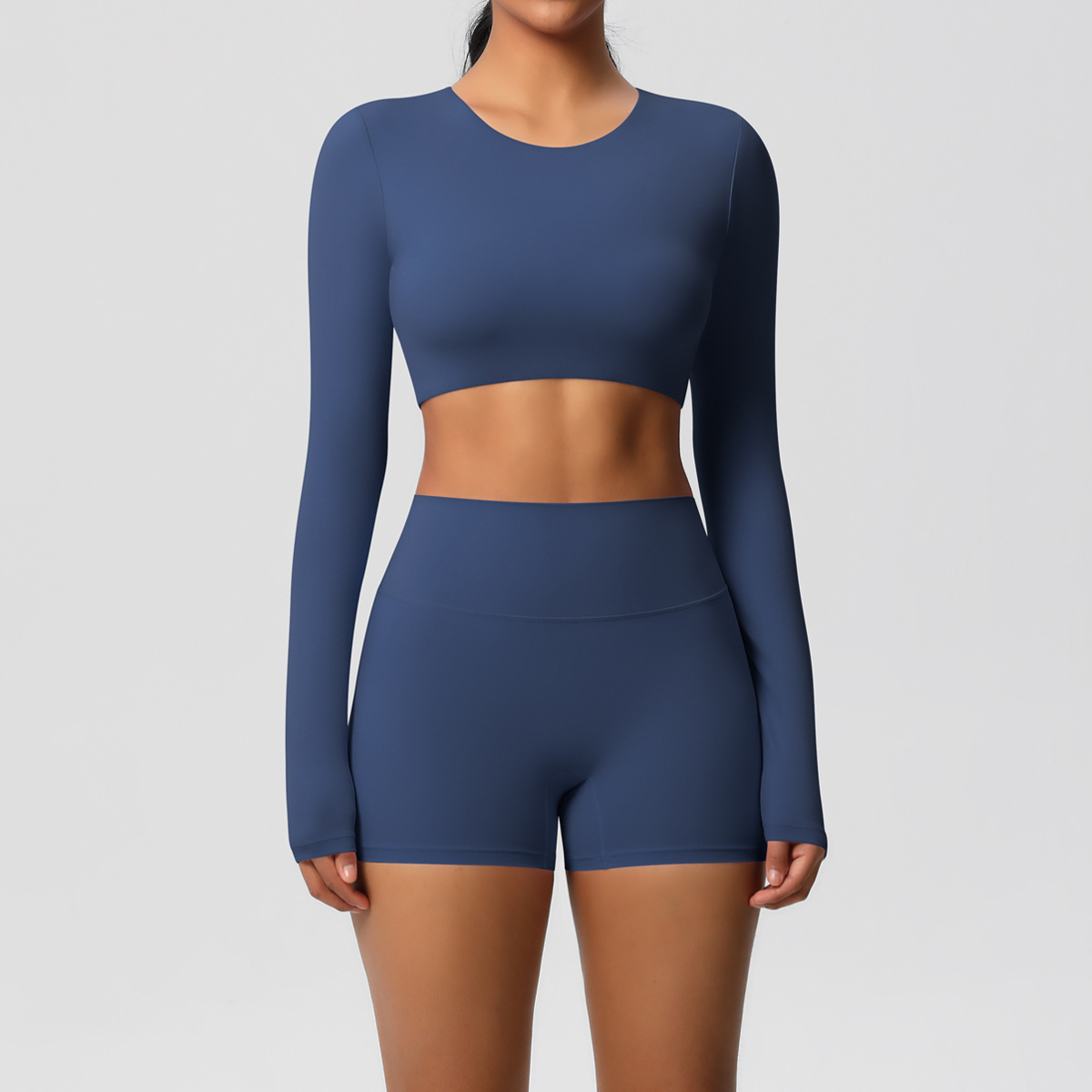 크로스-보더 솔리드 컬러 양면 샌딩 가슴 패드 타이트 요가 의류 긴팔 세트 러닝 스포츠 피트니스 의류 투피스 세트