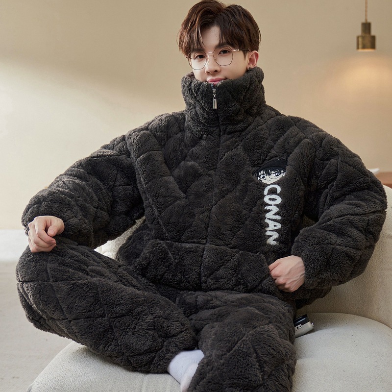 남자 잠옷 겨울 3 층 퀼트 산호 양털 높은 칼라 두꺼운 플란넬 홈 옷 십대, 중학교 및 고등학생
