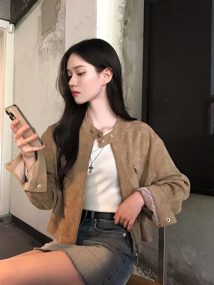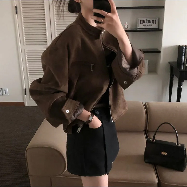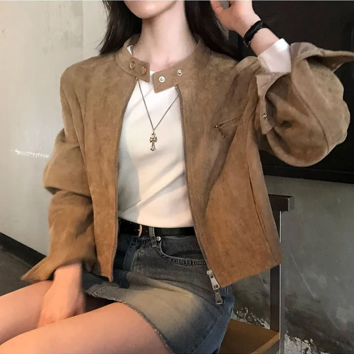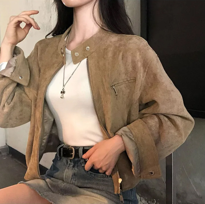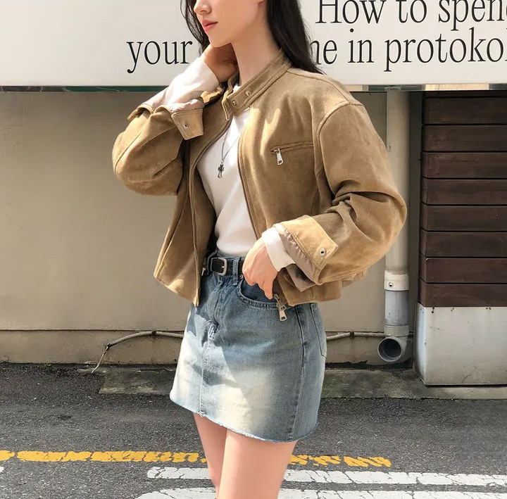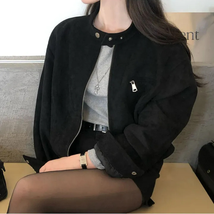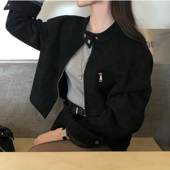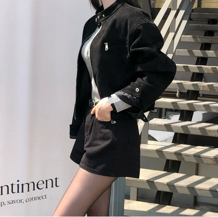 한국 세련된 가을 복고풍 기질 스탠드 업 칼라 지퍼 포켓 루즈하고 다재다능한 여성용 짧은 오토바이 재킷스토어 가기