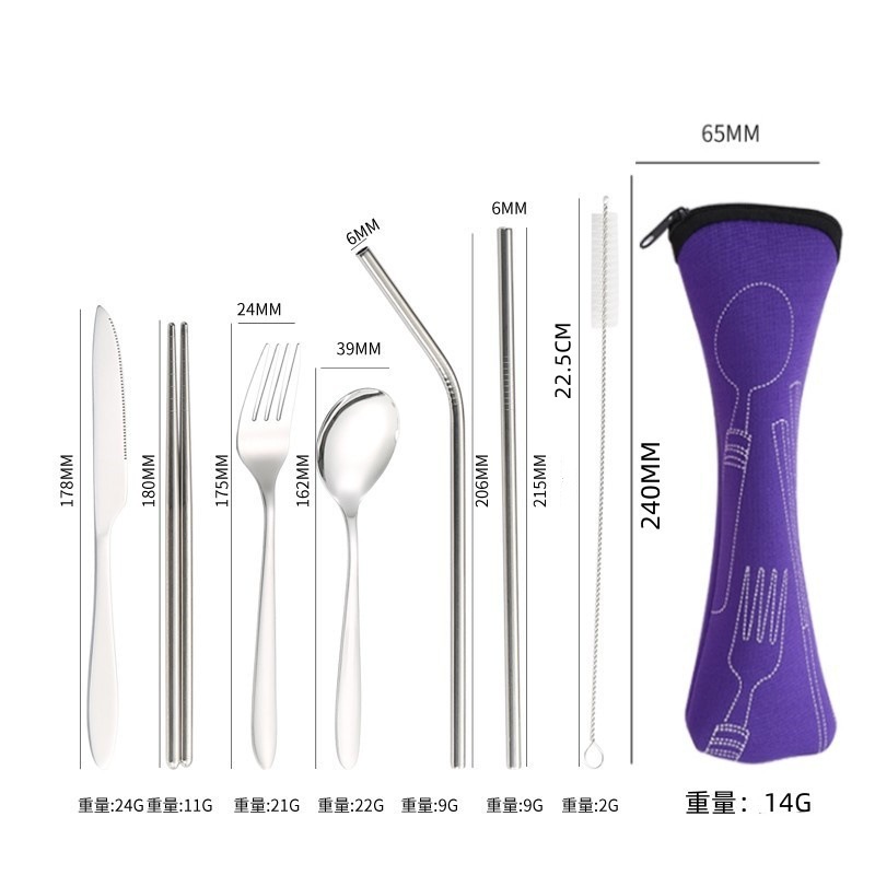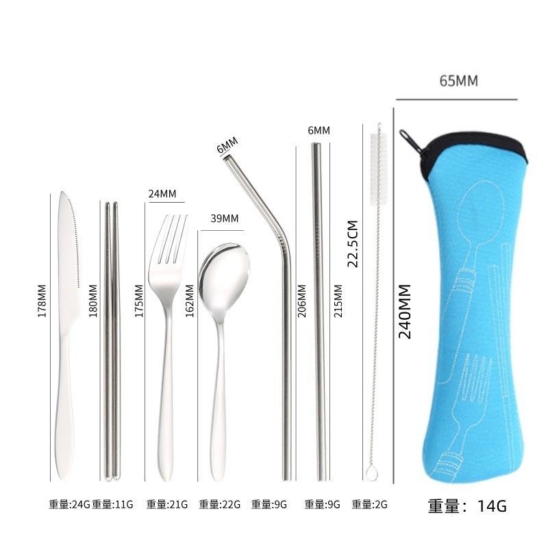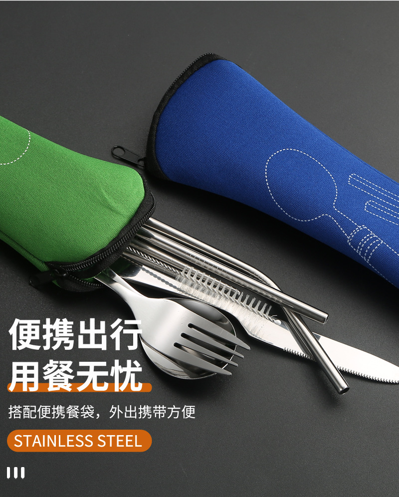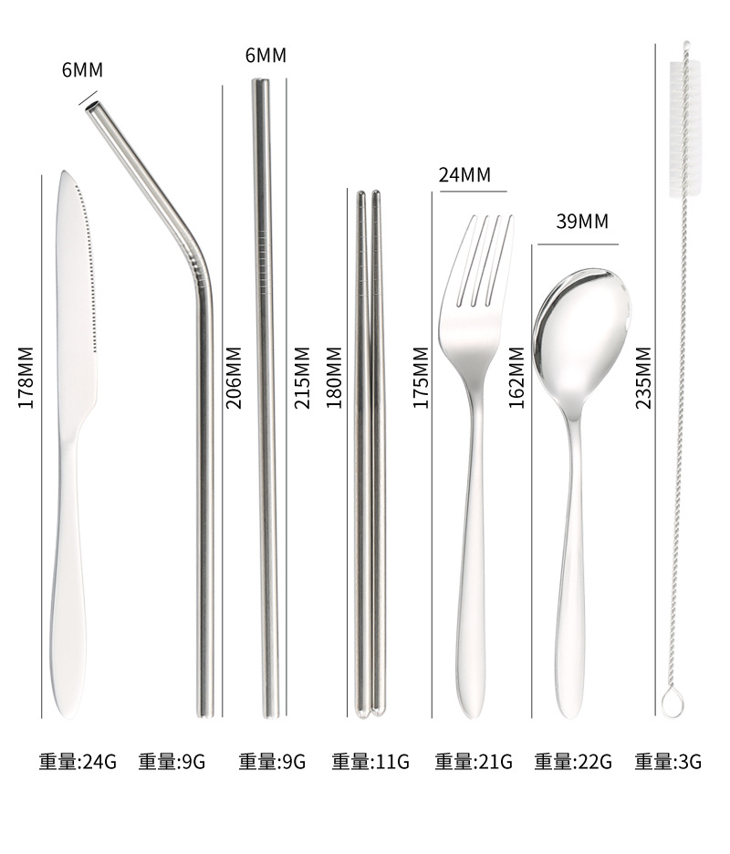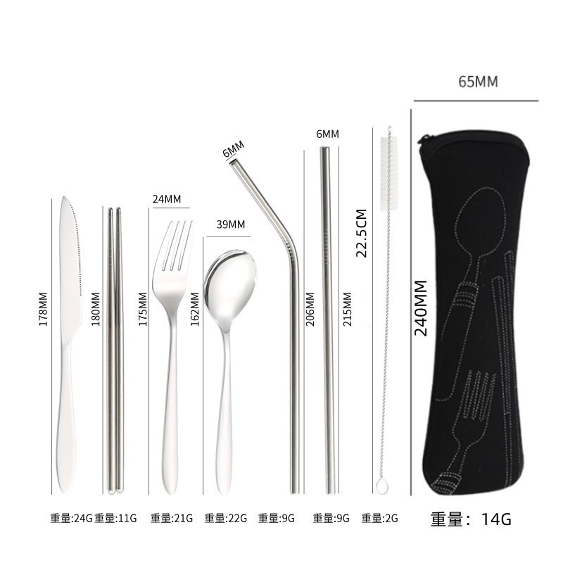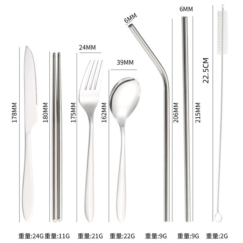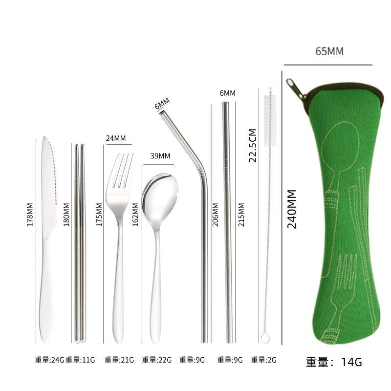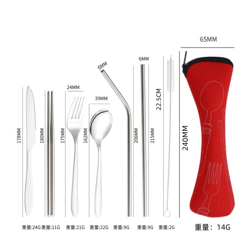 [맞춤형] 국경 간 스테인레스 스틸 식기 칼, 포크, 스푼, 젓가락, 야외 휴대용 천 가방 보관 빨대 7종 세트