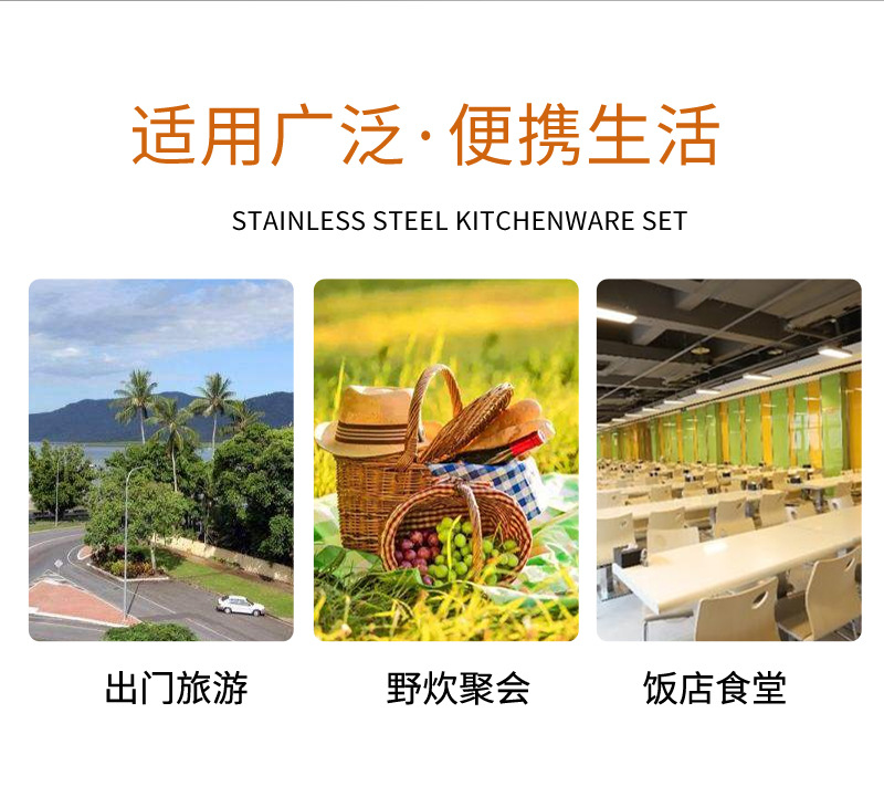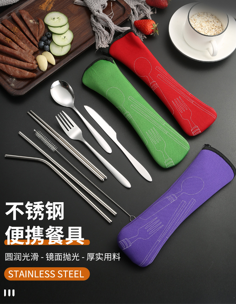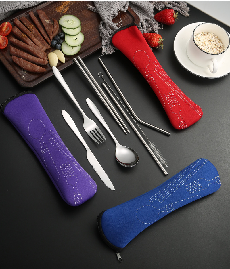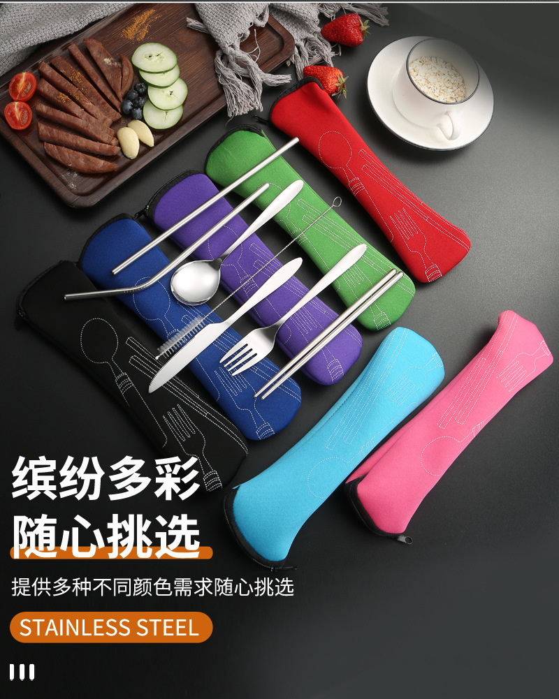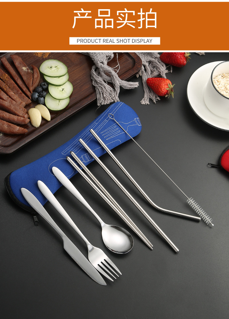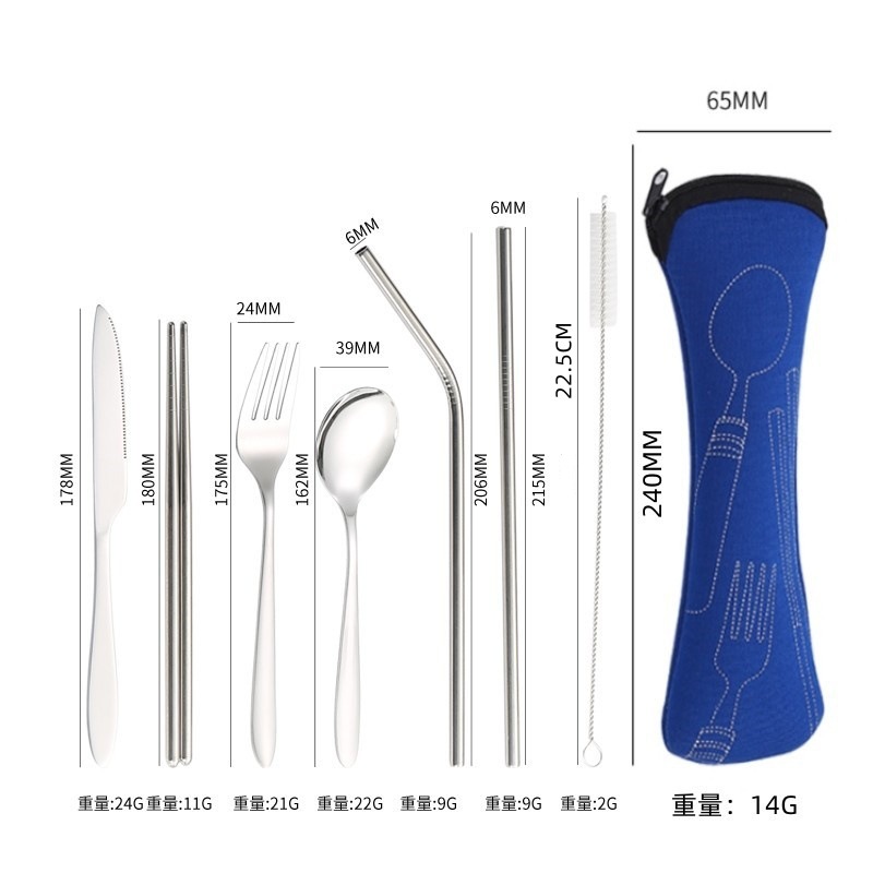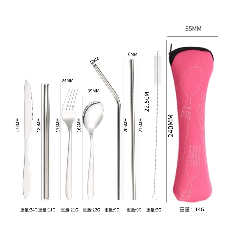 [맞춤형] 국경 간 스테인레스 스틸 식기 칼, 포크, 스푼, 젓가락, 야외 휴대용 천 가방 보관 빨대 7종 세트