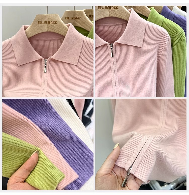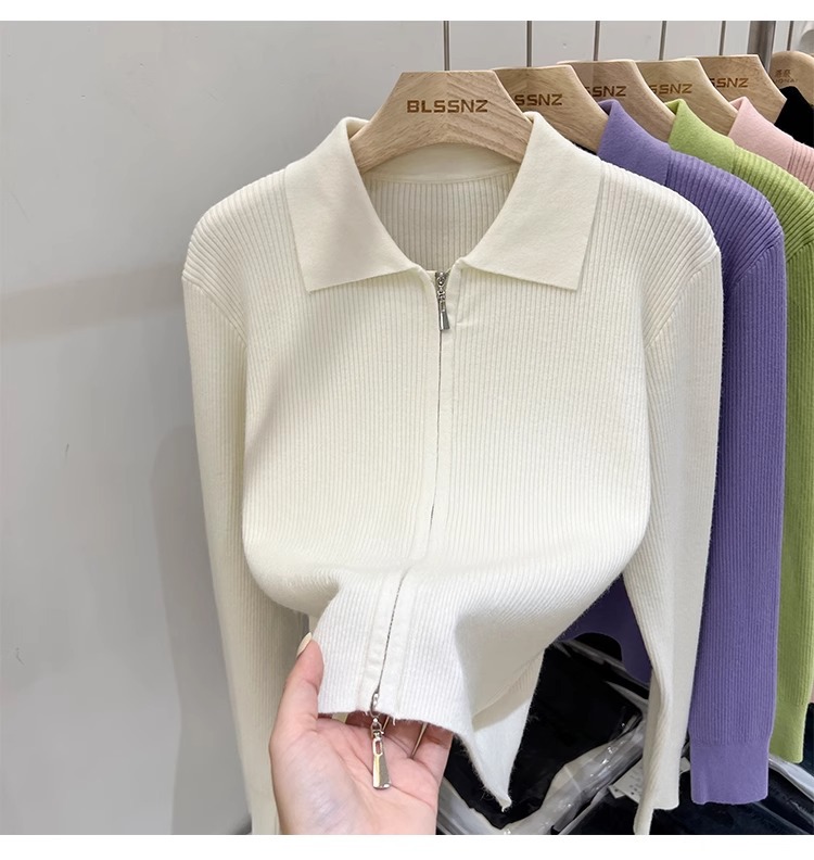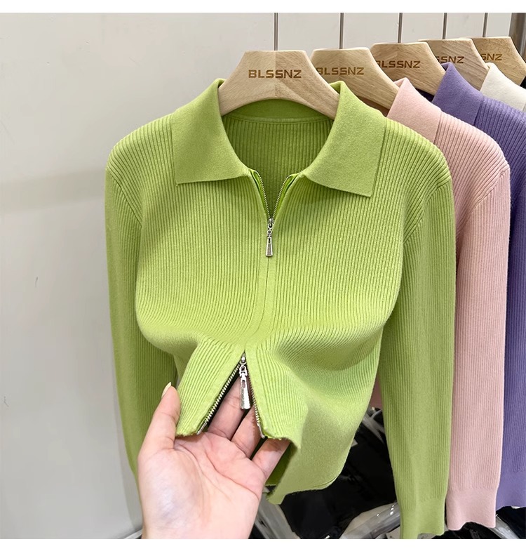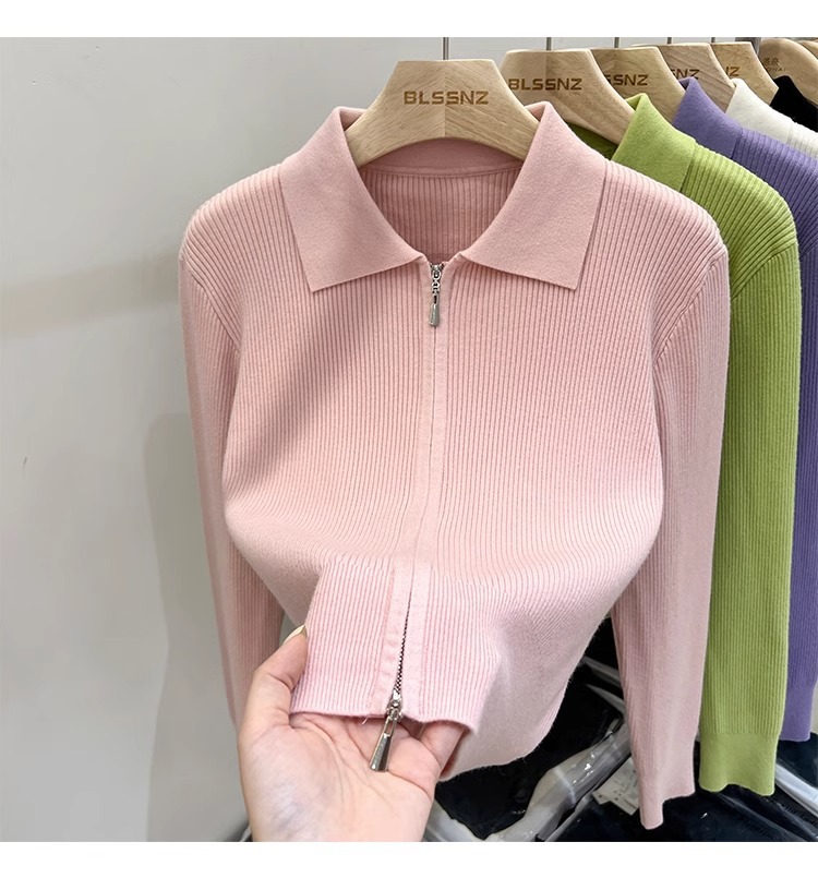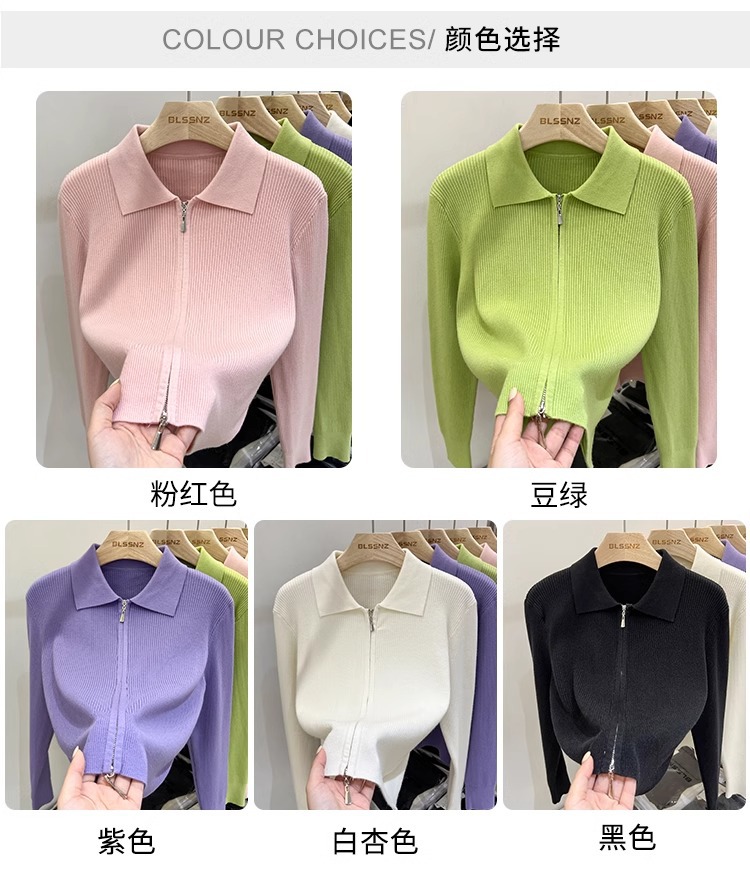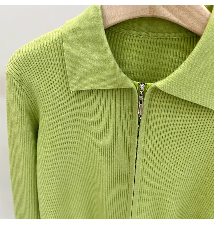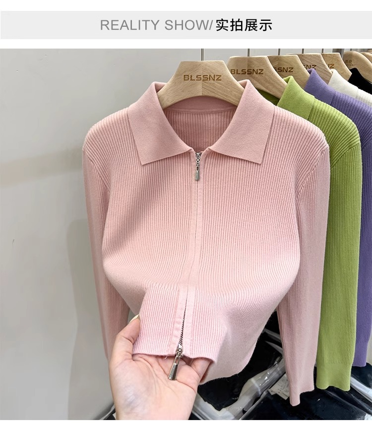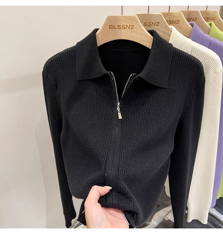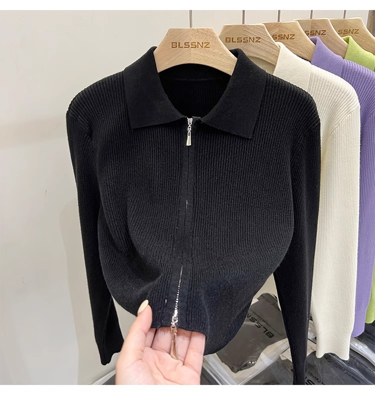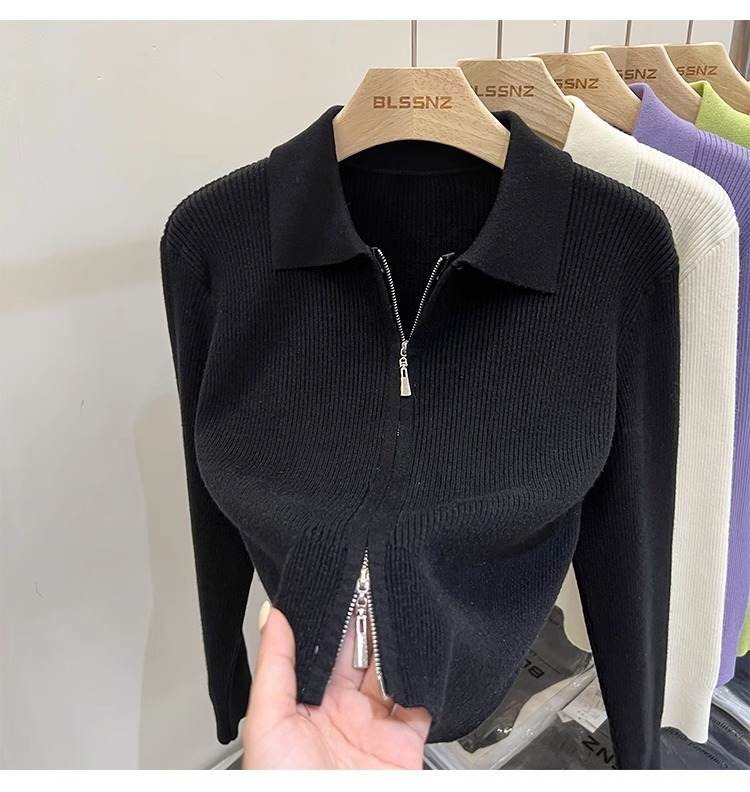 [카운터 철수] 더블 지퍼 옷깃 니트 카디건 2024 이른 봄 새 구덩이 스트립 쇼트 코트 여자 탑