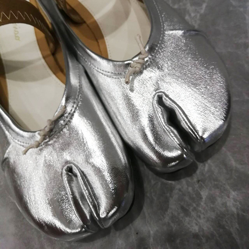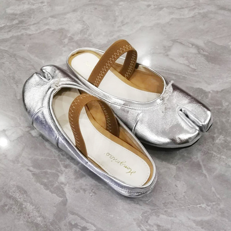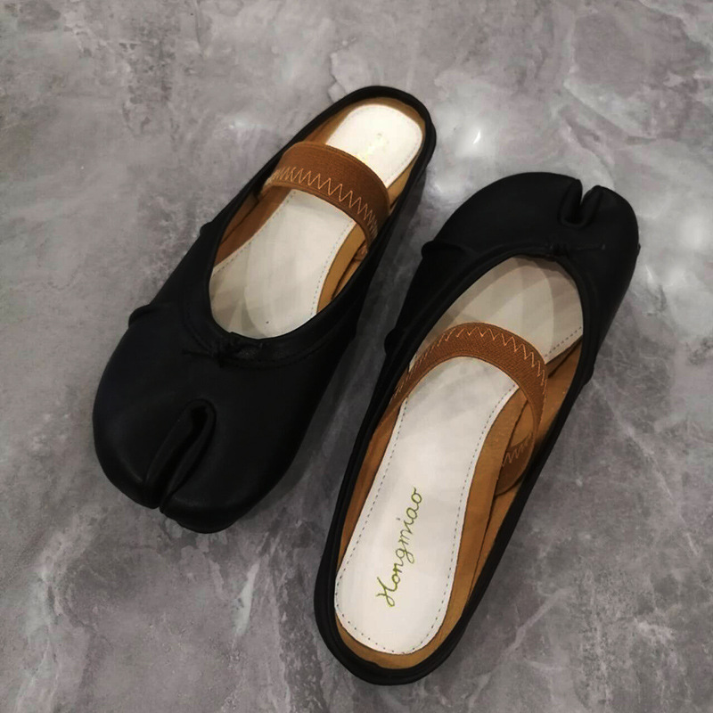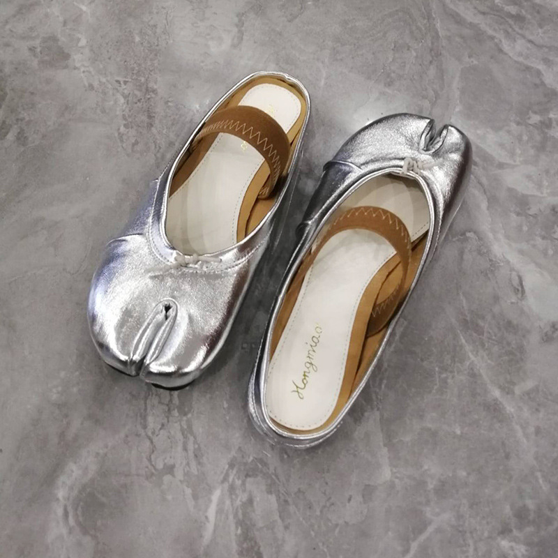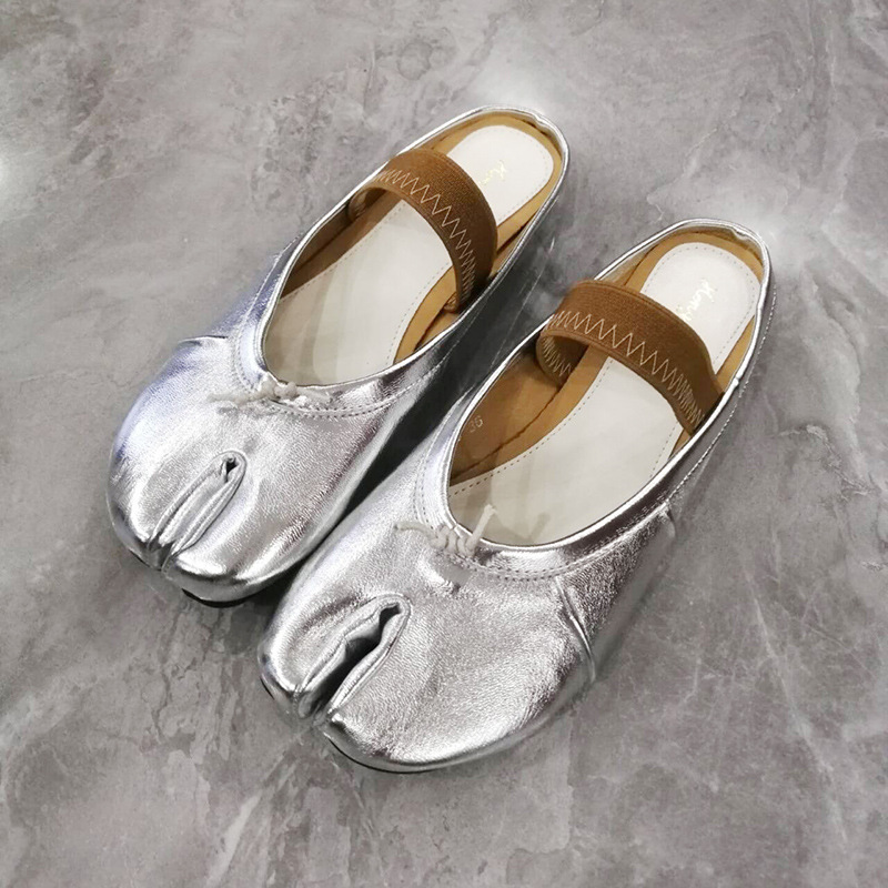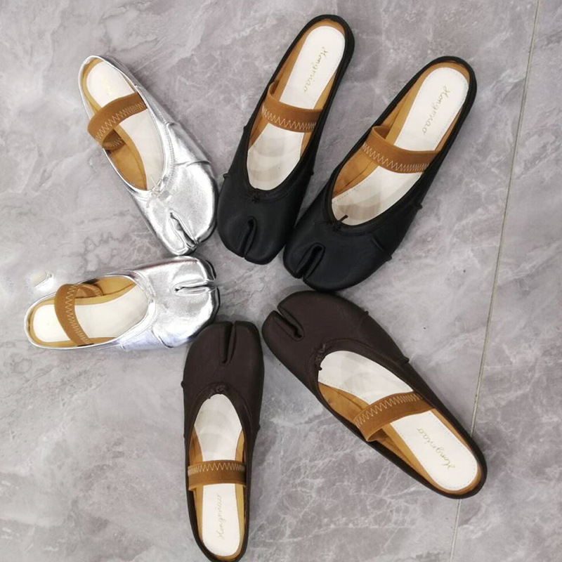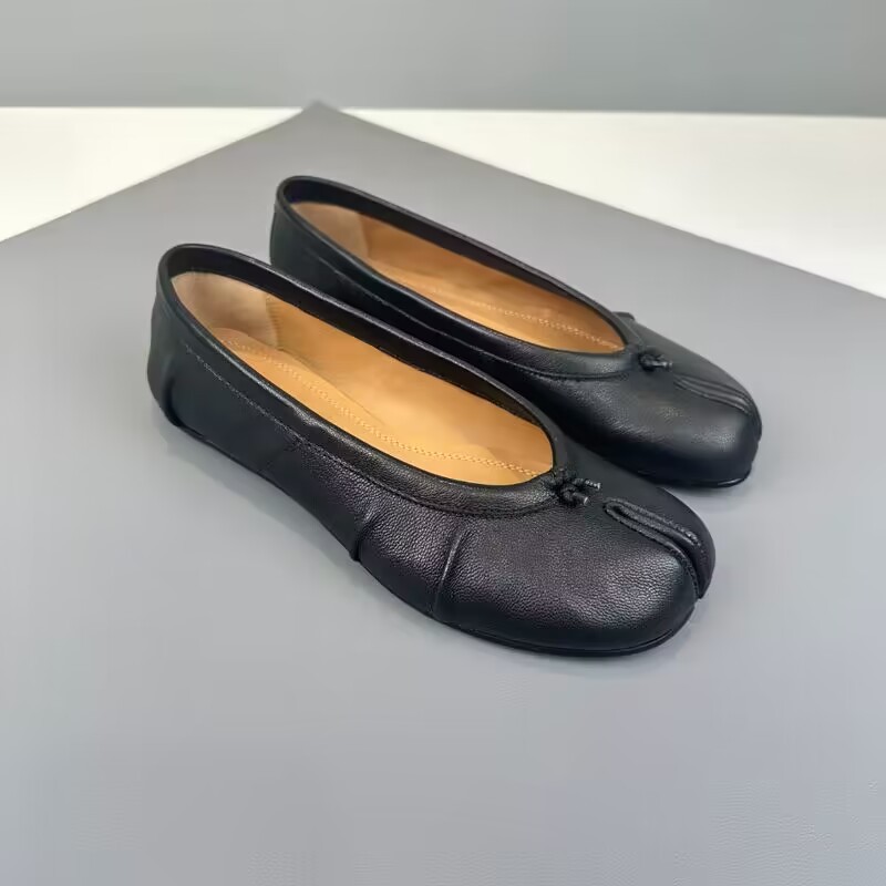 양가죽 타비 스플릿 발가락 신발 여성의 2025 새로운 틈새 주름 발레 트로터 가죽 로우 탑 플랫 슈즈
