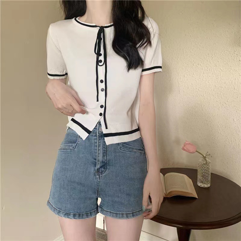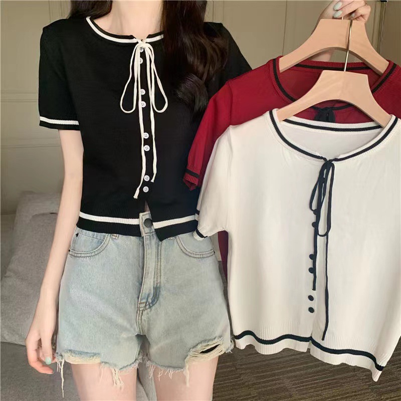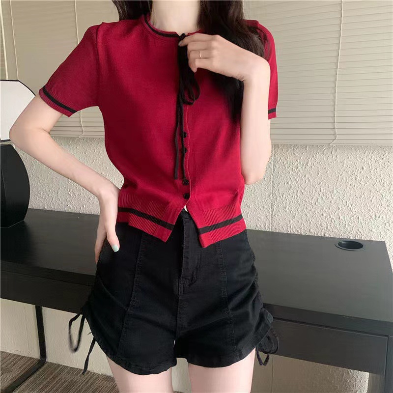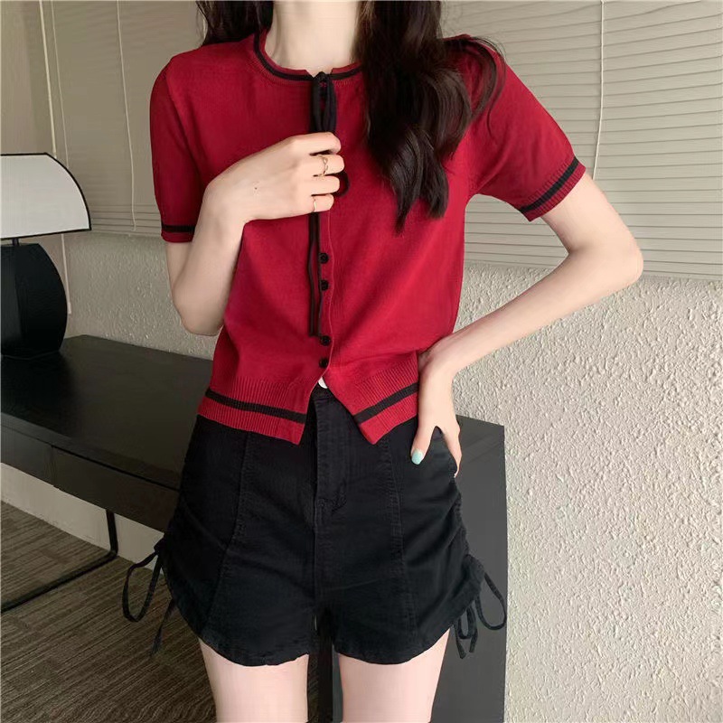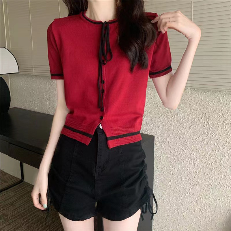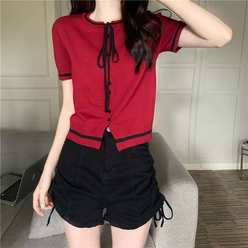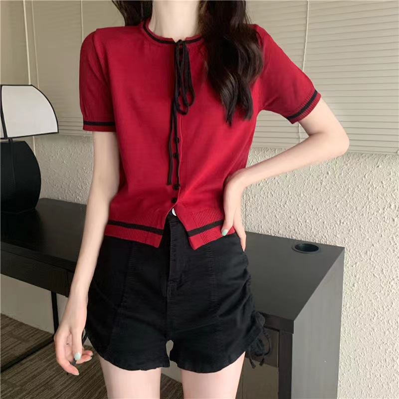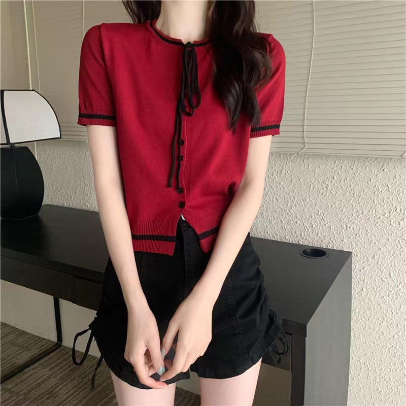 국경 간 동남아시아 여름 디자인 센스 니쉬 라운드 넥 반팔 레드 스웨터 여성의 달콤한 귀여운 탑스토어 가기