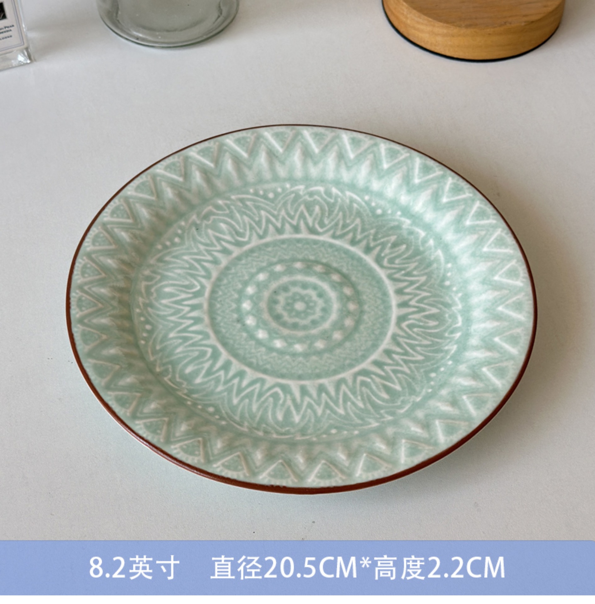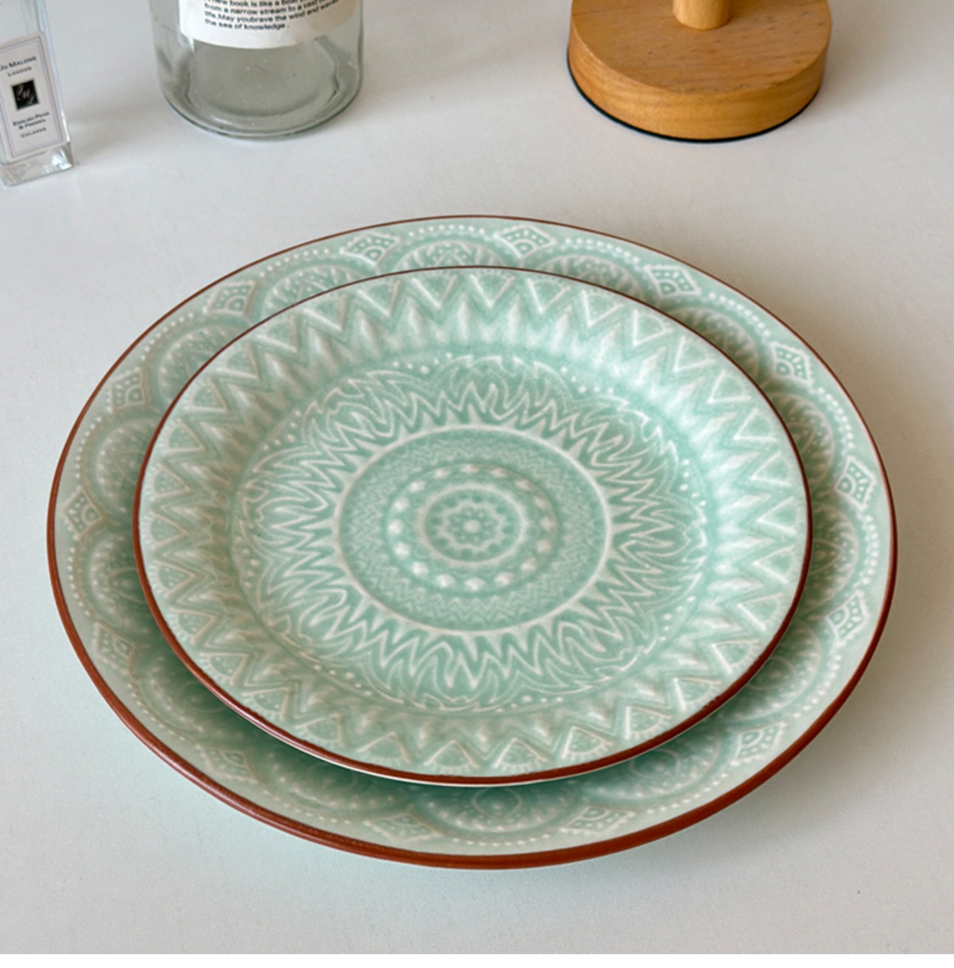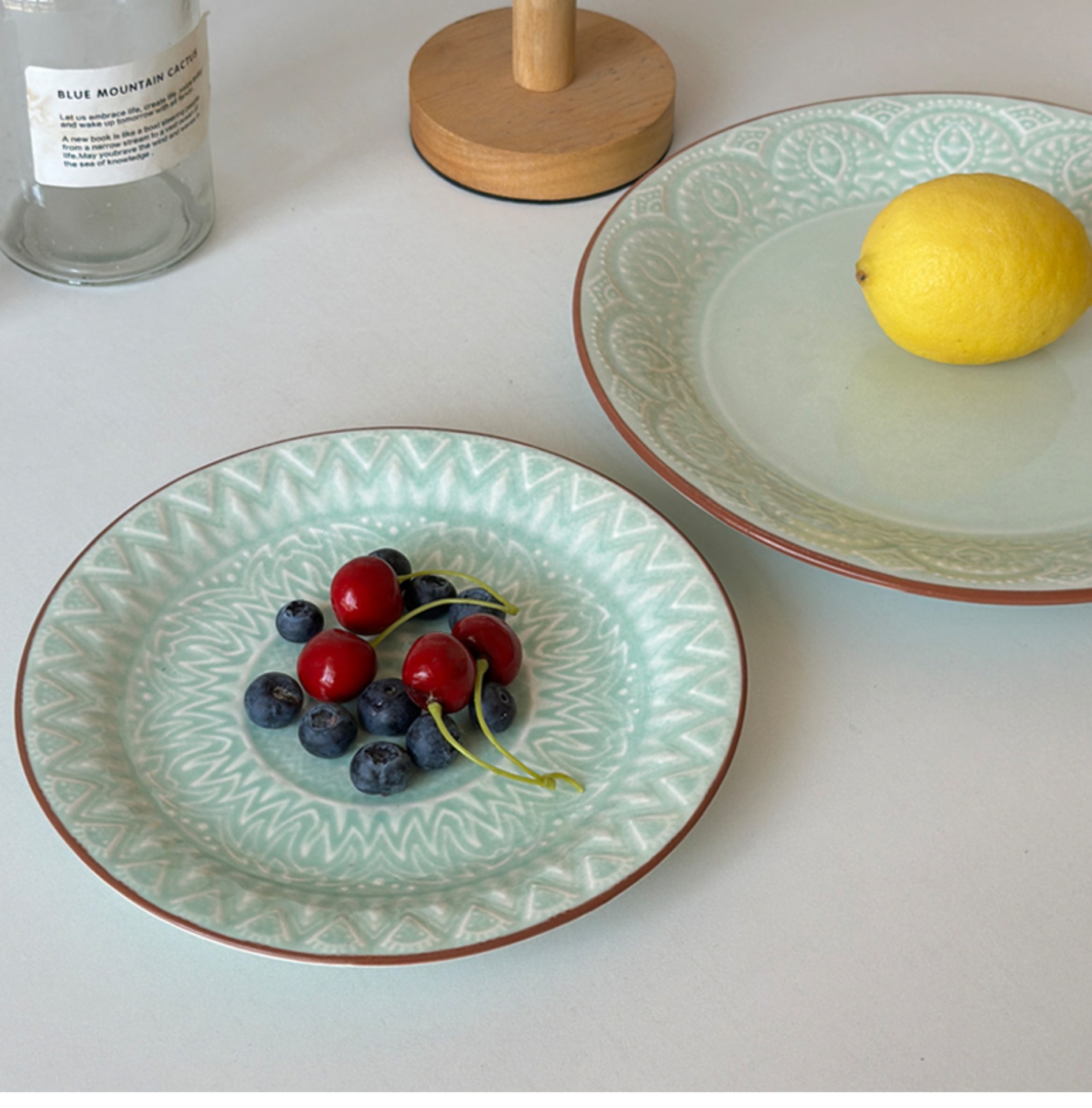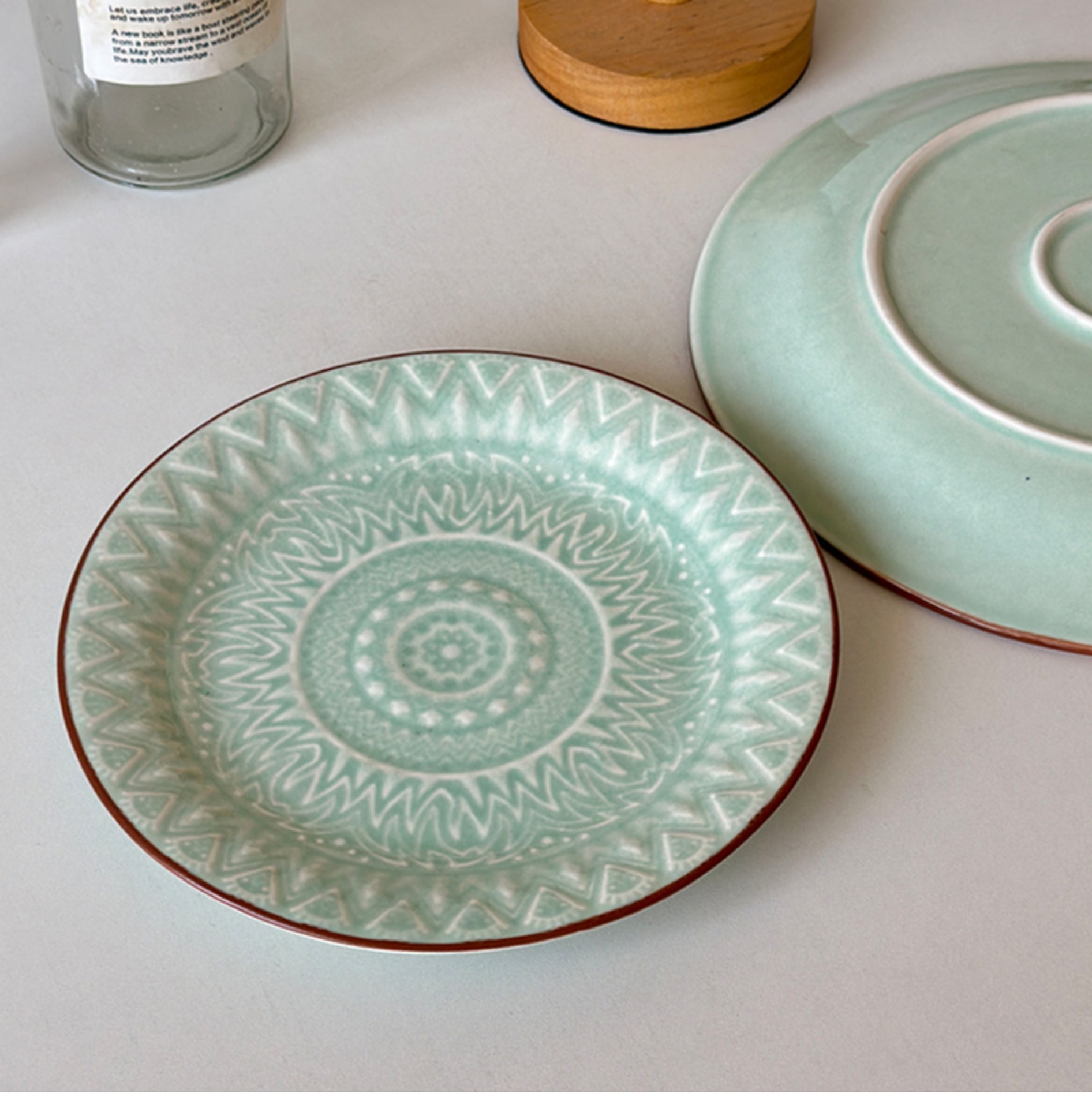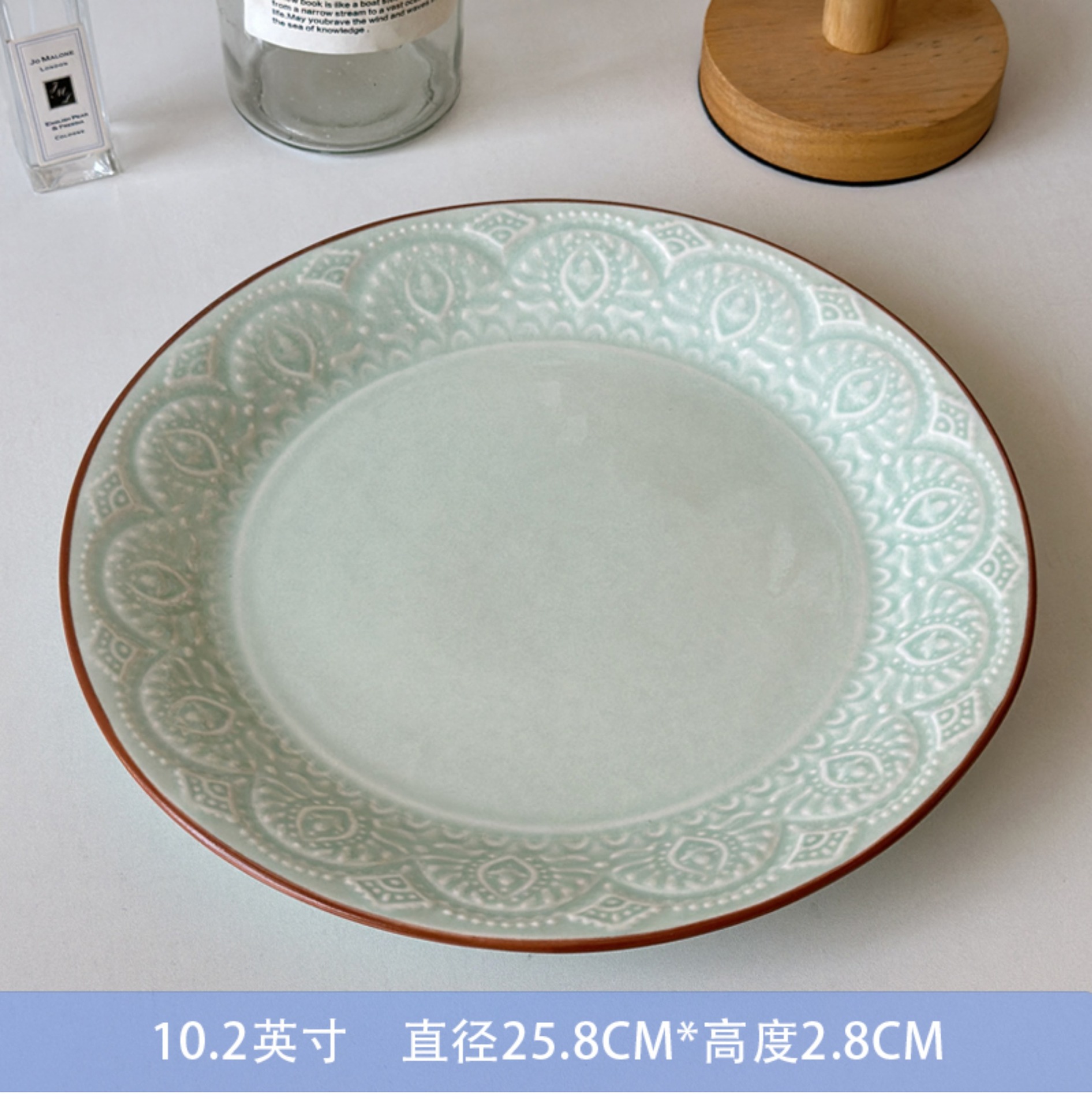[Jumei 프랑스 라이트 그린 양각 플랫 플레이트] 스타일 세라믹 레스토랑 웨스턴 플레이트 가정용 플레이트 디저트 플레이트
