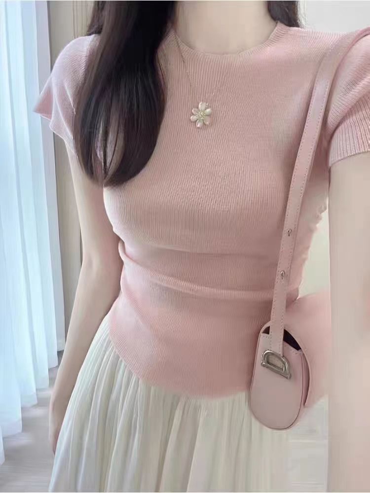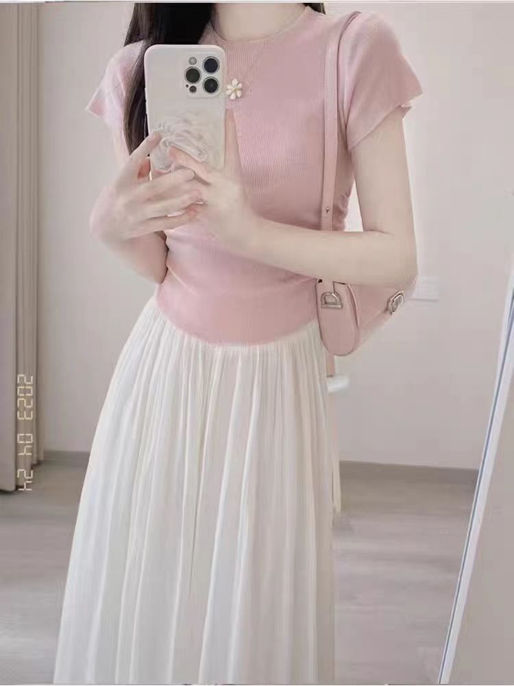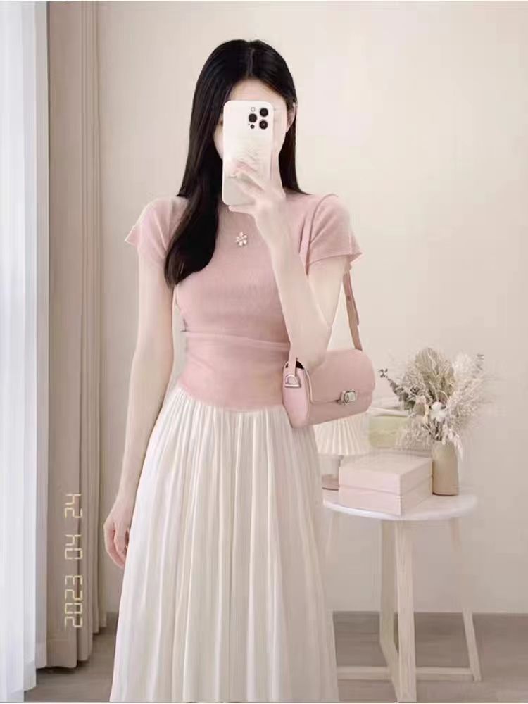 여름 작은 소금 착용 핑크 반팔 최고 치마 우아한 빛 성숙한 샤넬 스타일 여성용 투피스 세트