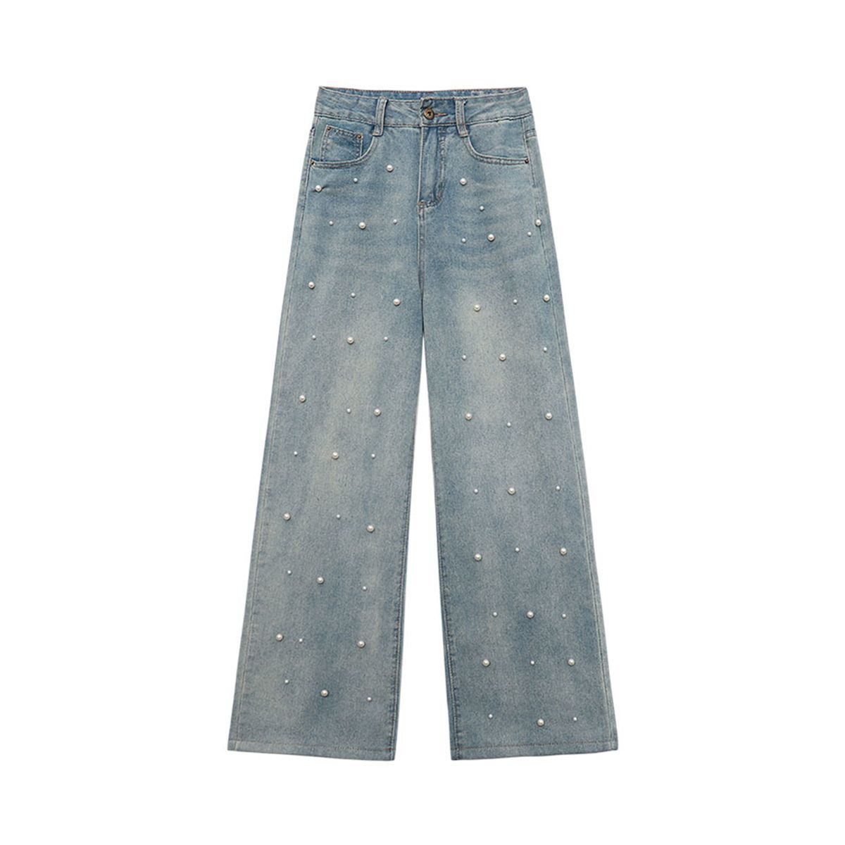 미국 레트로풍 헤비 펄 장식 와이드 레그 데님 팬츠 여성 여름 인스타 감성 하이웨이스트 루즈핏 스트레이트 롱 팬츠 트렌디스토어 가기