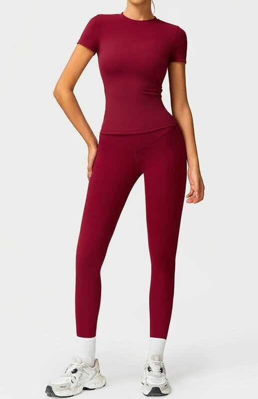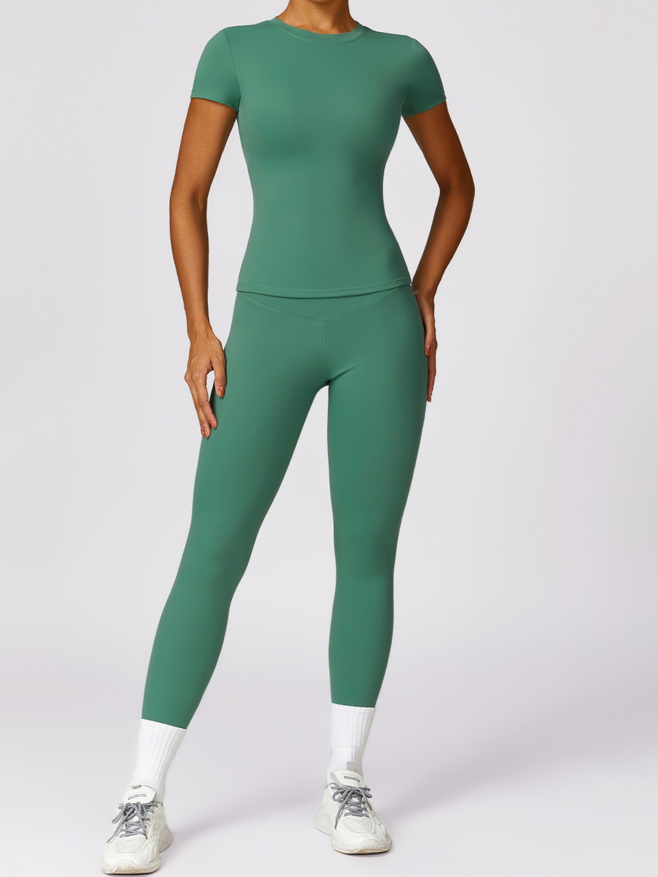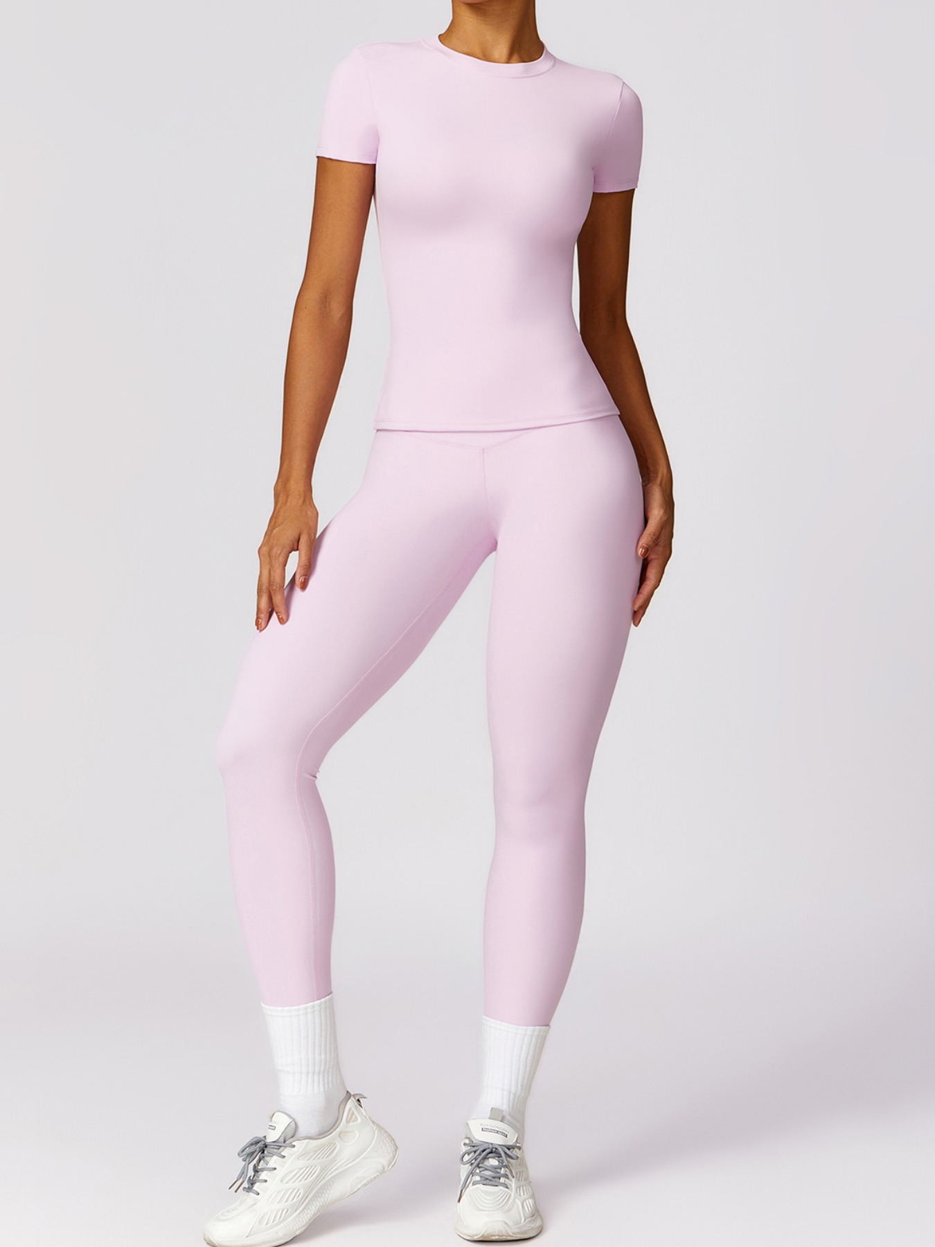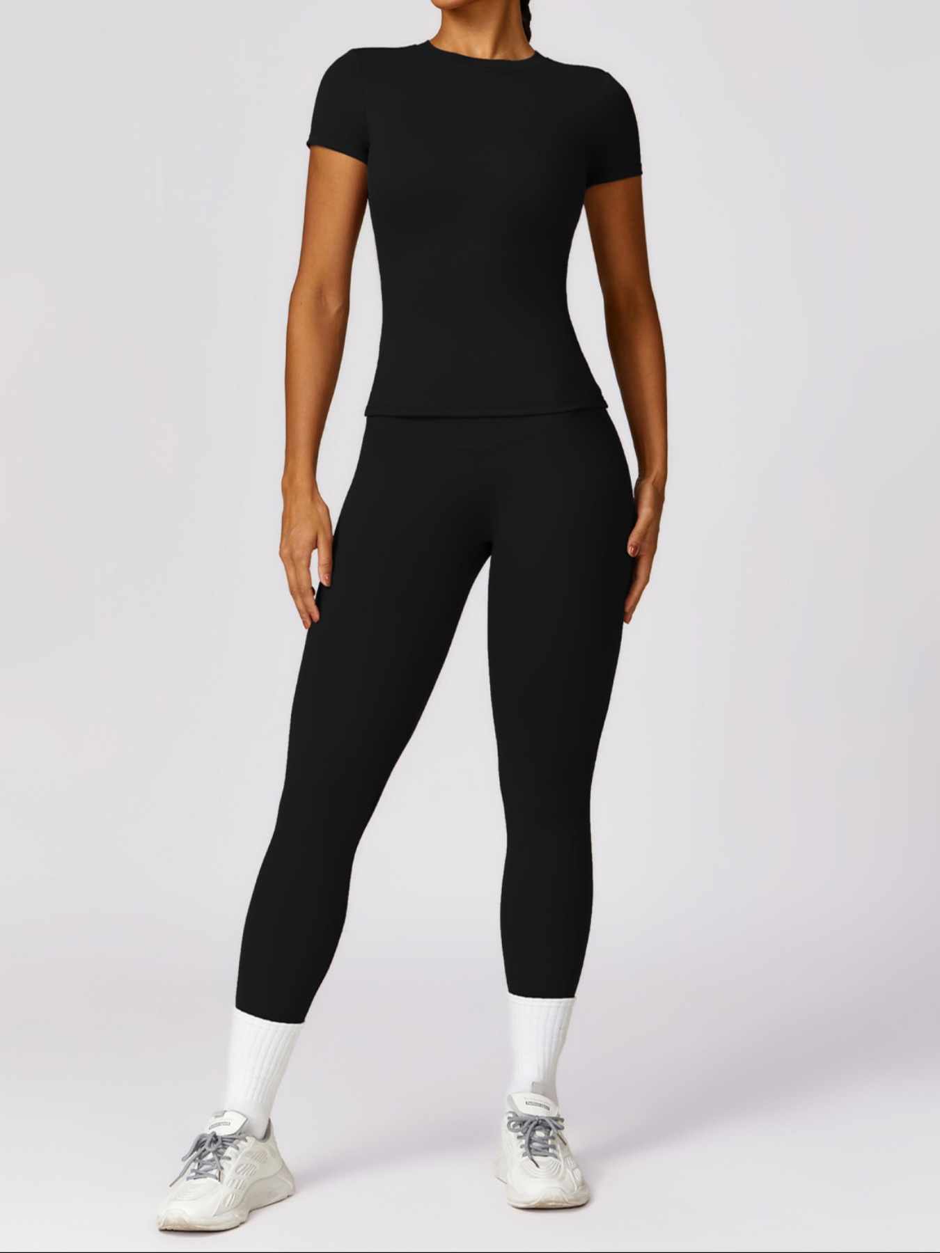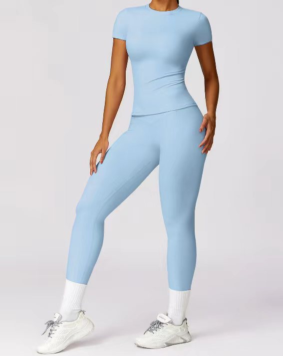 티셔츠 여성용 퀵 드라이 요가 피트니스 착용 야외 달리기 스포츠 라운드 넥 타이트 슬림 핏 반팔 슬림 핏 바지 세트