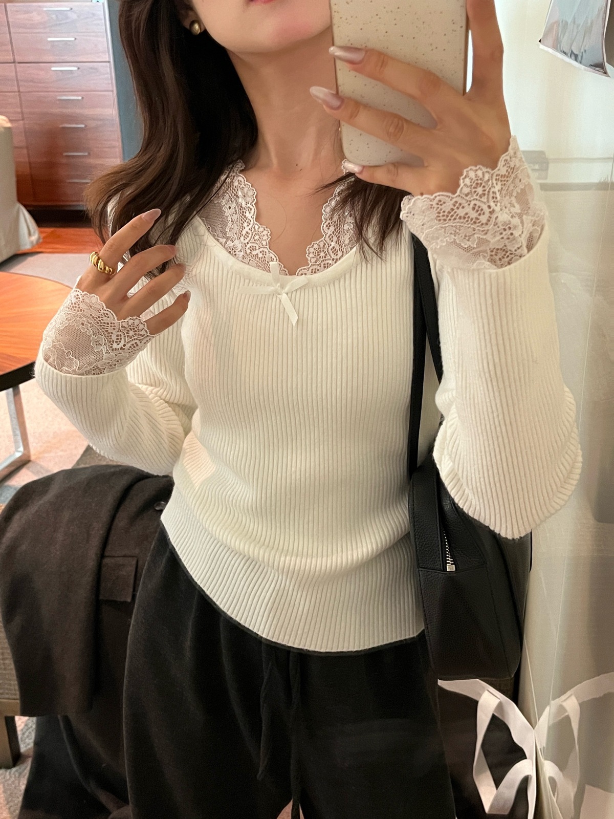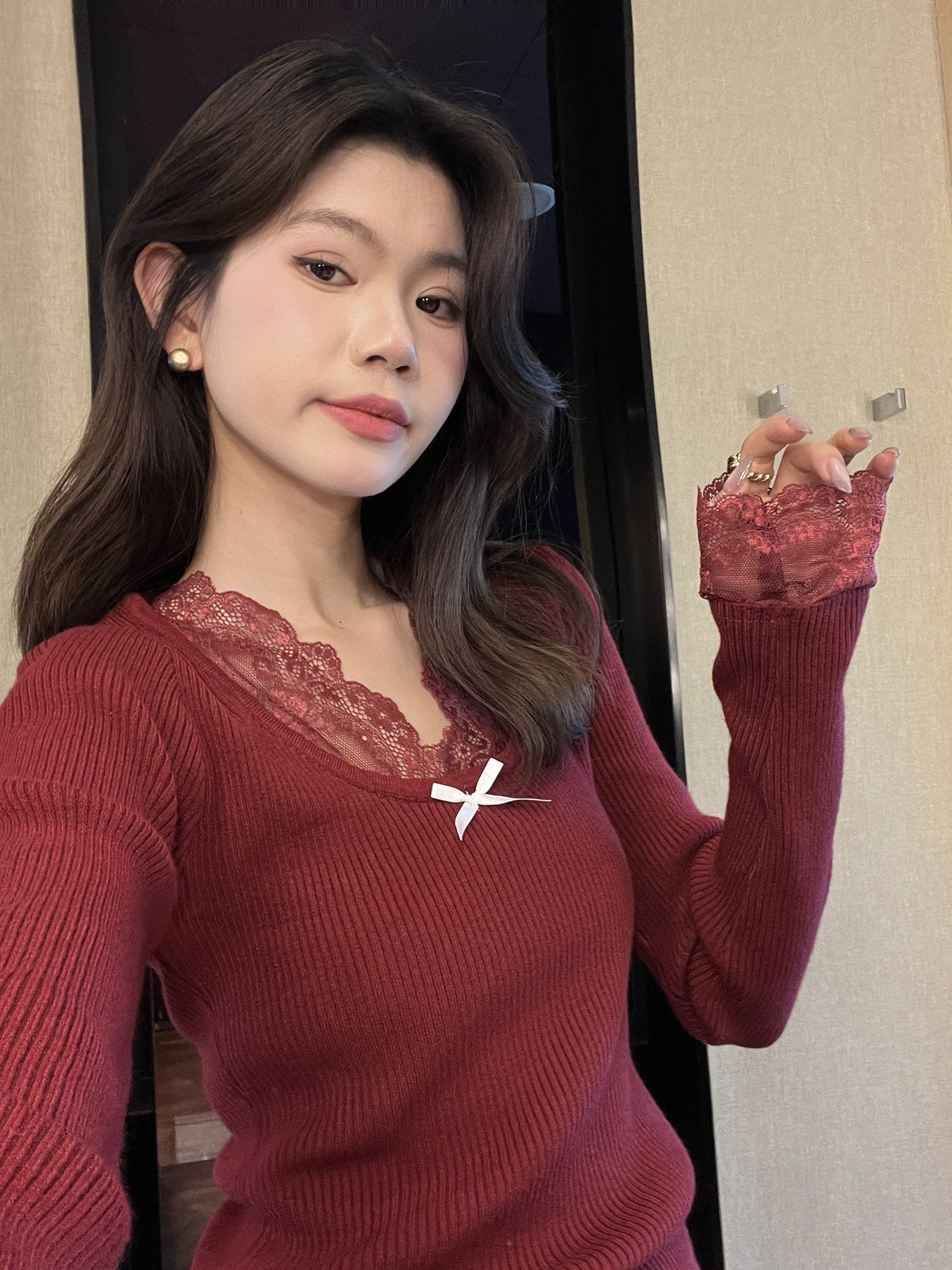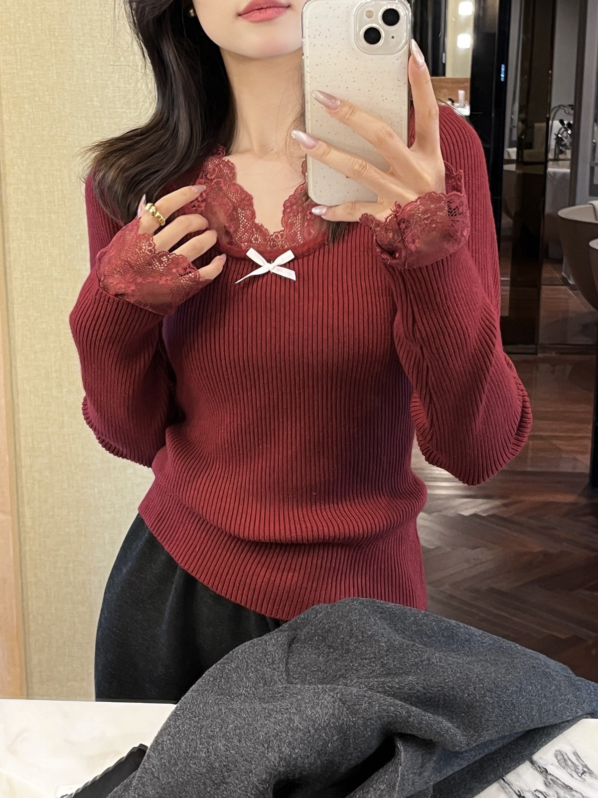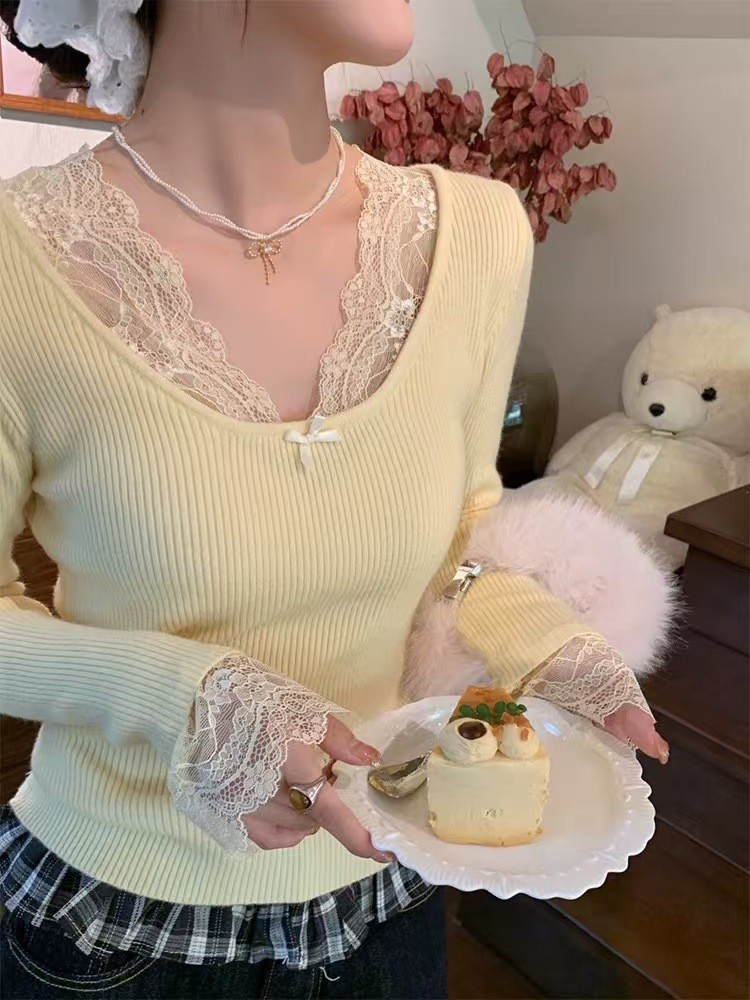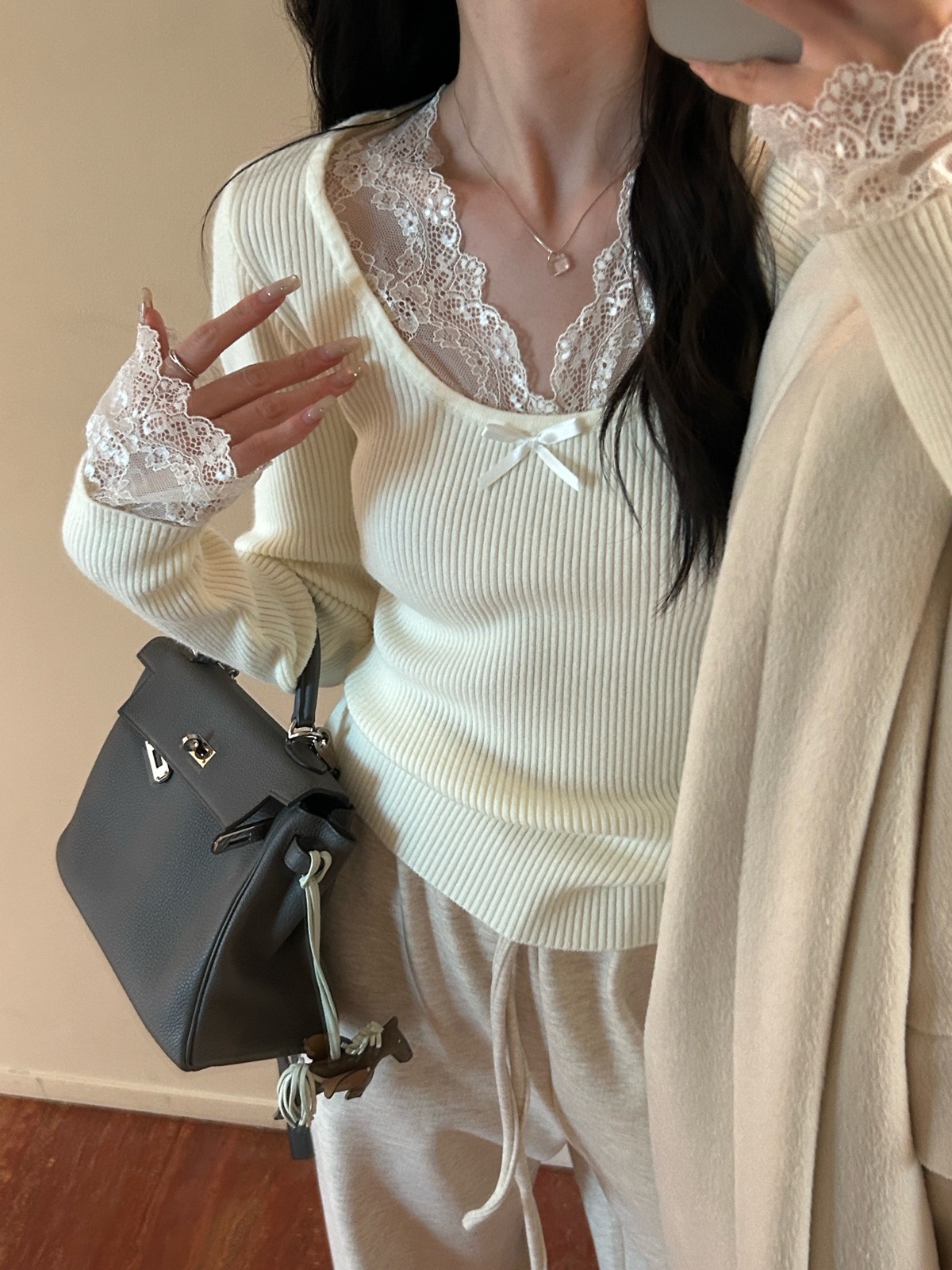 Kaiyidai 가을과 겨울 프랑스 레이스 스티칭 슬림 핏 슬림 스웨터 크리스마스 신년베이스 순수한 여성을 입고 싶어스토어 가기