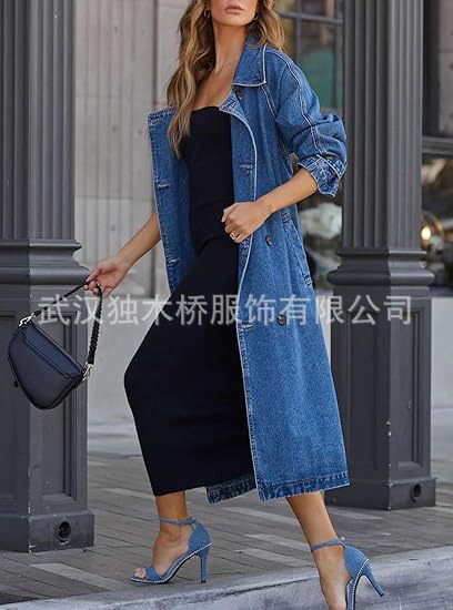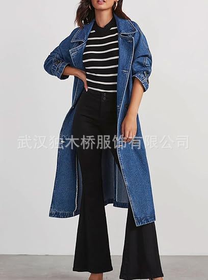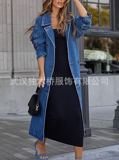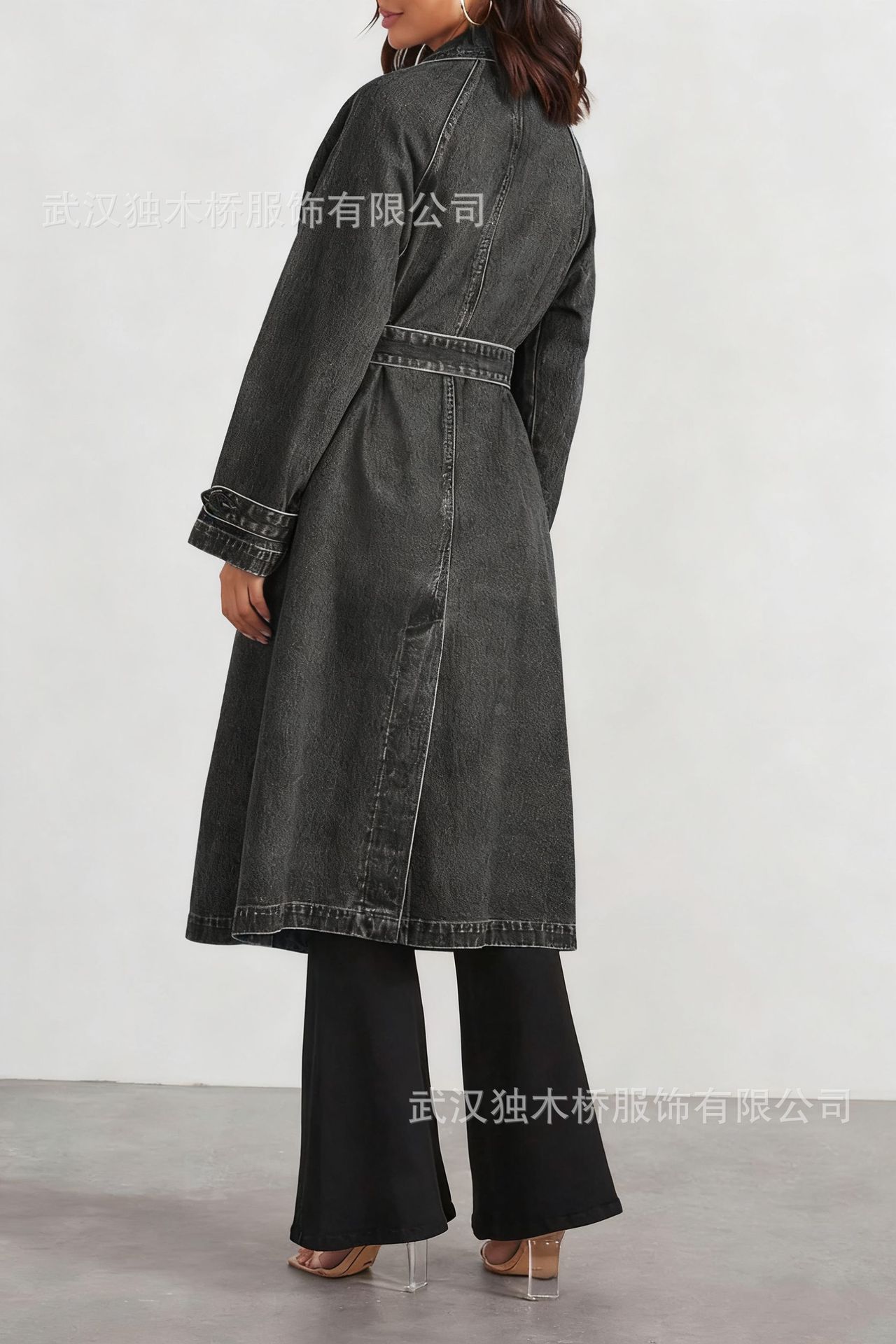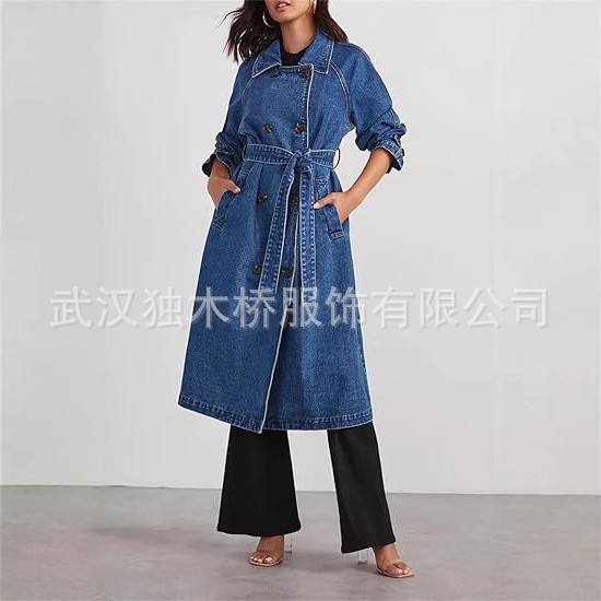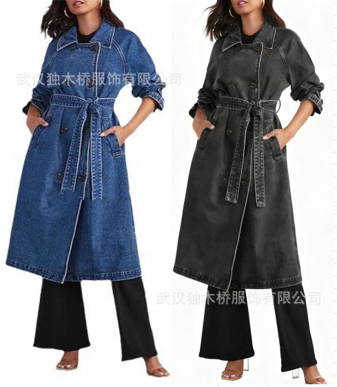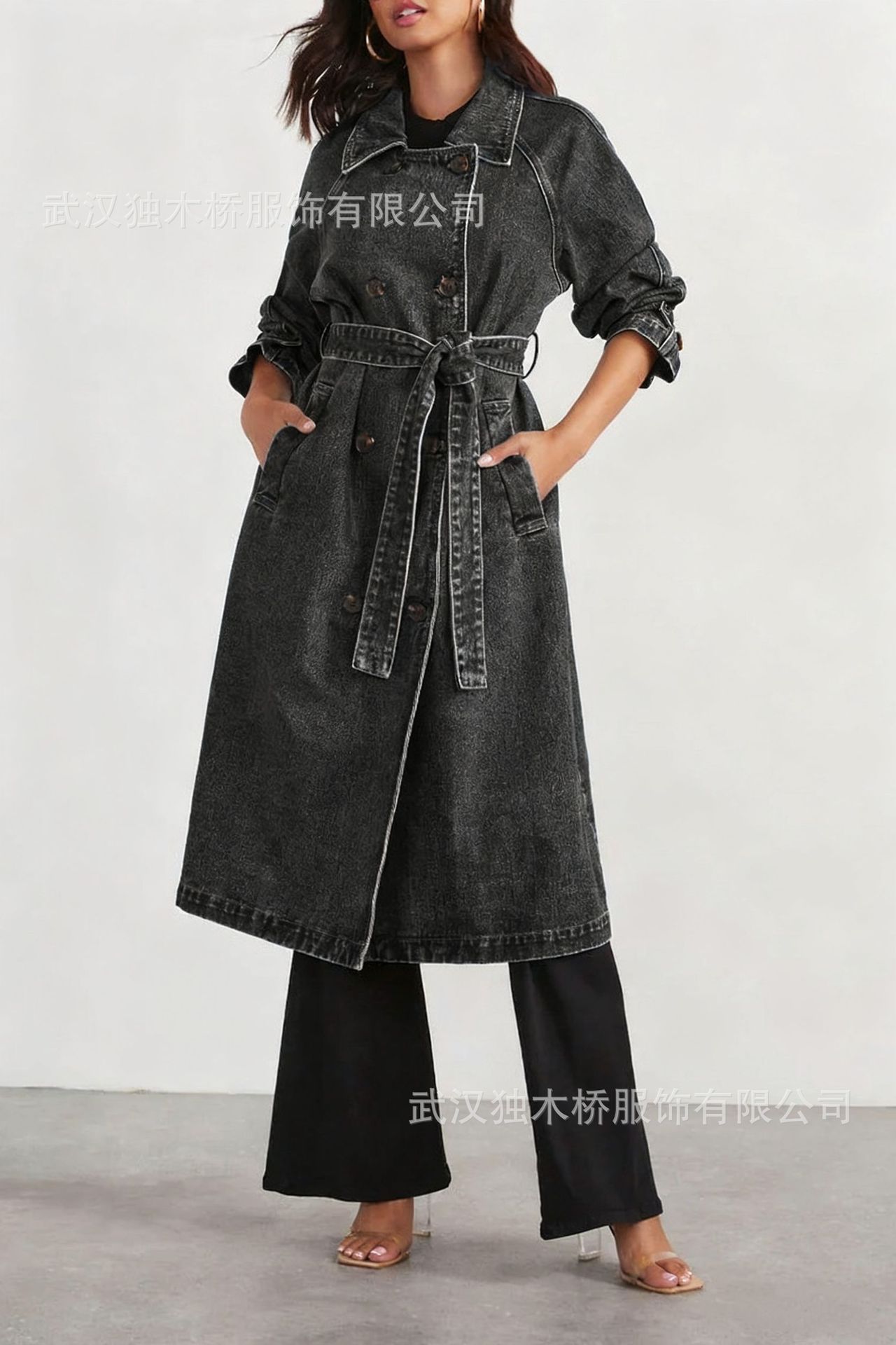 2025 새로운 유럽과 미국의 가을과 겨울 여성 트렌치 코트 데님 단색 더블 포켓 긴 버클 느슨한 코트스토어 가기