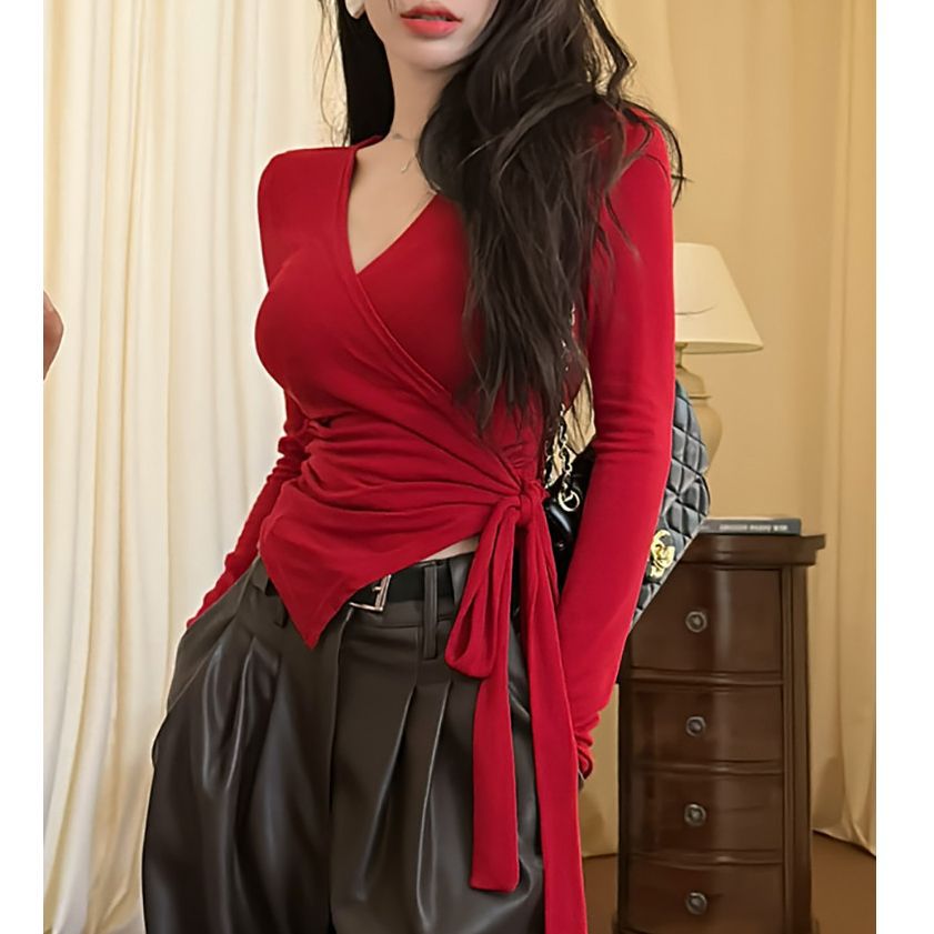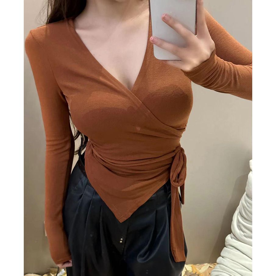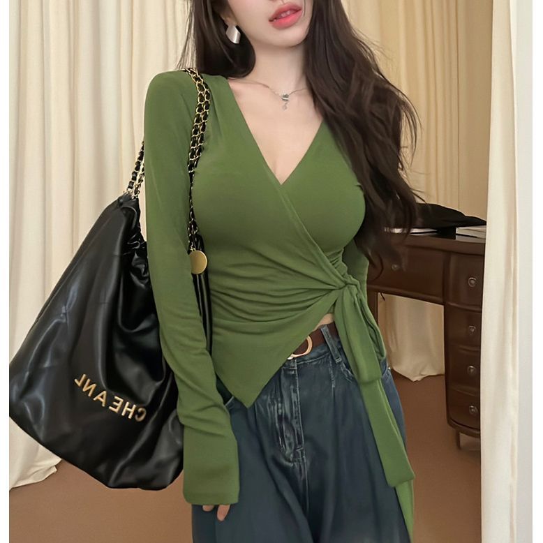 순수한 욕망 긴팔 V 넥 스파이스 소녀 티셔츠 여성용 가을 착용 타이트한 허리 슬림핏 슬림핏 섹시 탑 불규칙한 스트랩 작은 셔츠스토어 가기