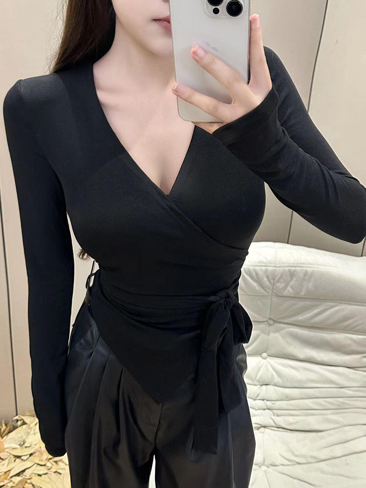 순수한 욕망 긴팔 V 넥 스파이스 소녀 티셔츠 여성용 가을 착용 타이트한 허리 슬림핏 슬림핏 섹시 탑 불규칙한 스트랩 작은 셔츠