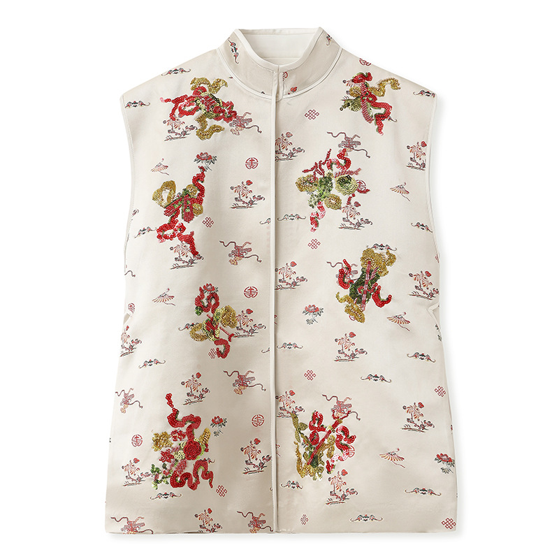 새로운 중국 스타일 국립 스타일 라이트 럭셔리 칼라 비드 자수 민소매 세퀸 루즈 셔츠 조끼 긴 원피스 세트 MZ055스토어 가기