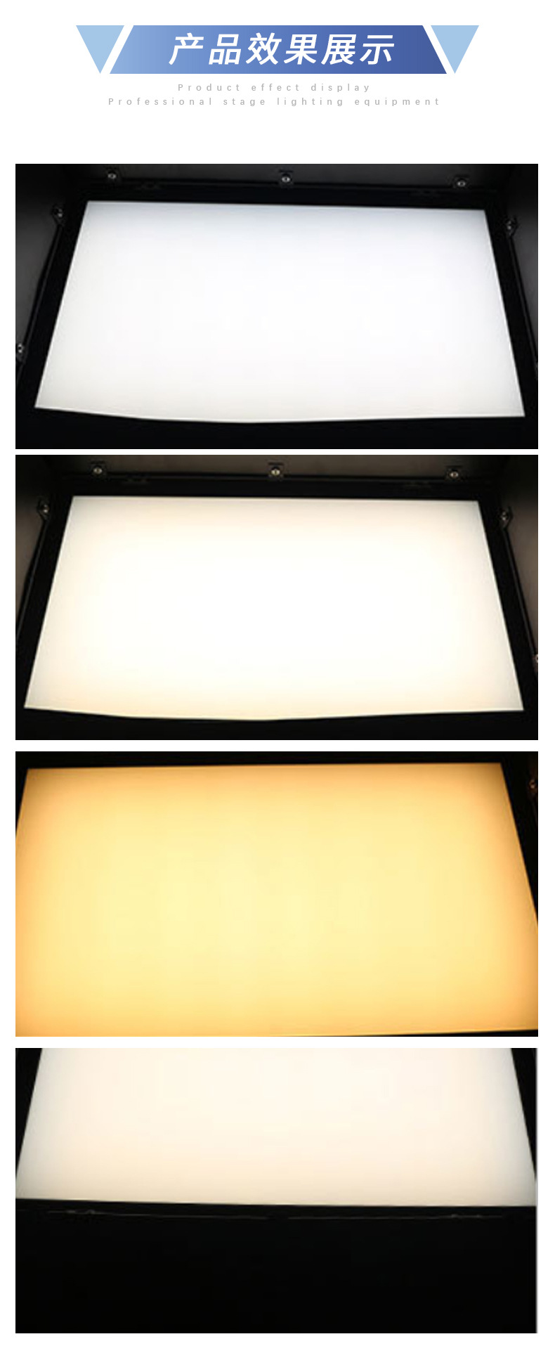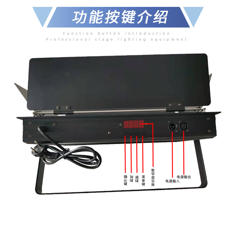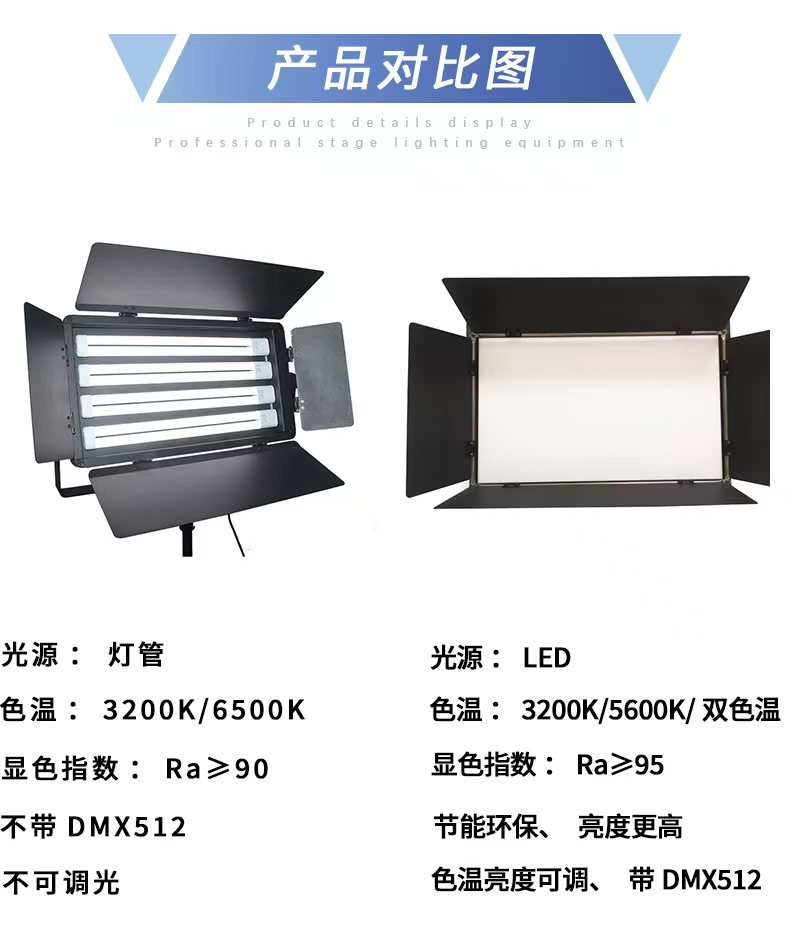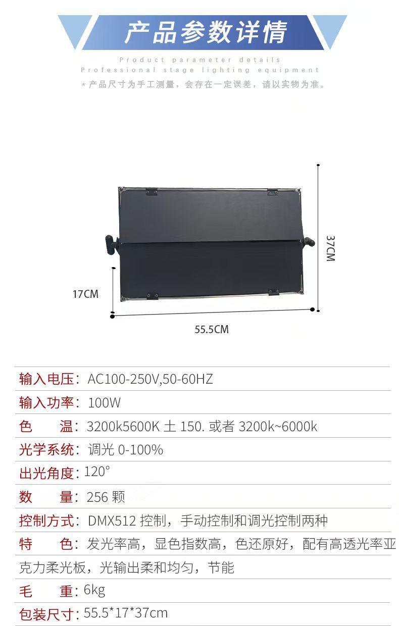 电压:AC220V,50-60HZ;功率:110W;灯珠:5730贴片灯珠;数量:256颗;运行模式:自亮,DMX512信号,可调光;流明值:60-65LM;色温:3200K或5600K可选;显色值:92;特点:发光率高,可形成大面积发光矩阵,显色指数高,色还原好,配有高透光率亚克力柔光板,光输出柔和均匀,无有害红外线、无眩光、无闪烁、不刺眼,自然散热,环保节能,超长寿命,运行费用低,比传统的三基色节能50%