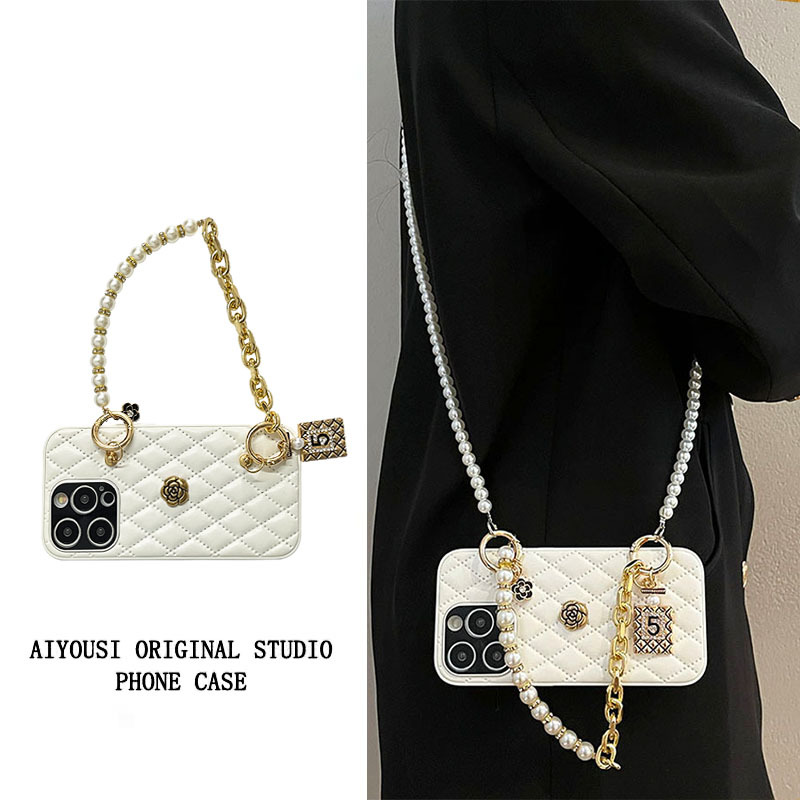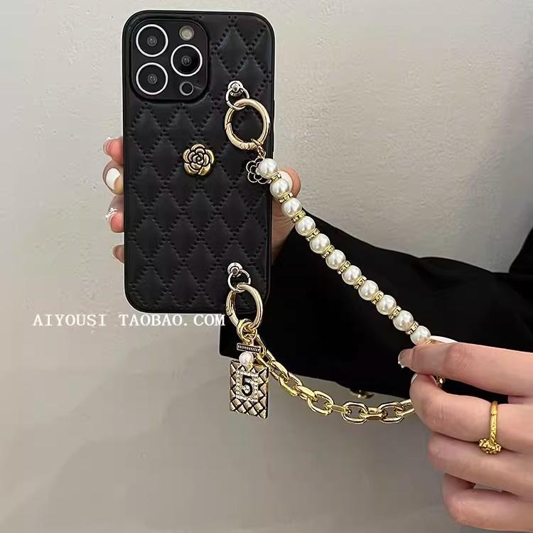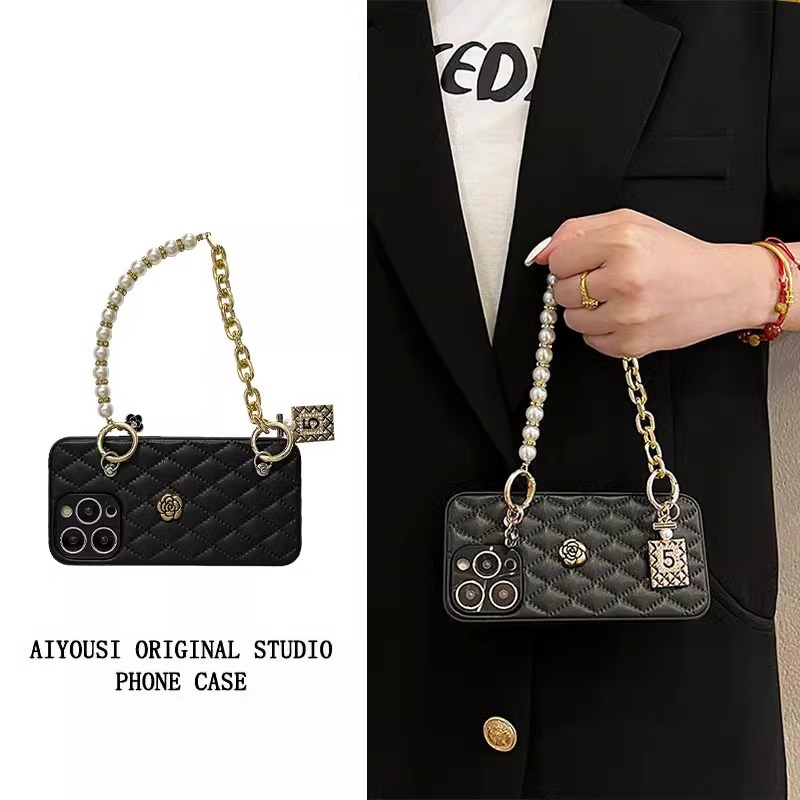 고급스러운 작은 향기 스타일 가죽 동백꽃 핸드 체인, 애플 16프로맥스 크로스바디 15 휴대폰 케이스 17PM에 적합