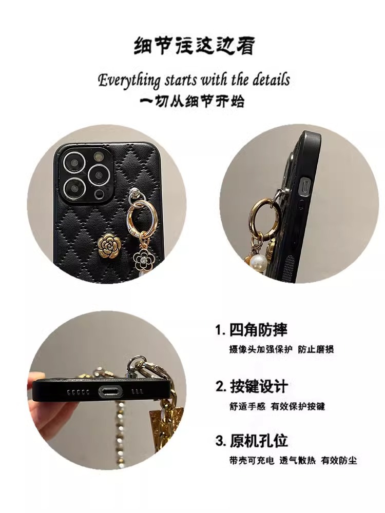 고급스러운 작은 향기 스타일 가죽 동백꽃 핸드 체인, 애플 16프로맥스 크로스바디 15 휴대폰 케이스 17PM에 적합스토어 가기