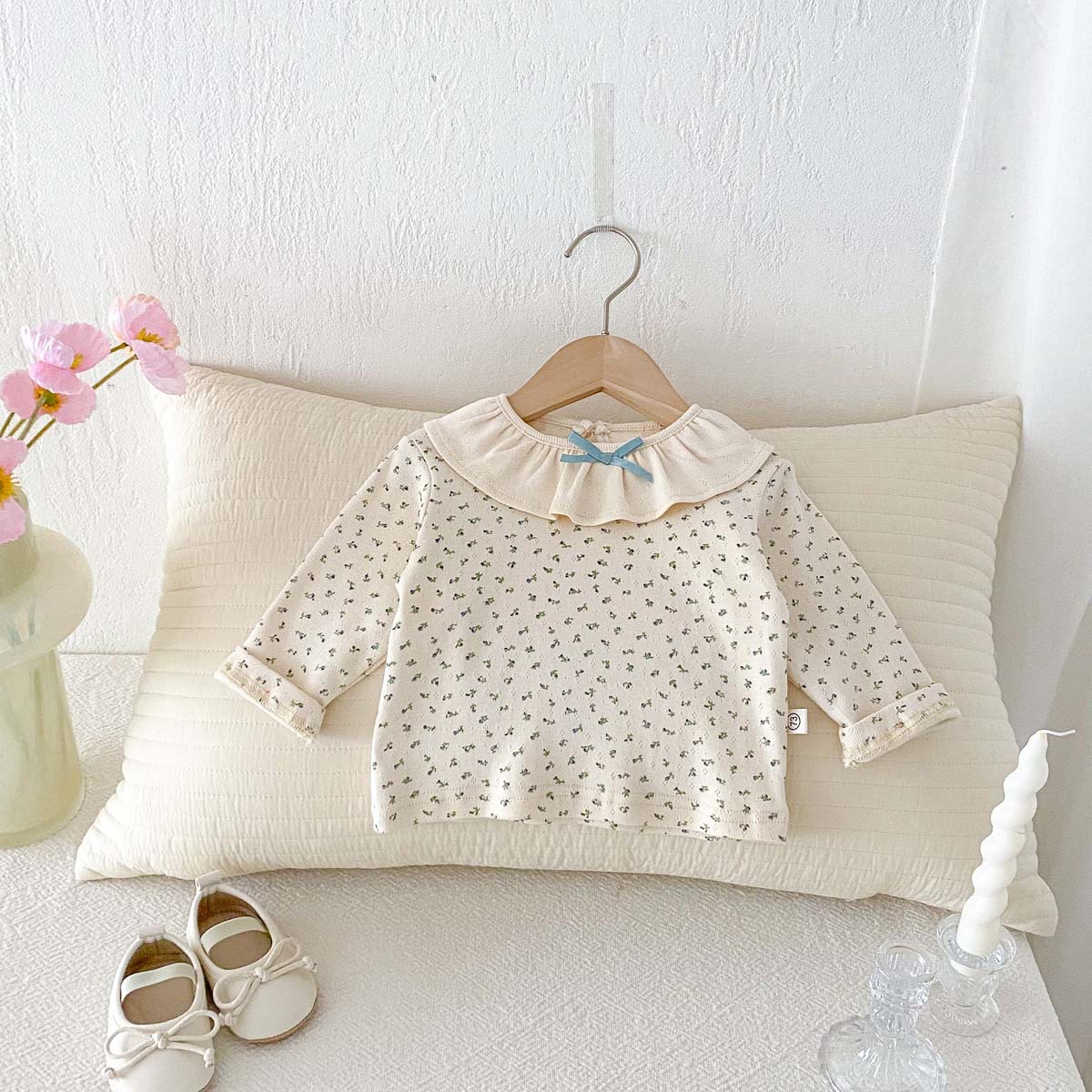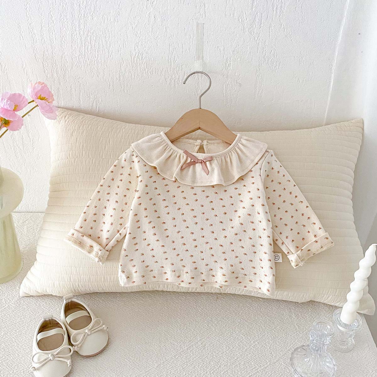 소녀의 봄과 가을 새로운 긴팔 인쇄 탑 아기 인형 칼라 올매치 베이스 셔츠 달콤한 활 티셔츠