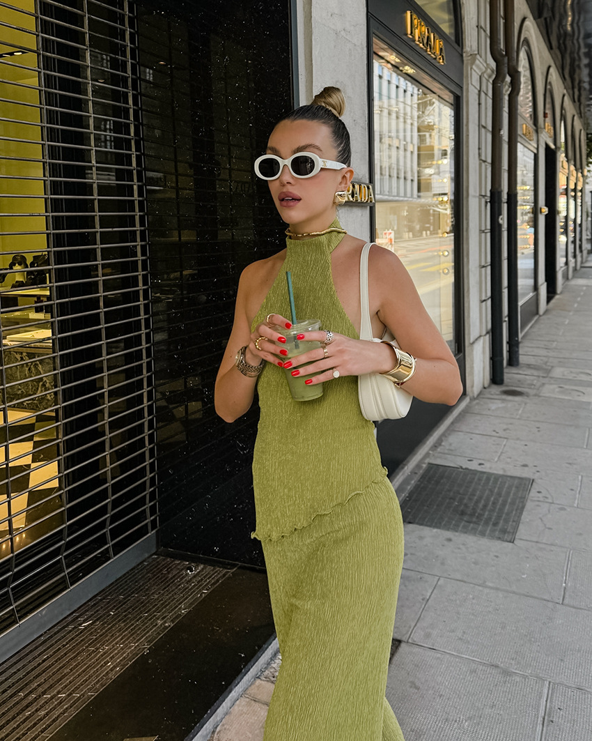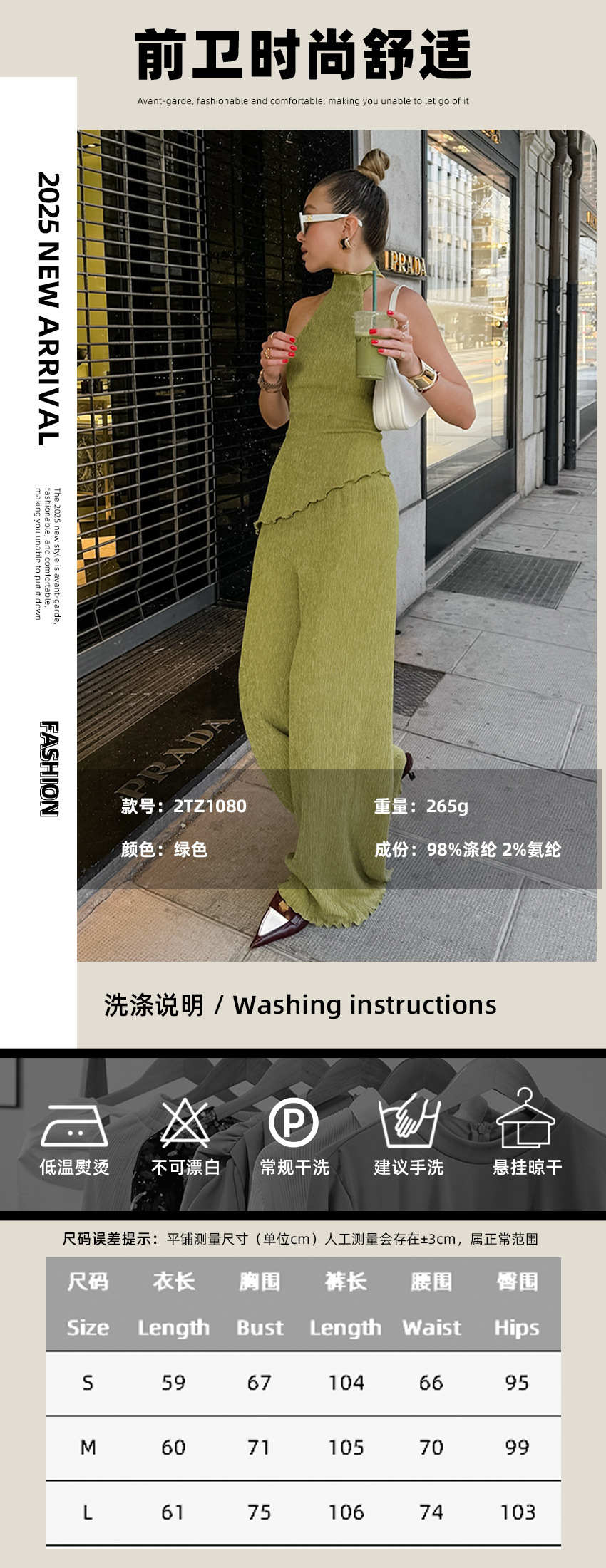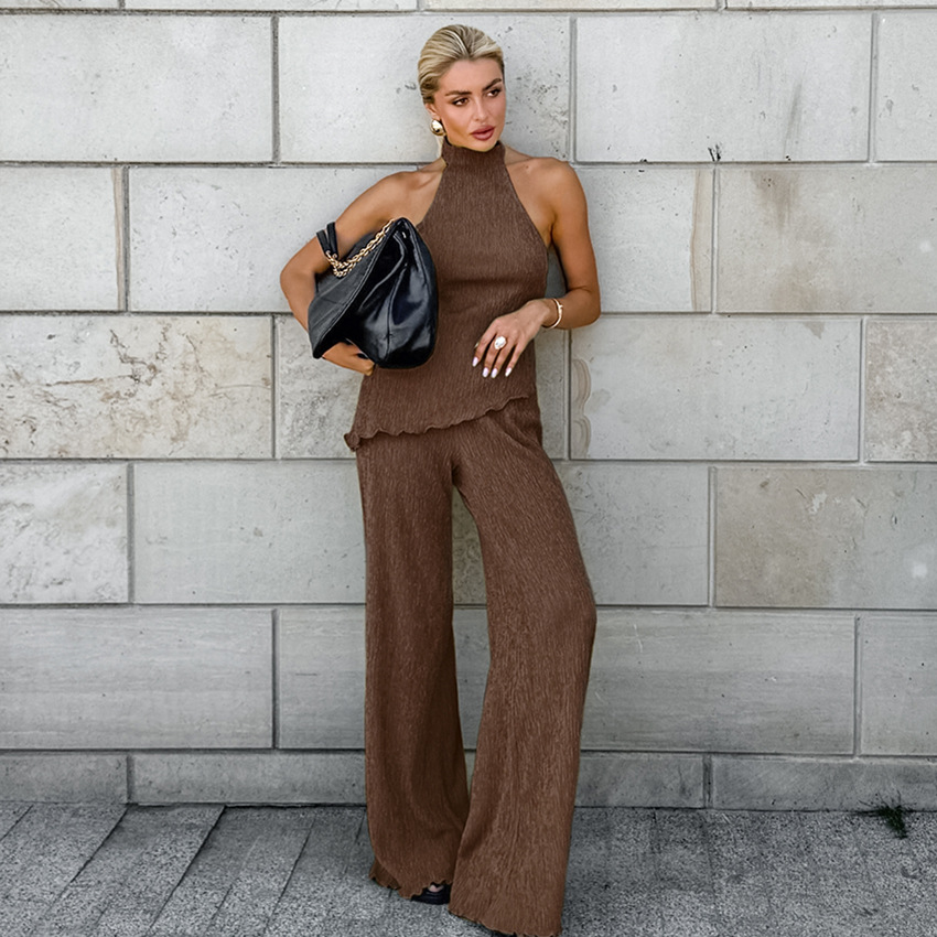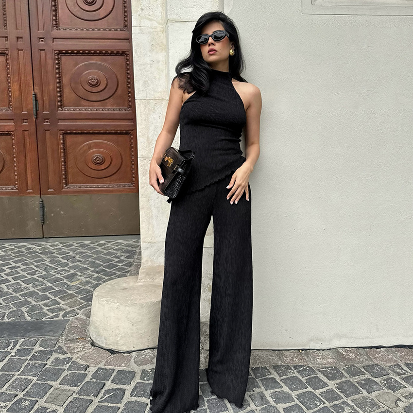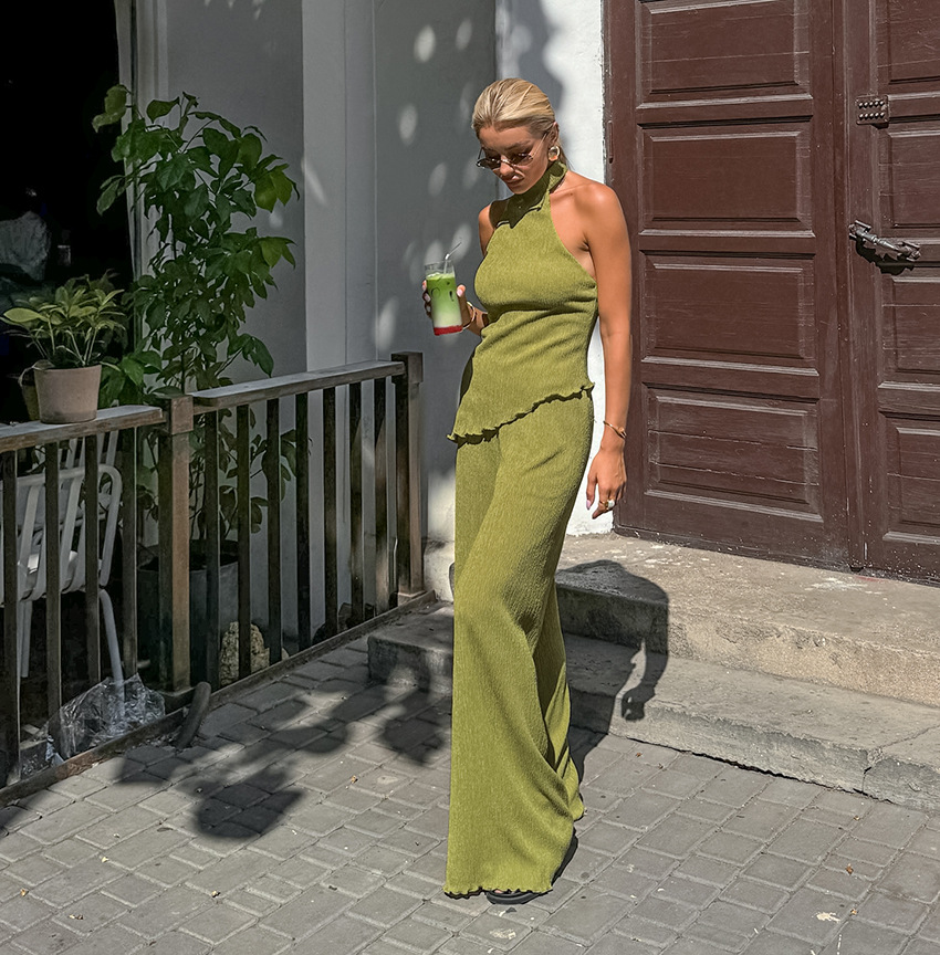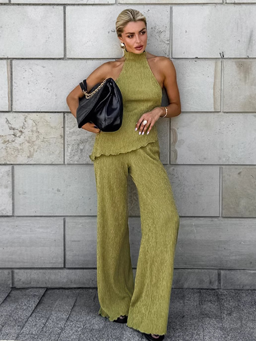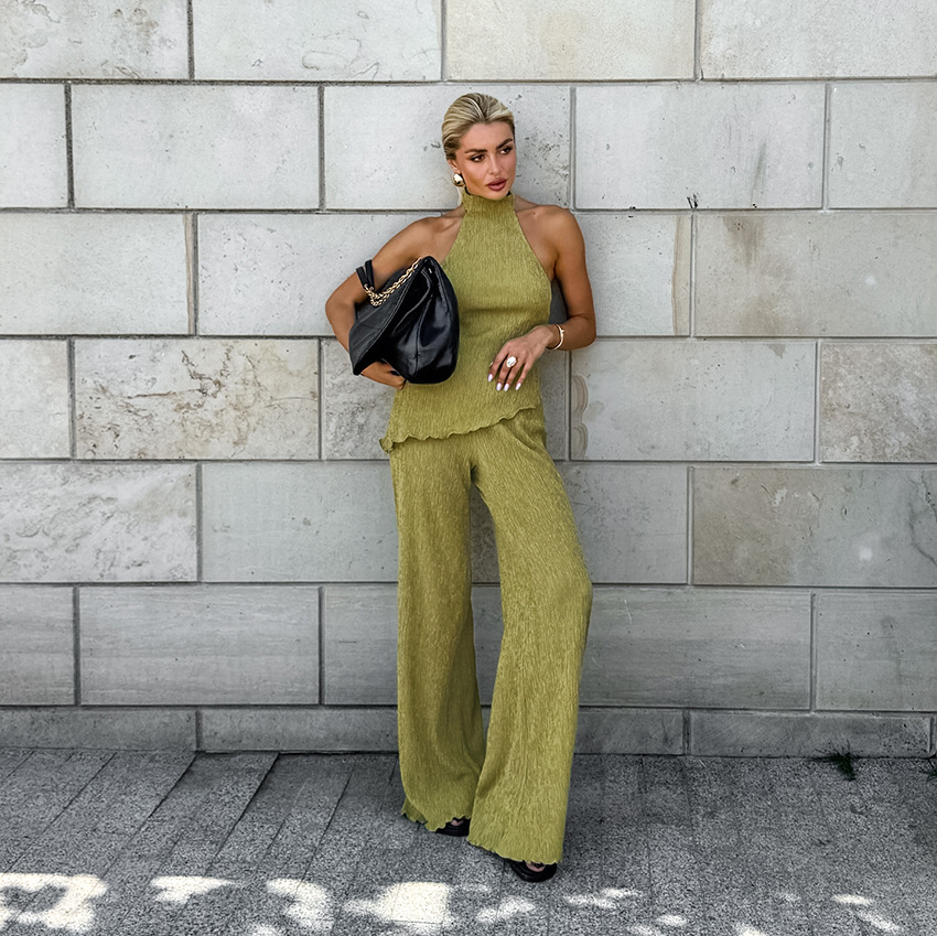 프랑스 패션 그린 플리츠 슈트 2025 가을 대외 무역 홀터 탑 와이드 레그 팬츠 투피스 통근 여성 의류스토어 가기