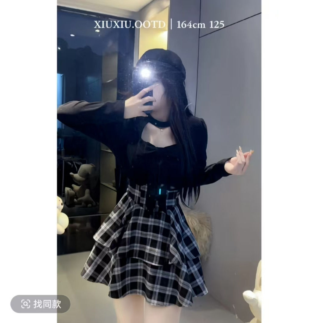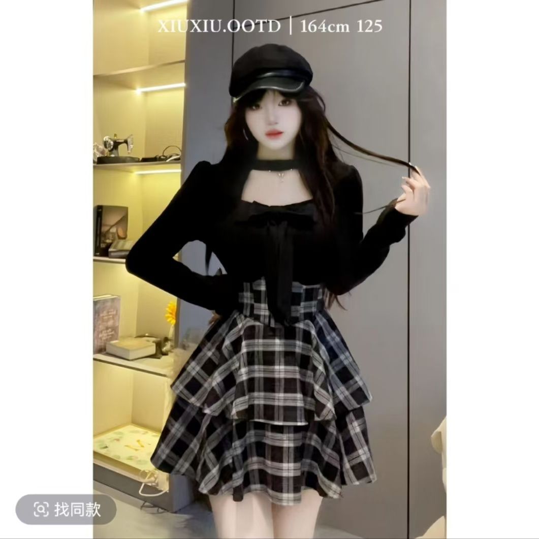 • 검은색 상의 + 검은색 체크무늬 스커트