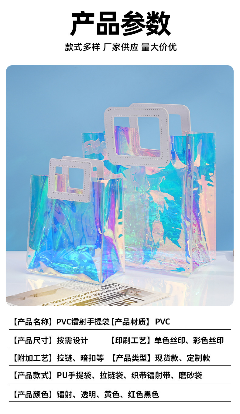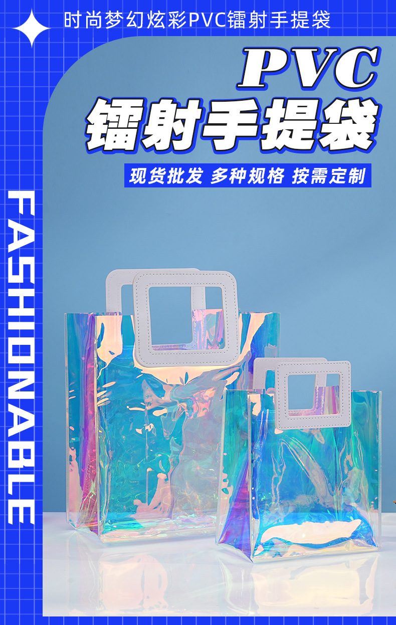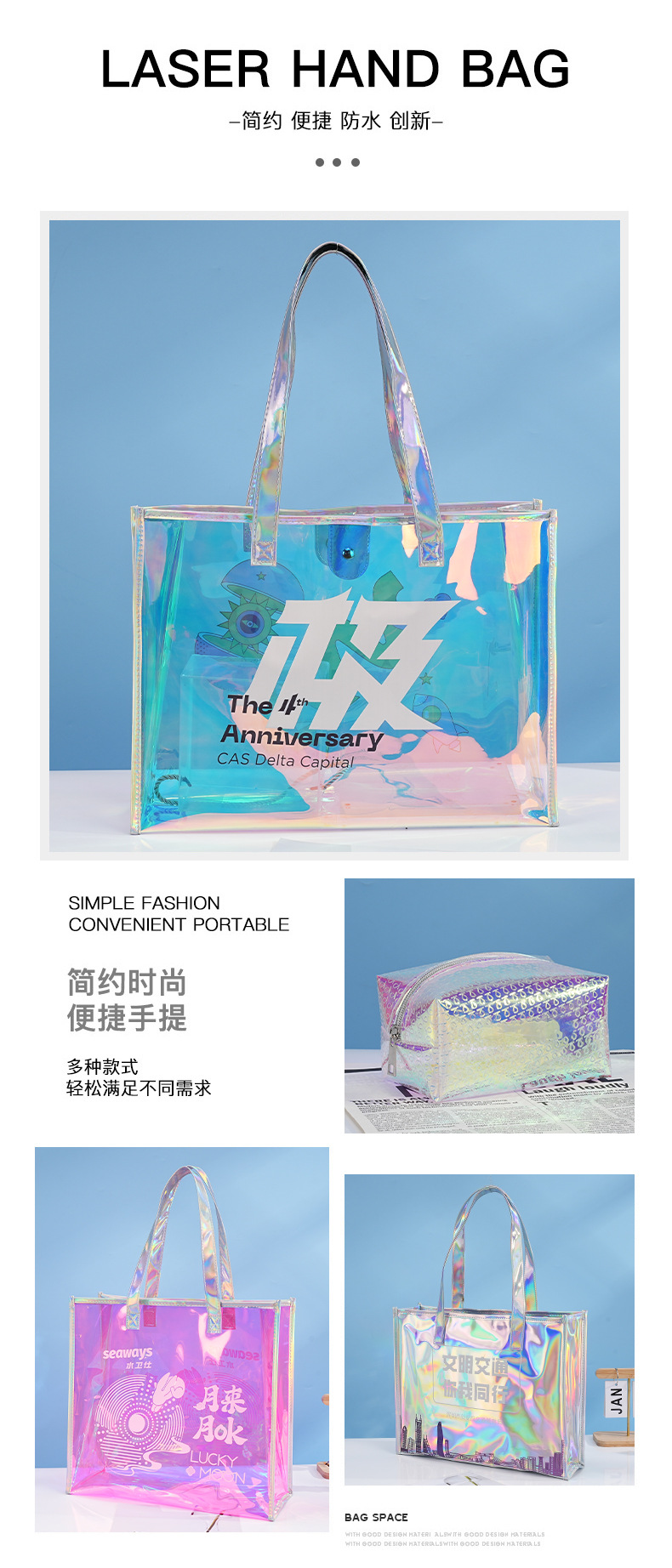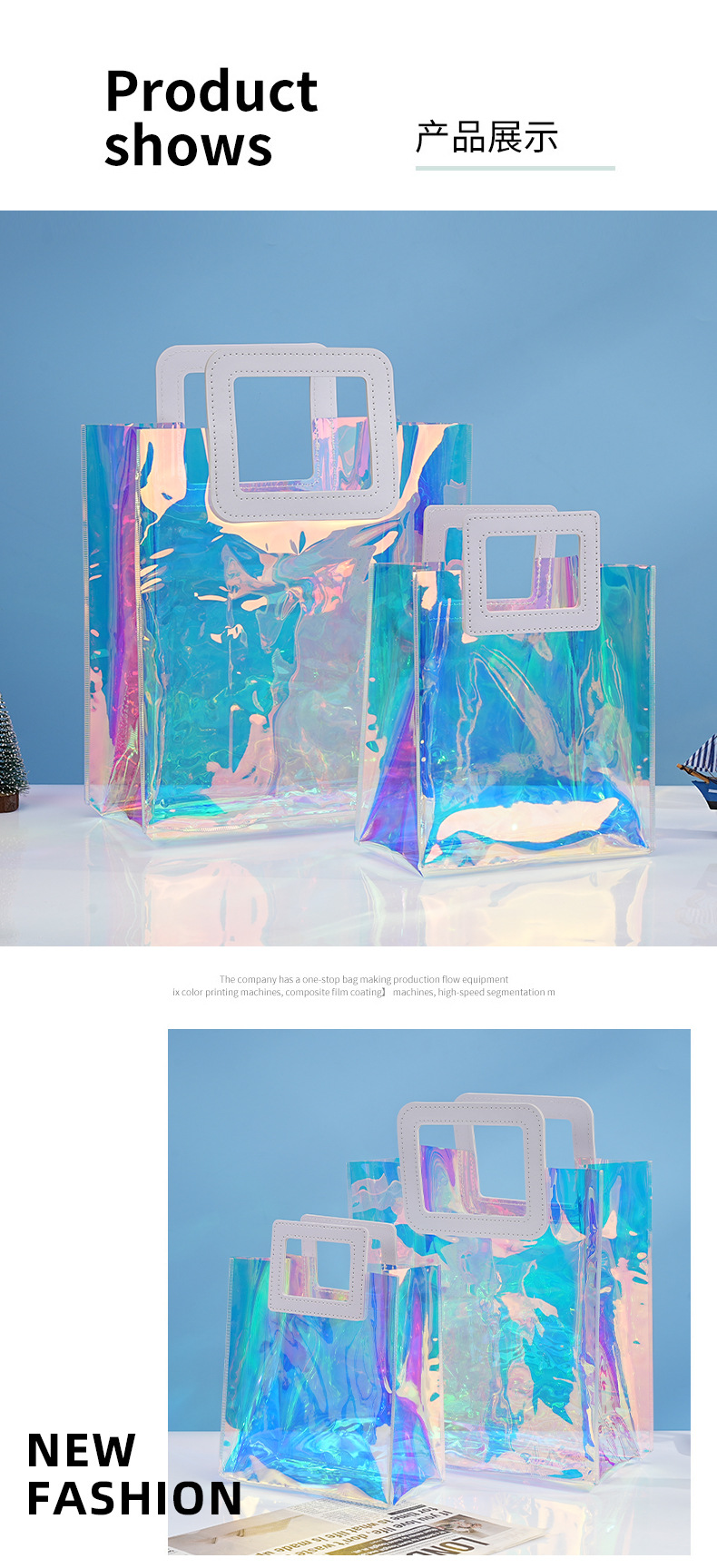 재고 도매 pvc 투명 레이저 토트 백 사용자 정의 로고 인쇄 높은 감각 레이저 선물 선물 가방스토어 가기
