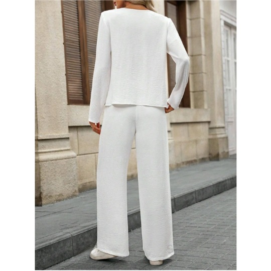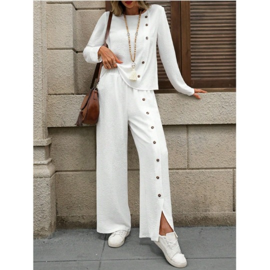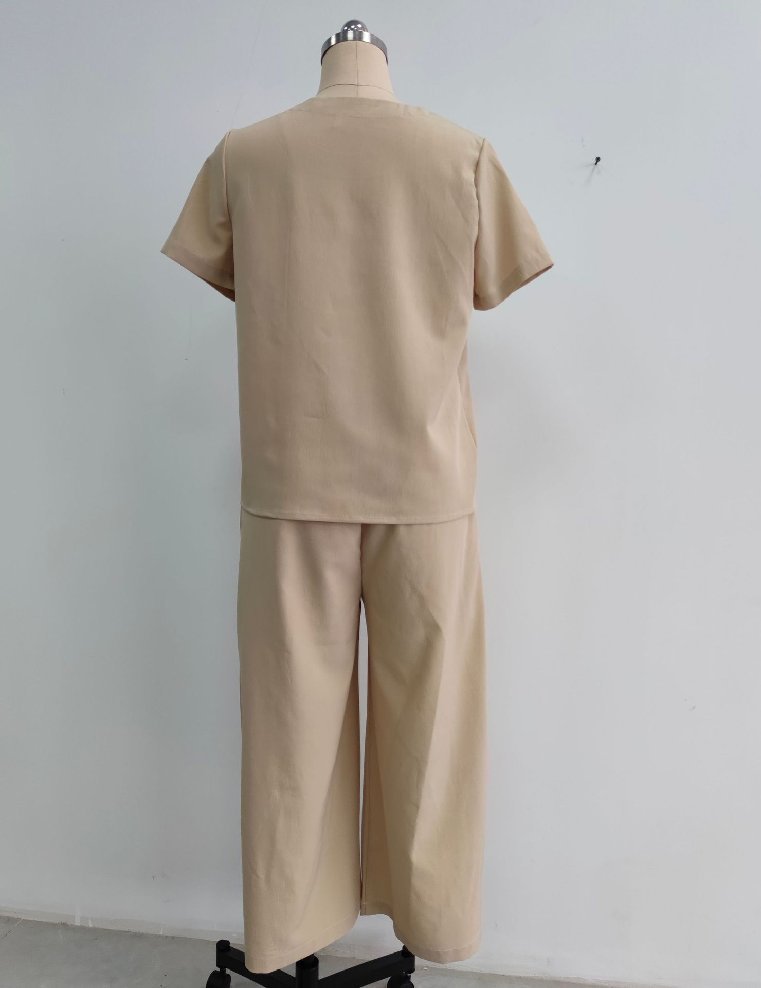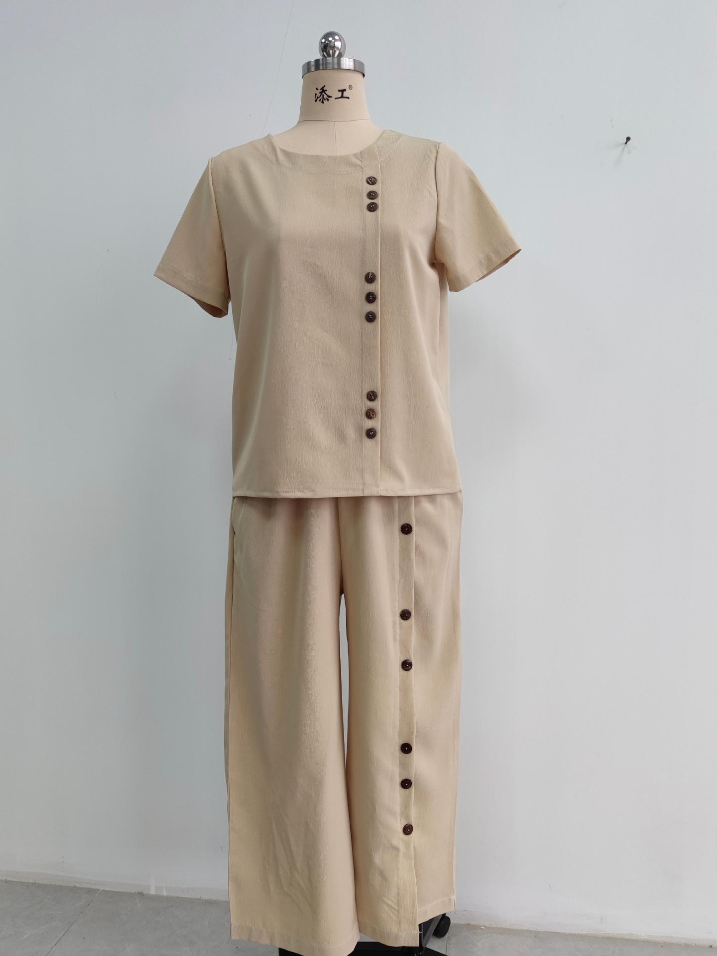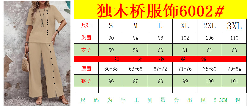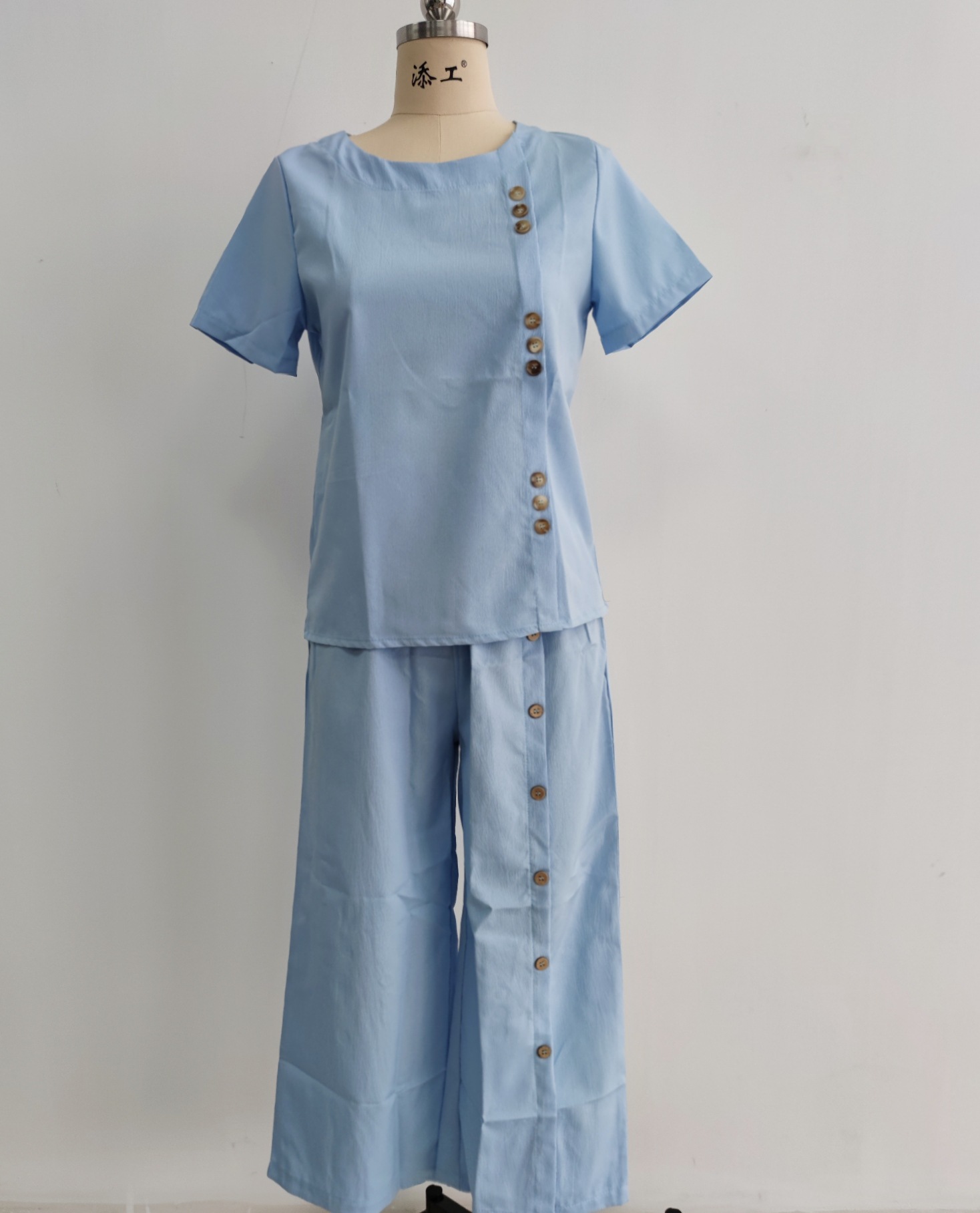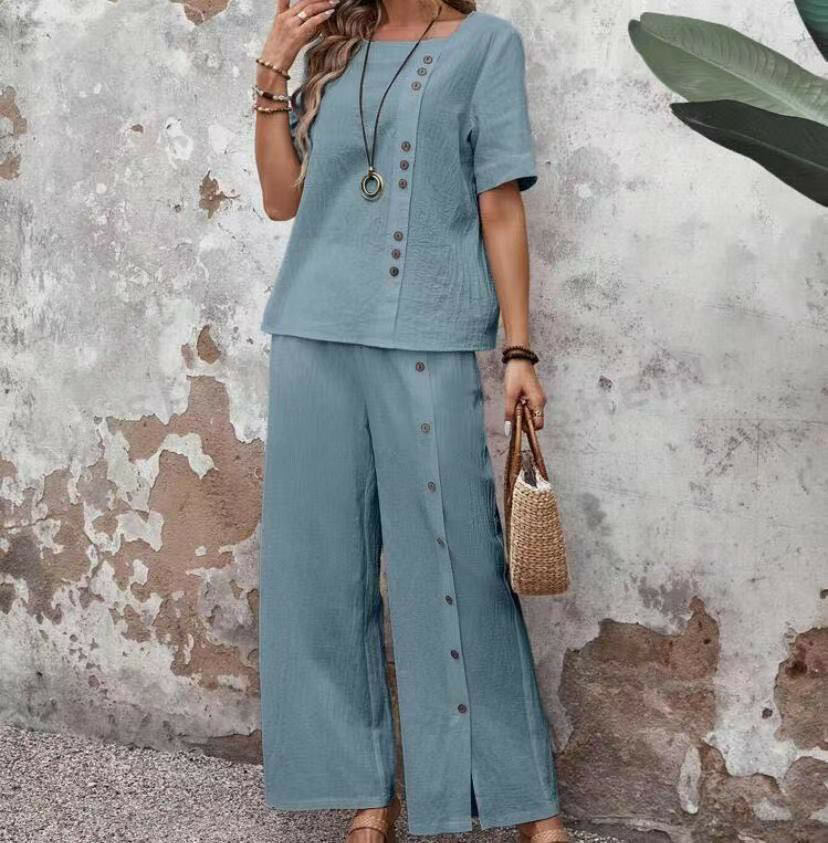 대외 무역 2025 폭발 면화 및 리넨 패션 캐주얼 루즈 투피스 반팔 탑 버튼 느슨한 와이드 레그 바지 여성용 의류