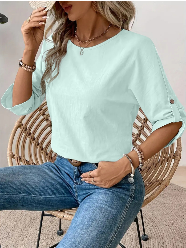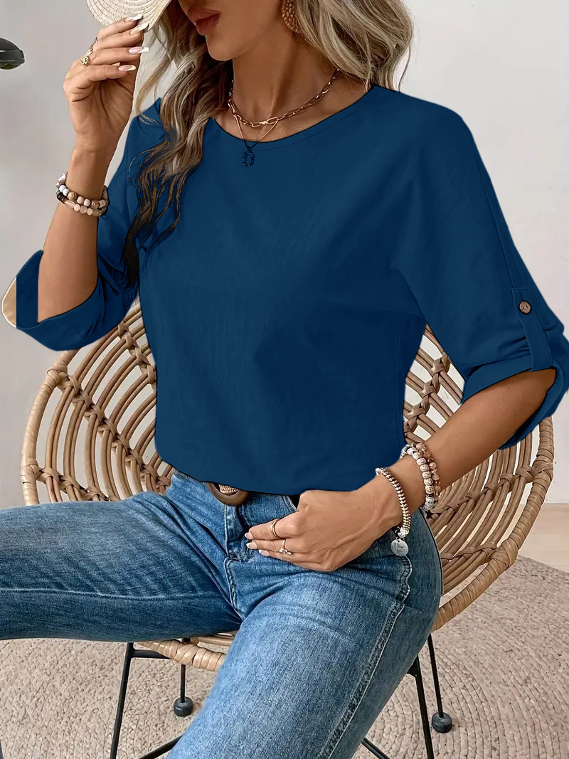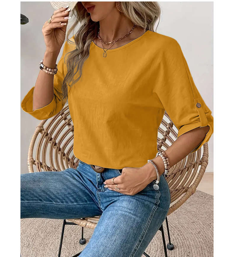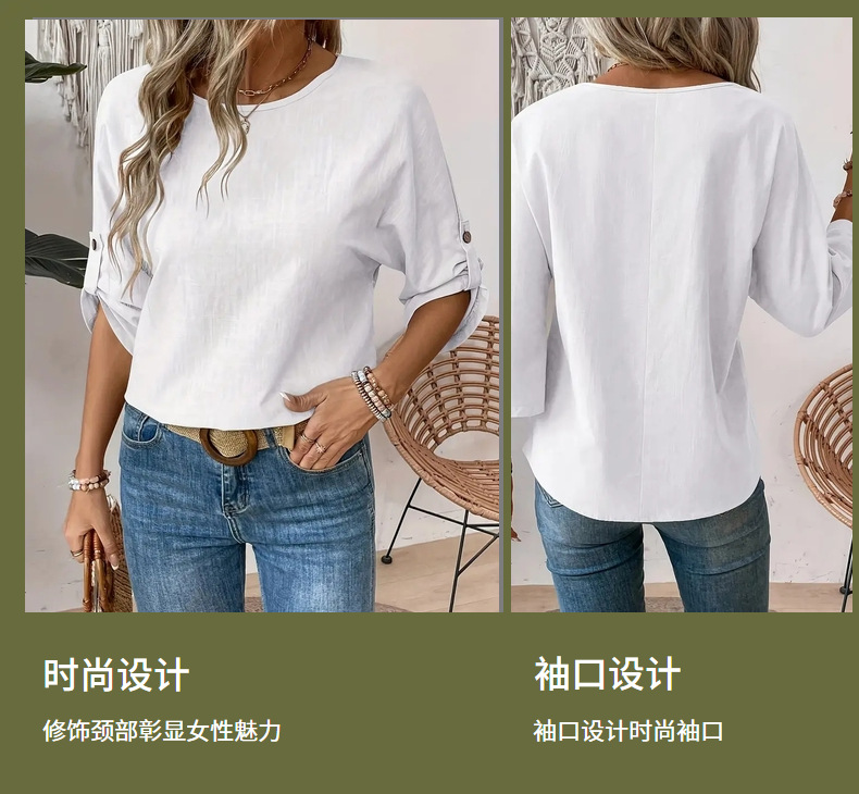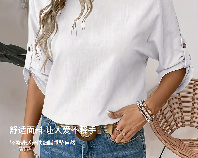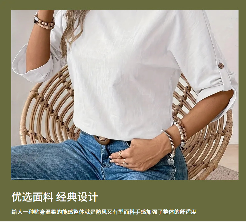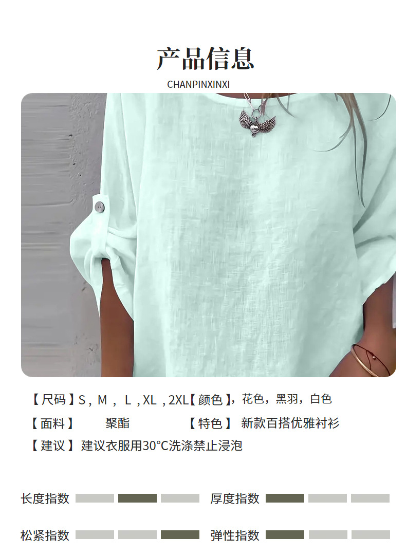 단색 라운드넥 셔츠, 캐주얼하고 패셔너블하며 심플한 디자인, 여성스러운 우아한 셔츠, 고급스러운 스타일, 캐주얼하고 다용도로 활용 가능