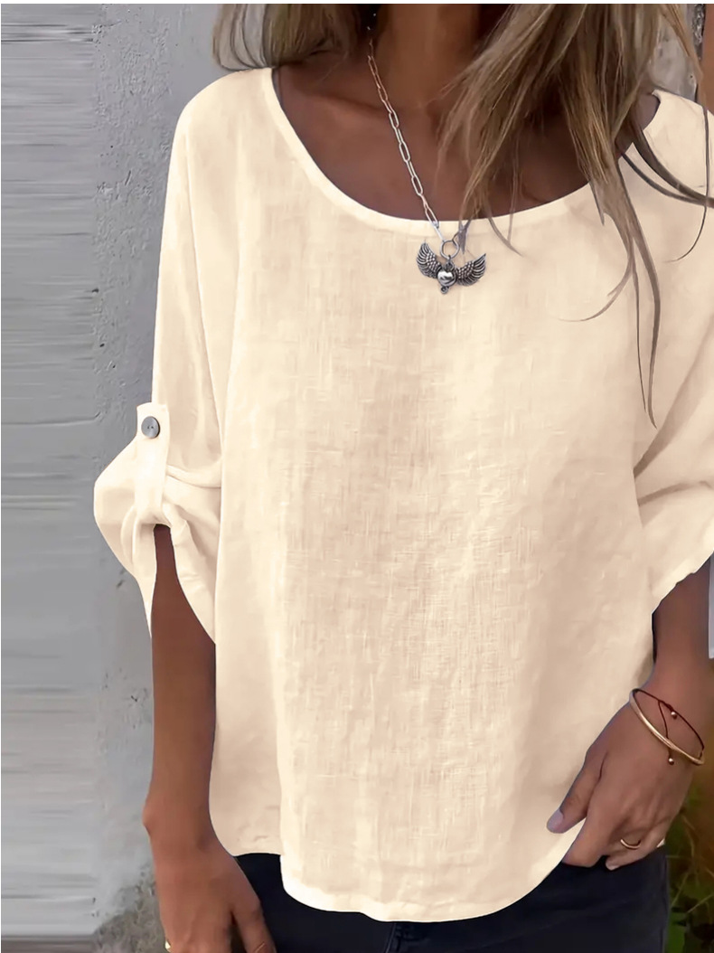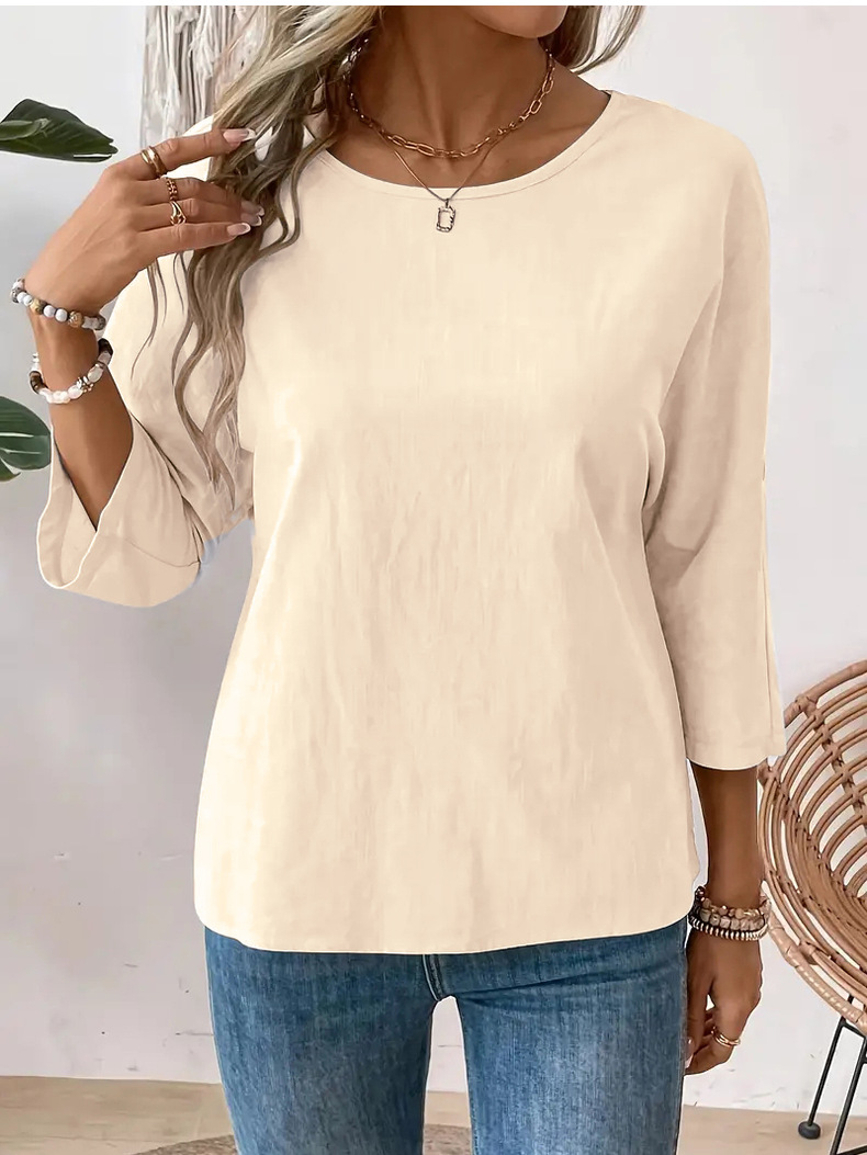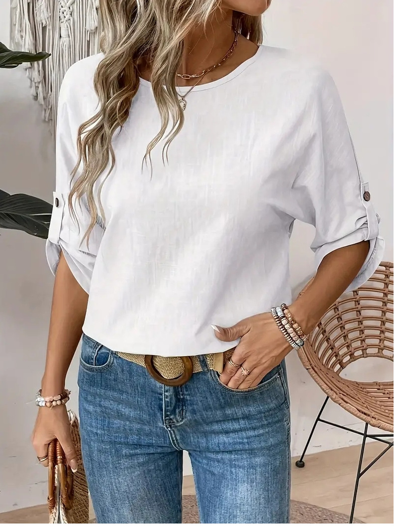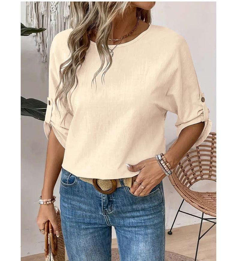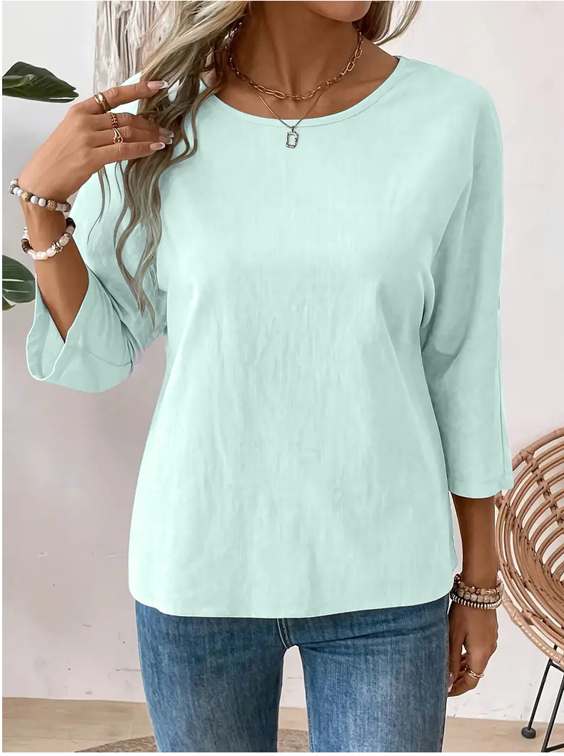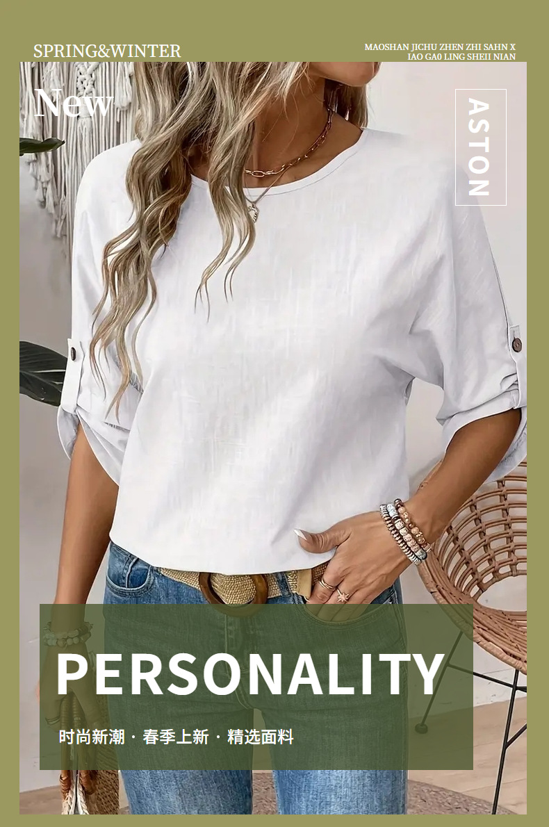 단색 라운드넥 셔츠, 캐주얼하고 패셔너블하며 심플한 디자인, 여성스러운 우아한 셔츠, 고급스러운 스타일, 캐주얼하고 다용도로 활용 가능