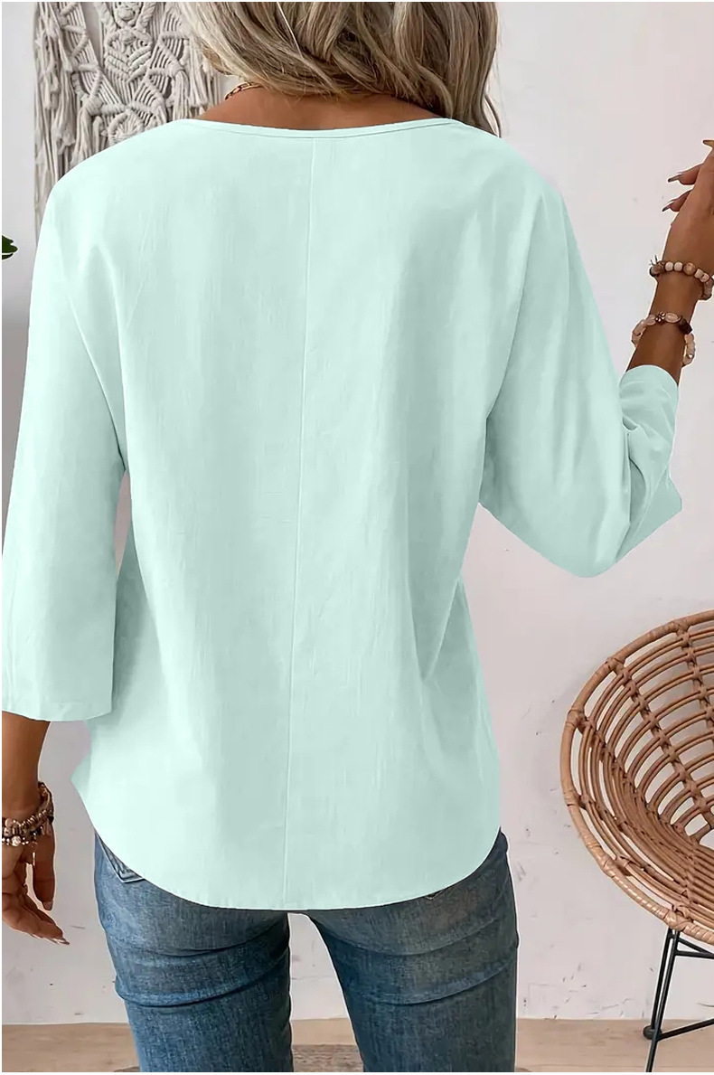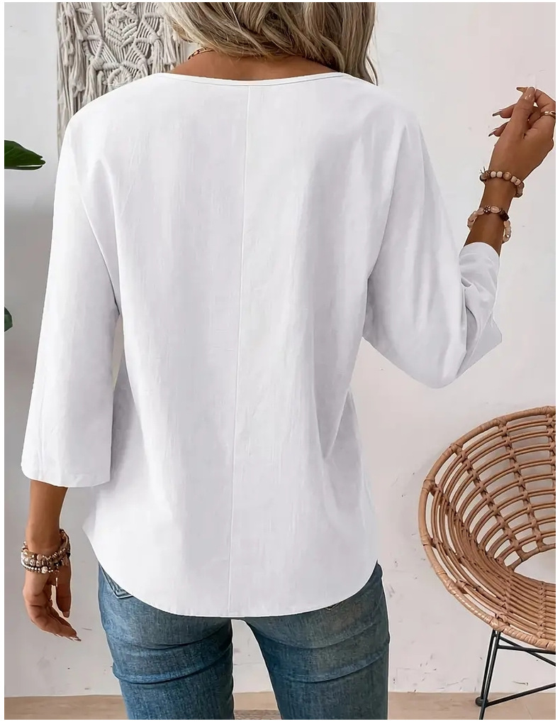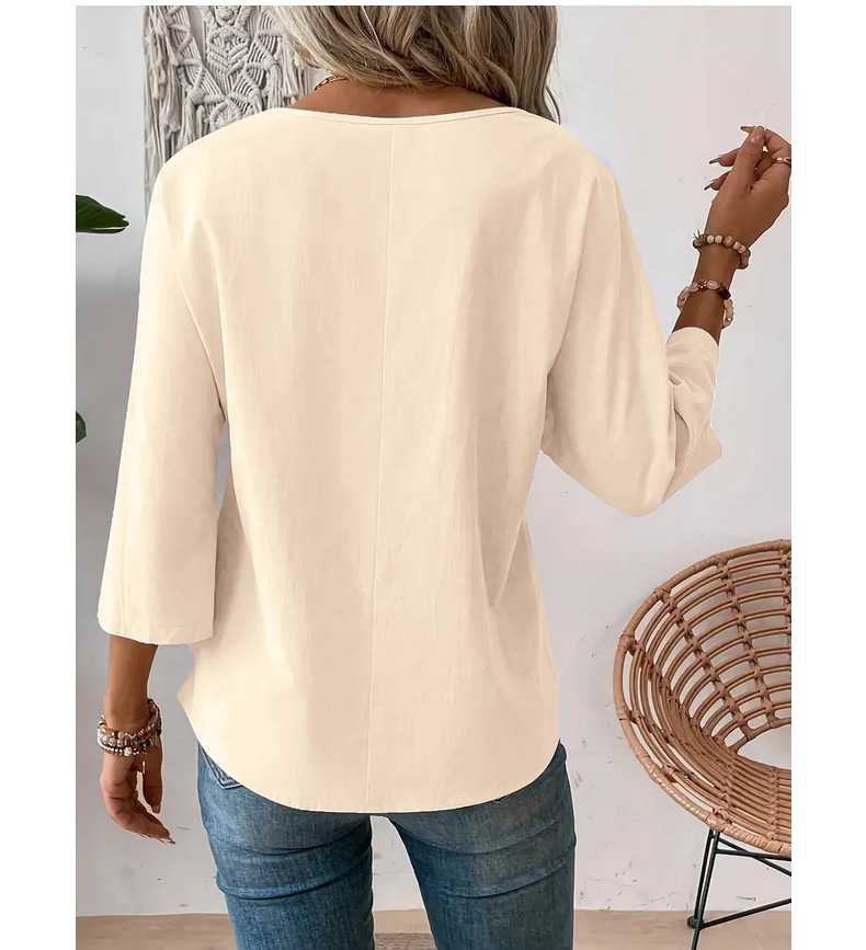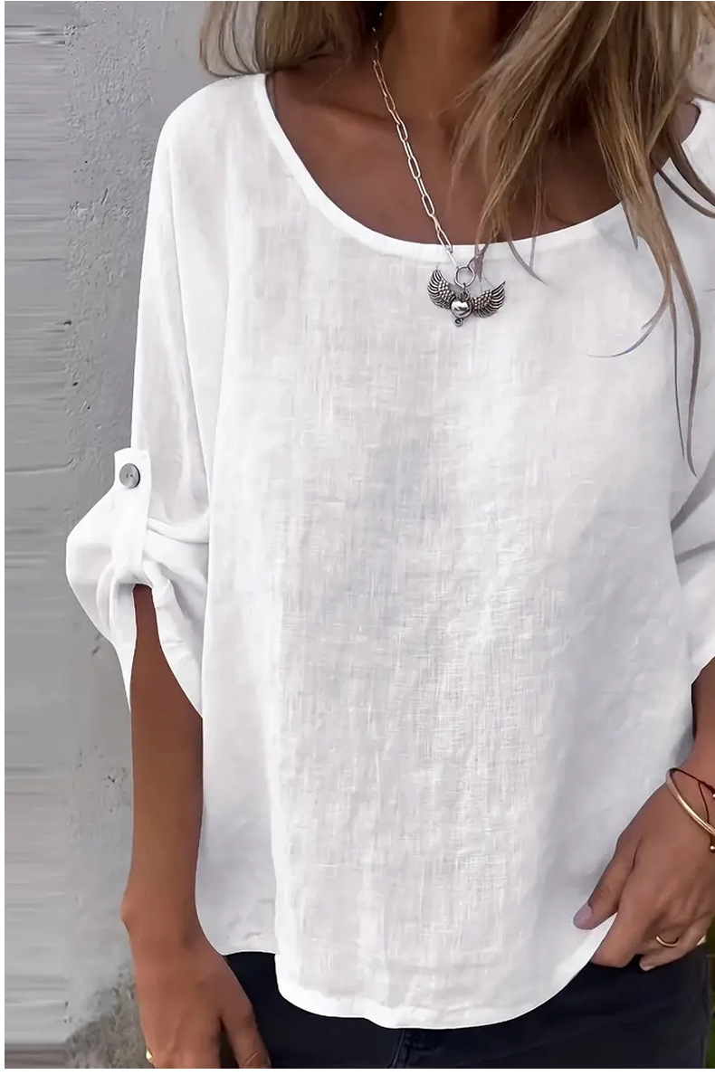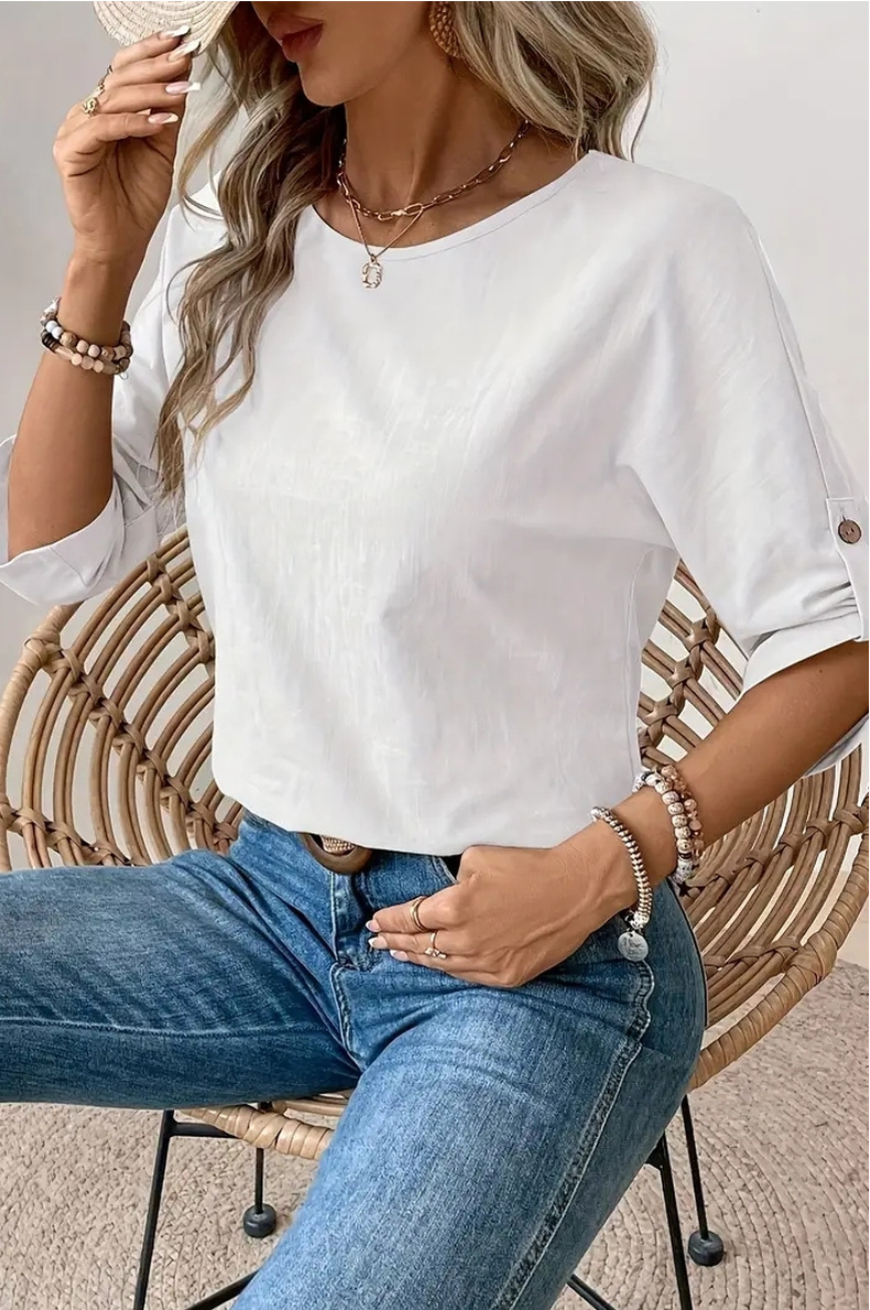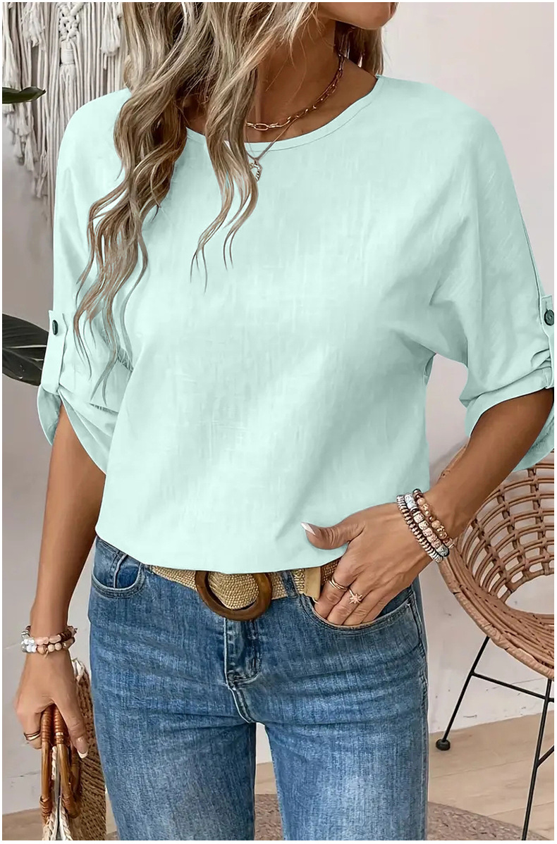 단색 라운드넥 셔츠, 캐주얼하고 패셔너블하며 심플한 디자인, 여성스러운 우아한 셔츠, 고급스러운 스타일, 캐주얼하고 다용도로 활용 가능