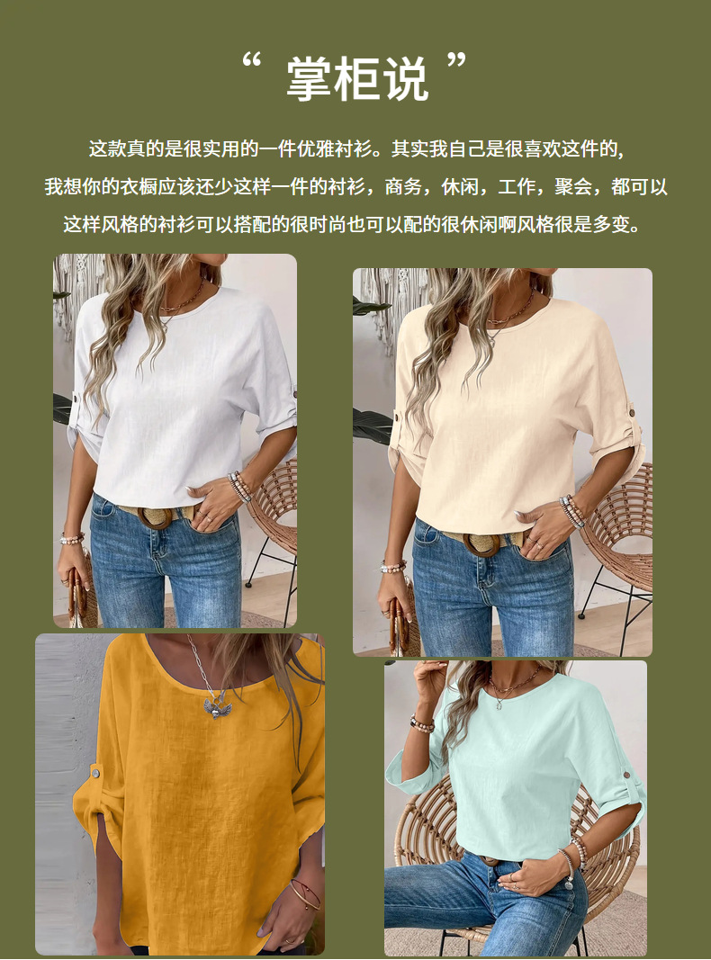 단색 라운드넥 셔츠, 캐주얼하고 패셔너블하며 심플한 디자인, 여성스러운 우아한 셔츠, 고급스러운 스타일, 캐주얼하고 다용도로 활용 가능스토어 가기
