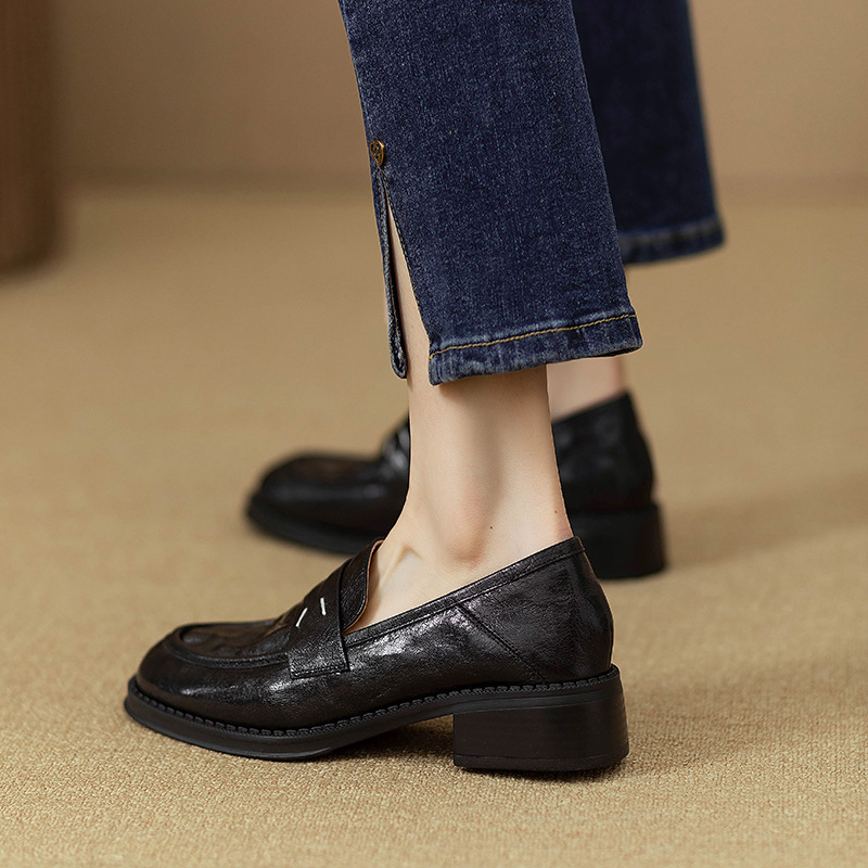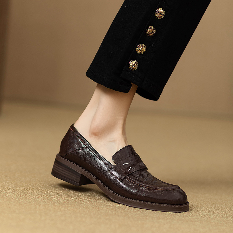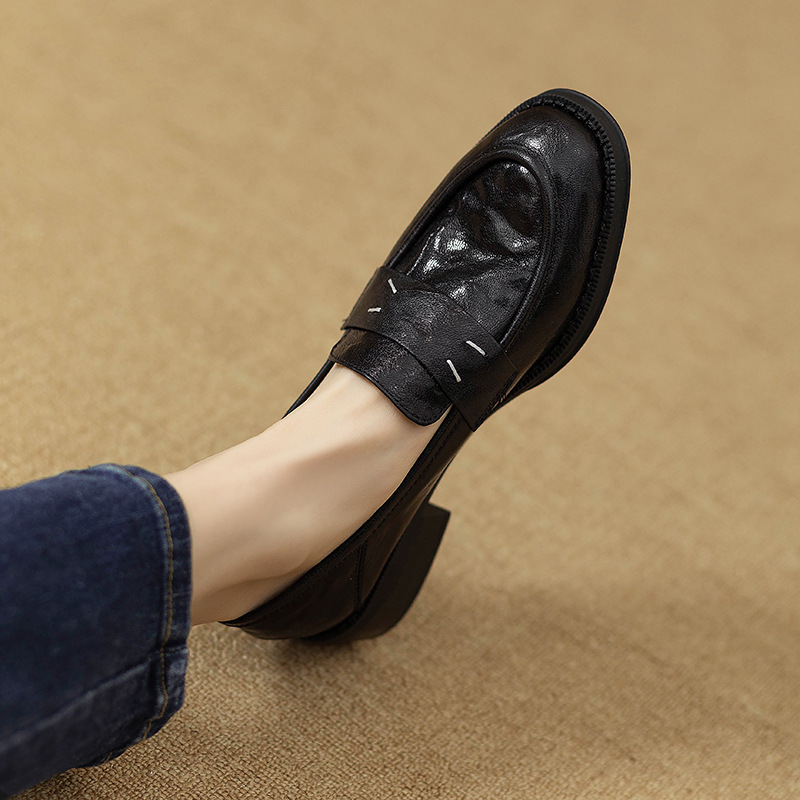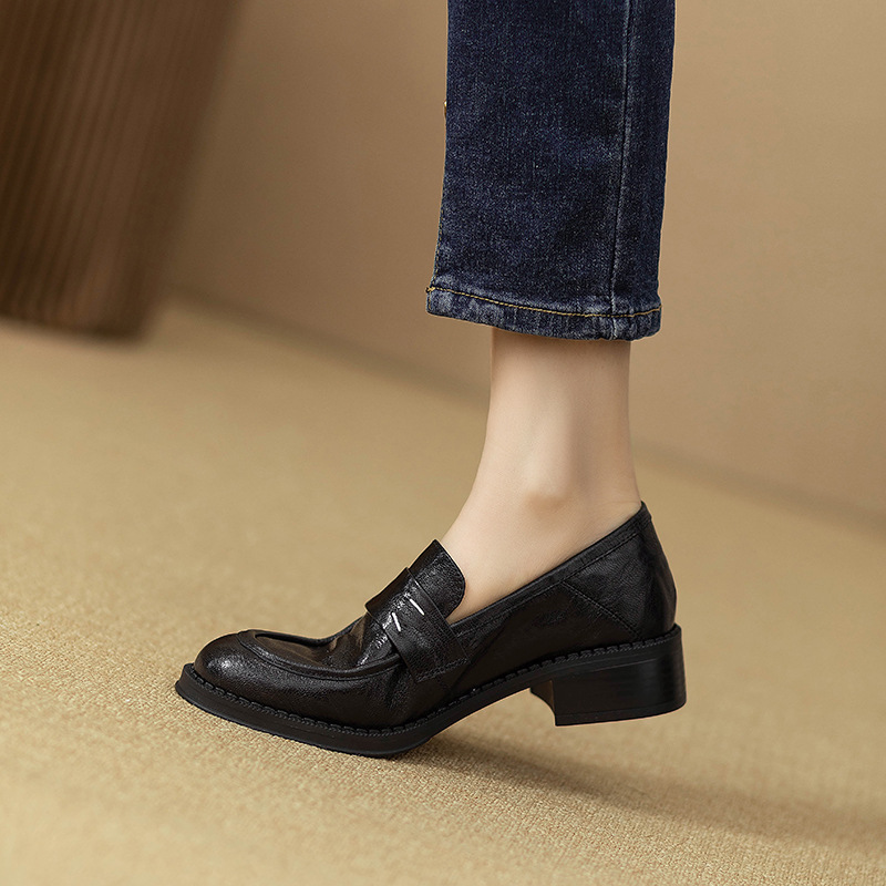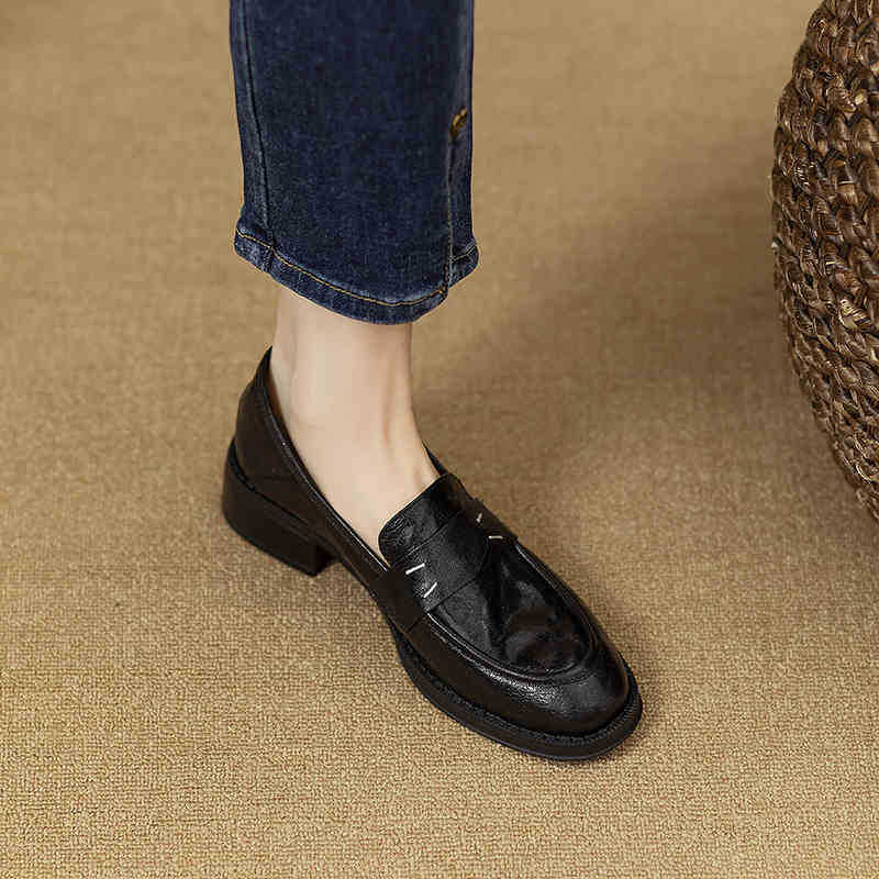 그레이트 소프트 프렌치 스타일 레트로 정품 가죽 라운드 토 로퍼 여성 영국 스타일 올 매치 소프트 하단 작은 가죽 신발 미드 힐 두꺼운 싱글 레이어 신발스토어 가기