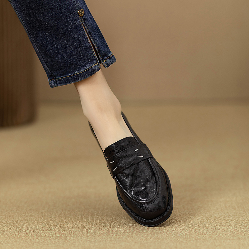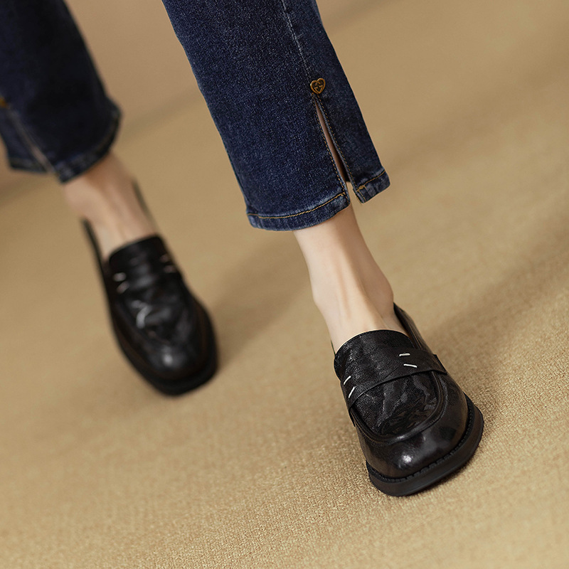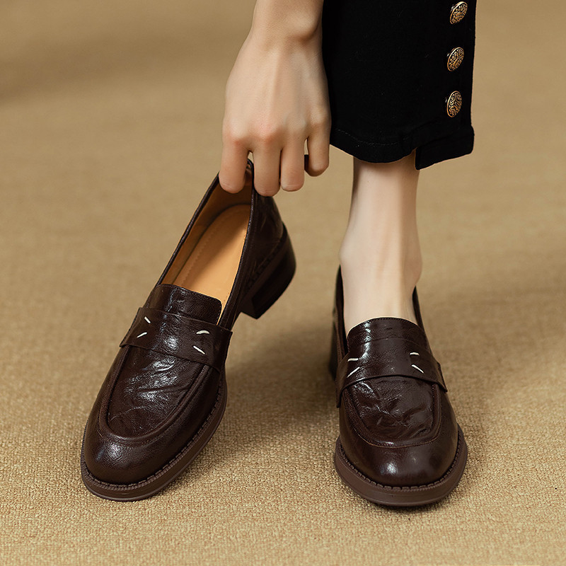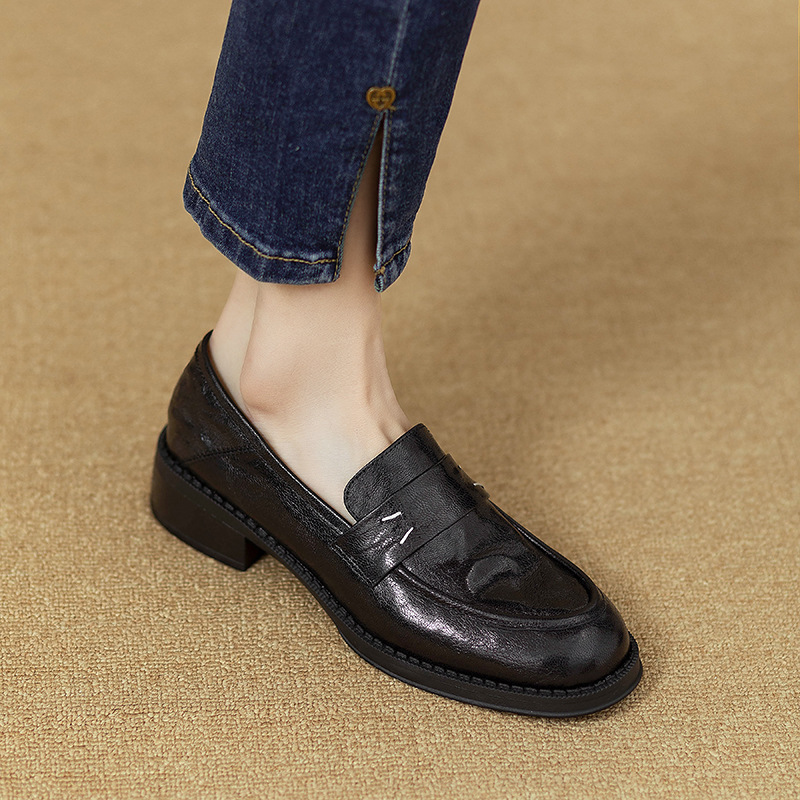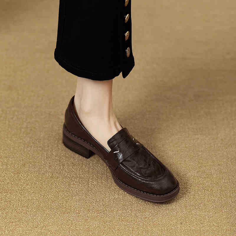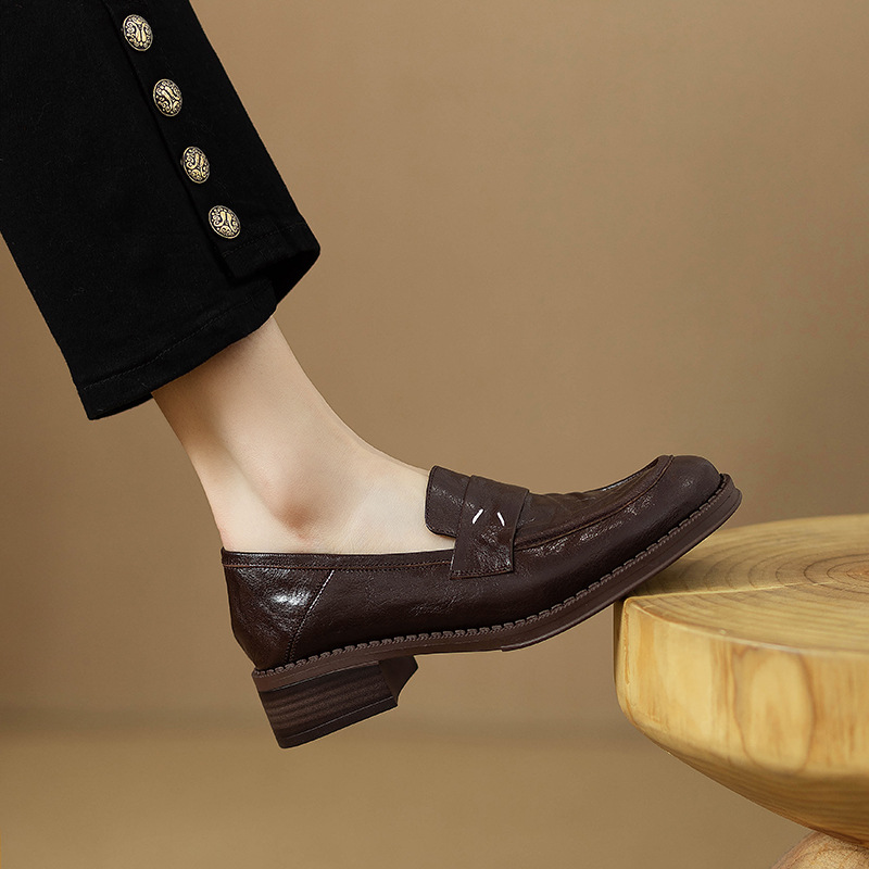 그레이트 소프트 프렌치 스타일 레트로 정품 가죽 라운드 토 로퍼 여성 영국 스타일 올 매치 소프트 하단 작은 가죽 신발 미드 힐 두꺼운 싱글 레이어 신발스토어 가기