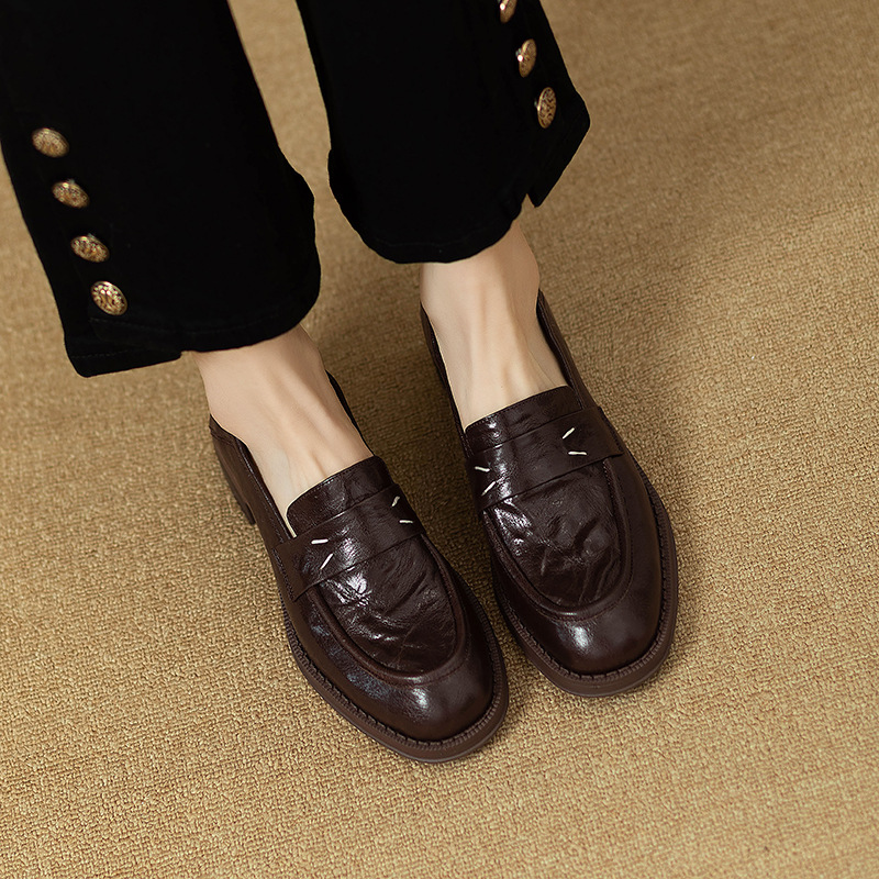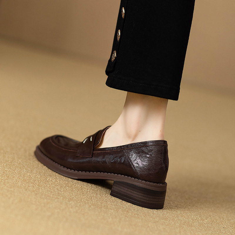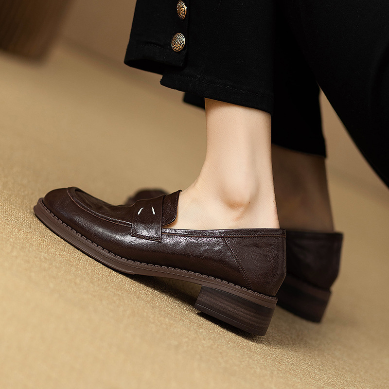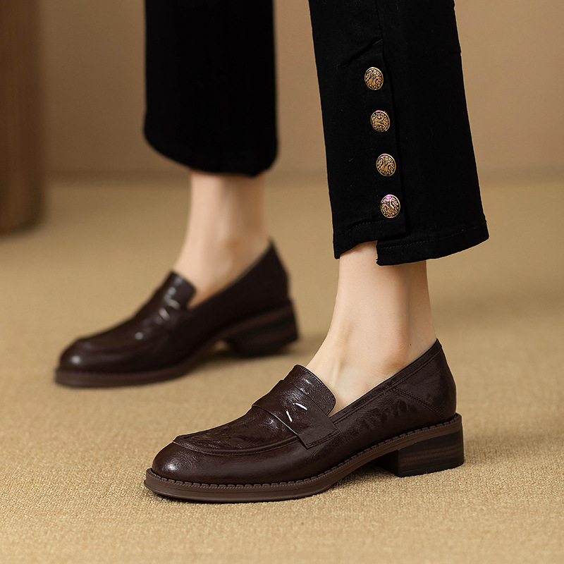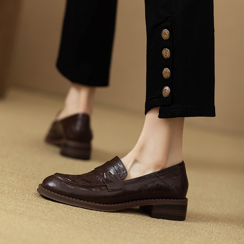 그레이트 소프트 프렌치 스타일 레트로 정품 가죽 라운드 토 로퍼 여성 영국 스타일 올 매치 소프트 하단 작은 가죽 신발 미드 힐 두꺼운 싱글 레이어 신발
